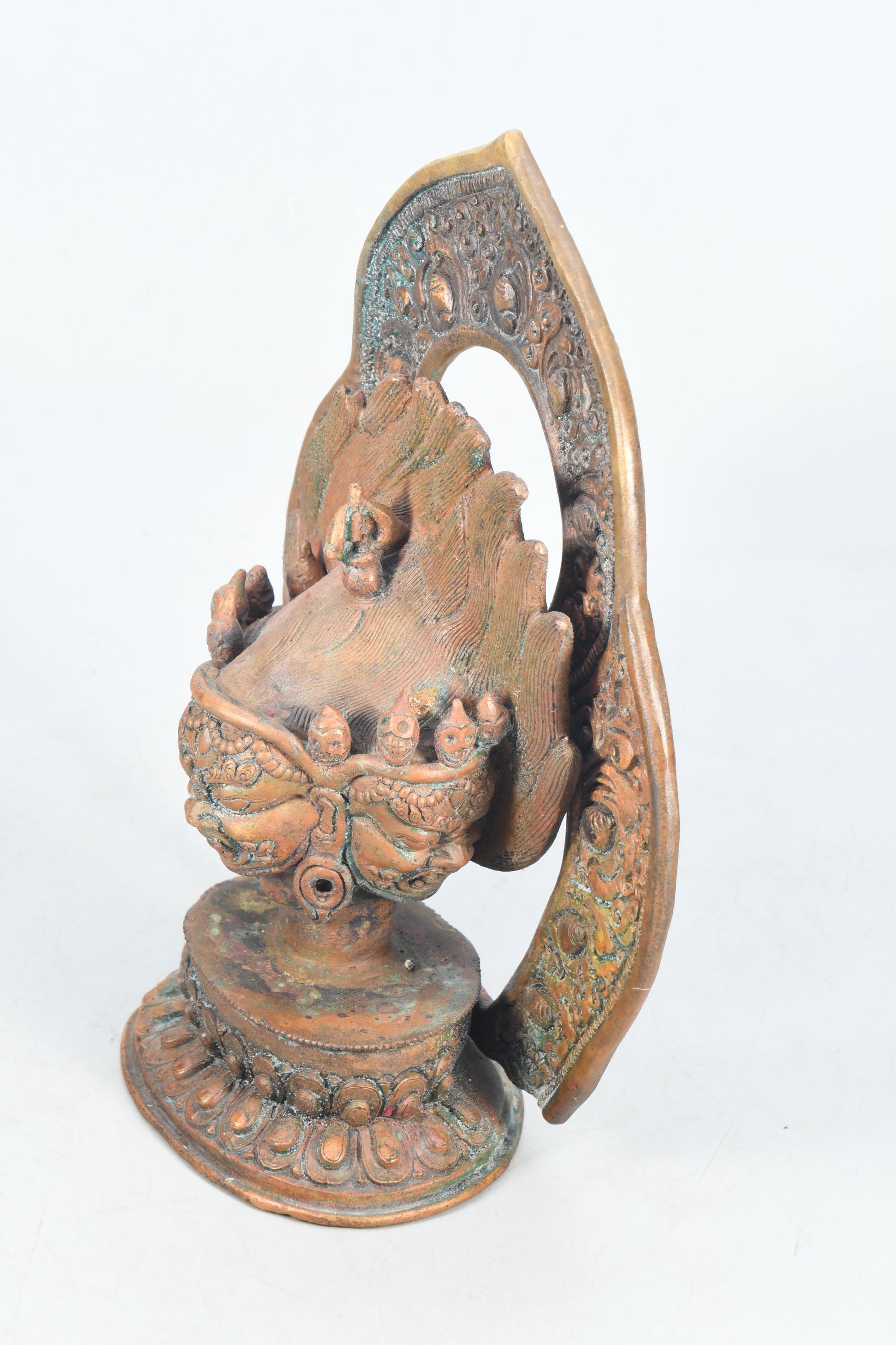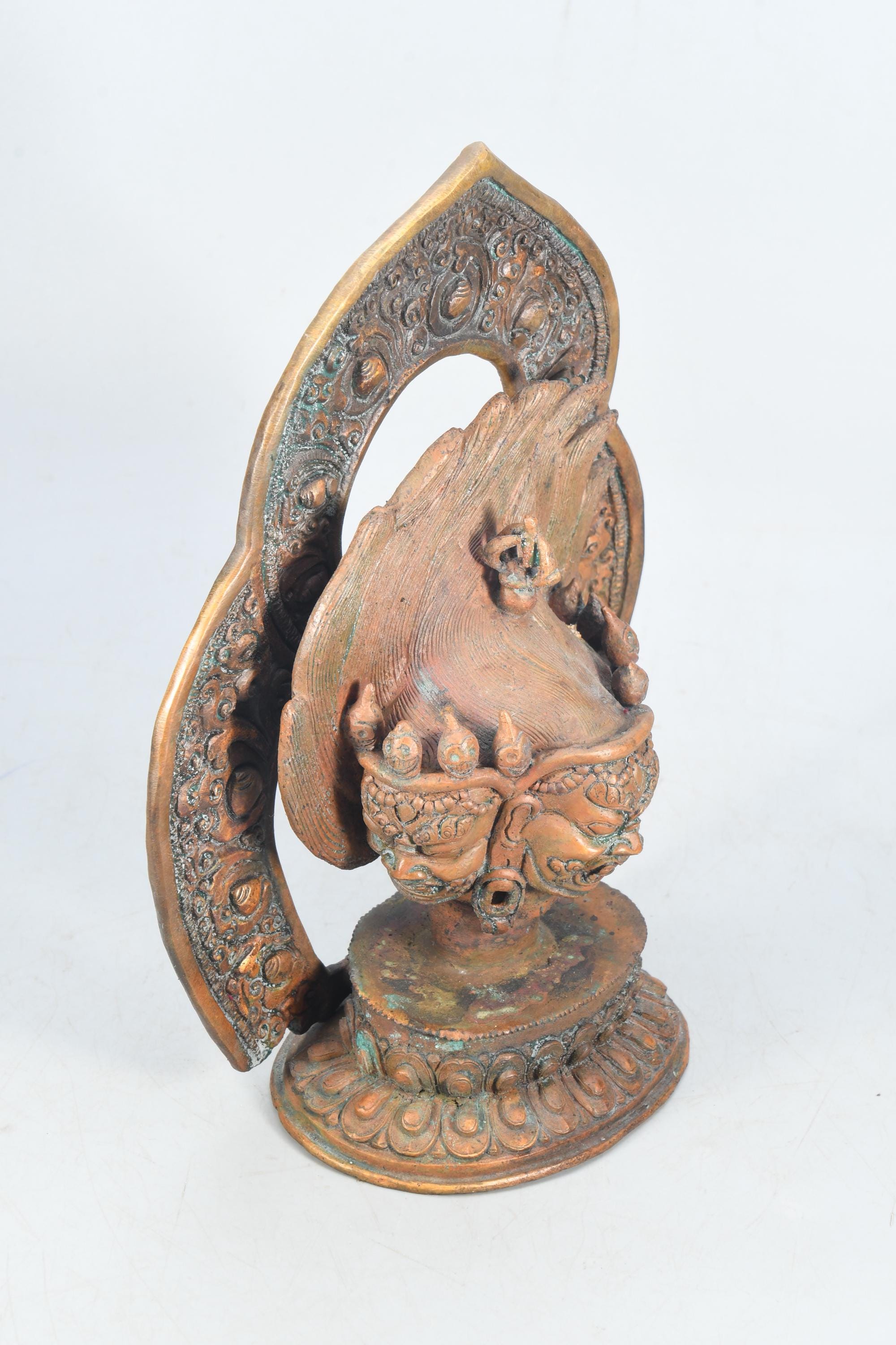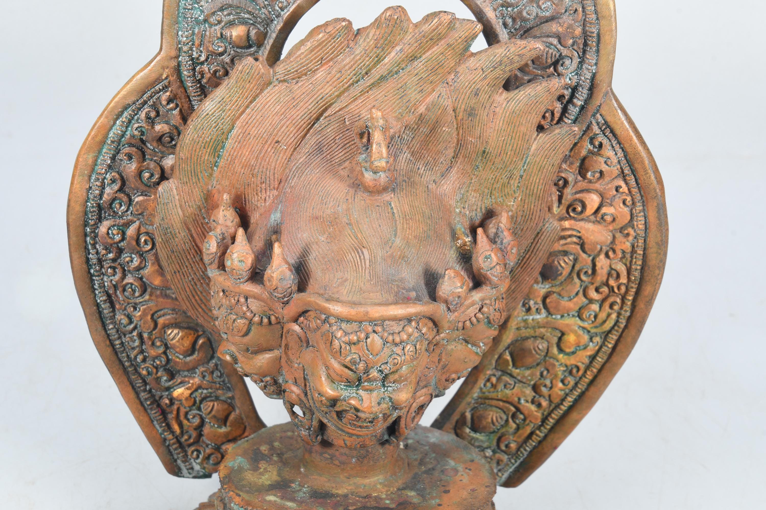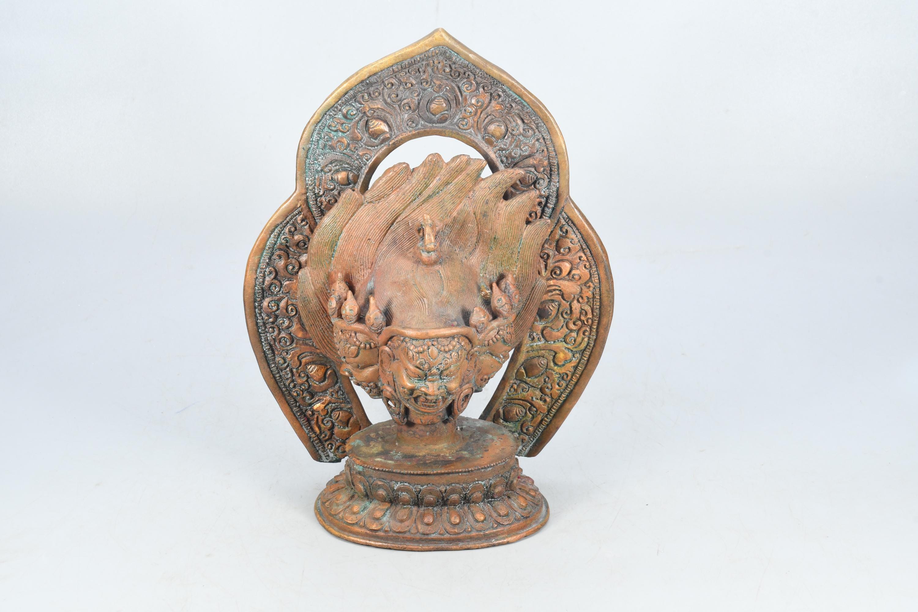 This particular form of Mahakala, with one face, two hands, holding a curved knife, a skull-cup at his heart and a khatvanga in the hollow of his left elbow, his two legs standing on a corpse, is of outstanding workmanship.