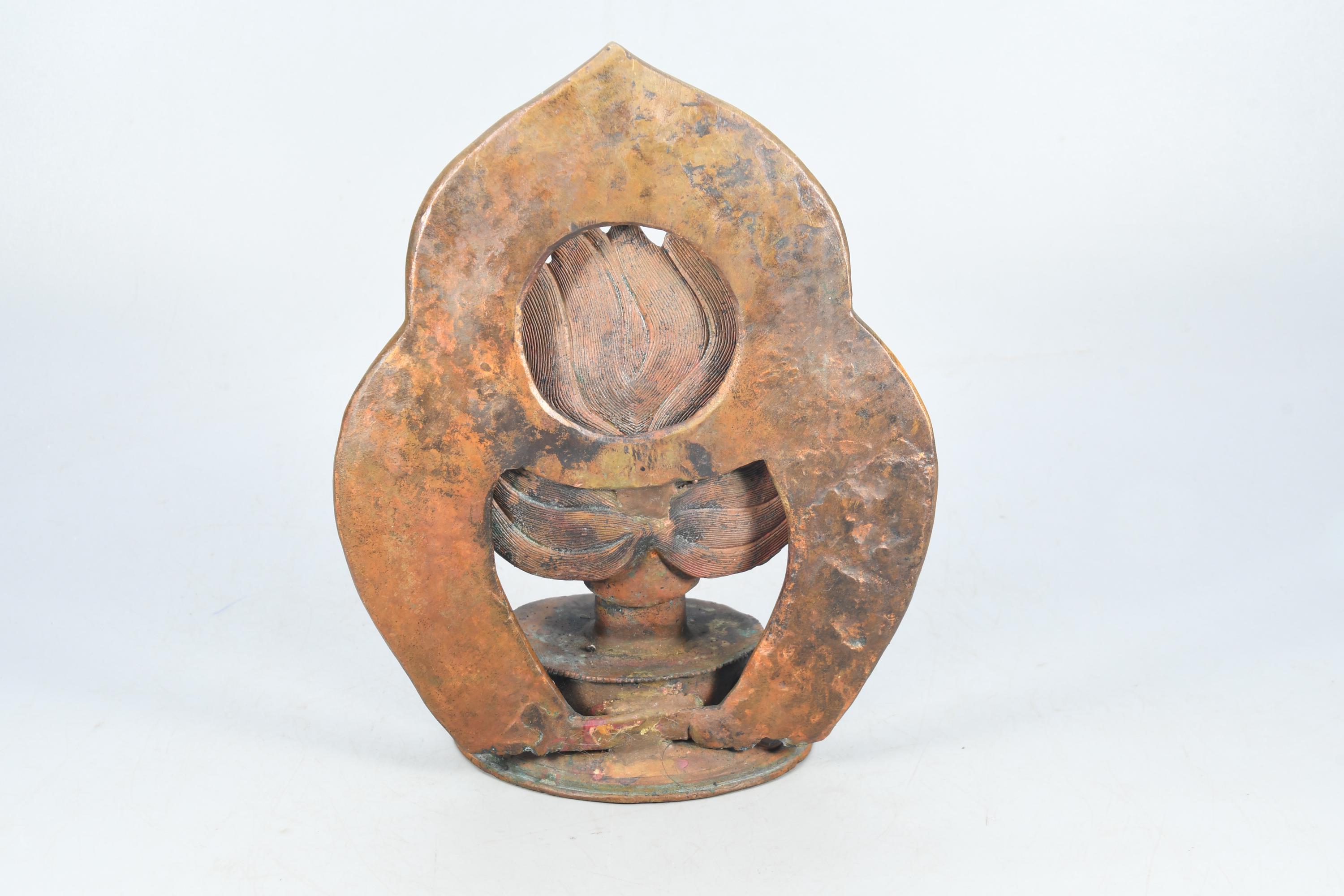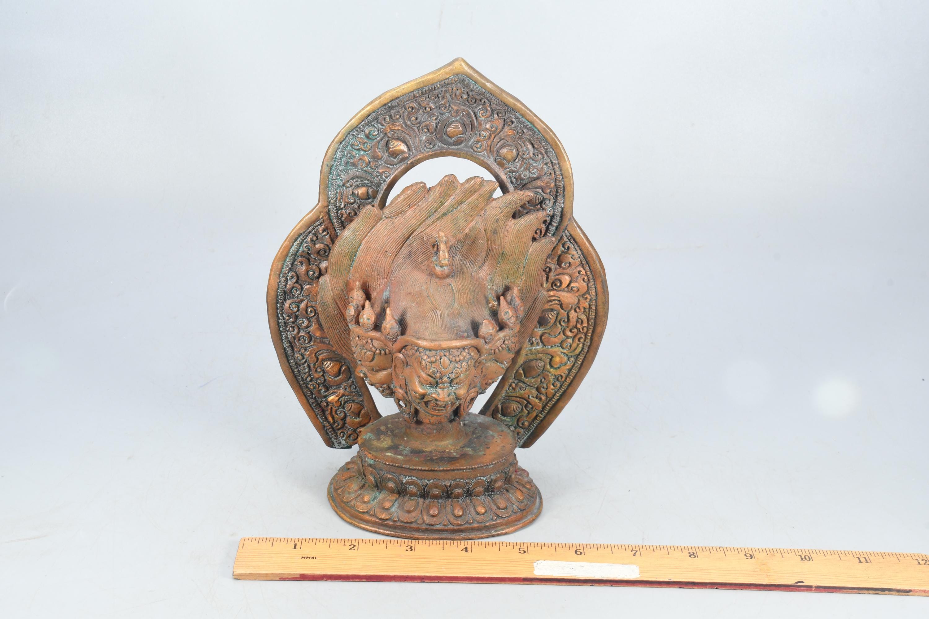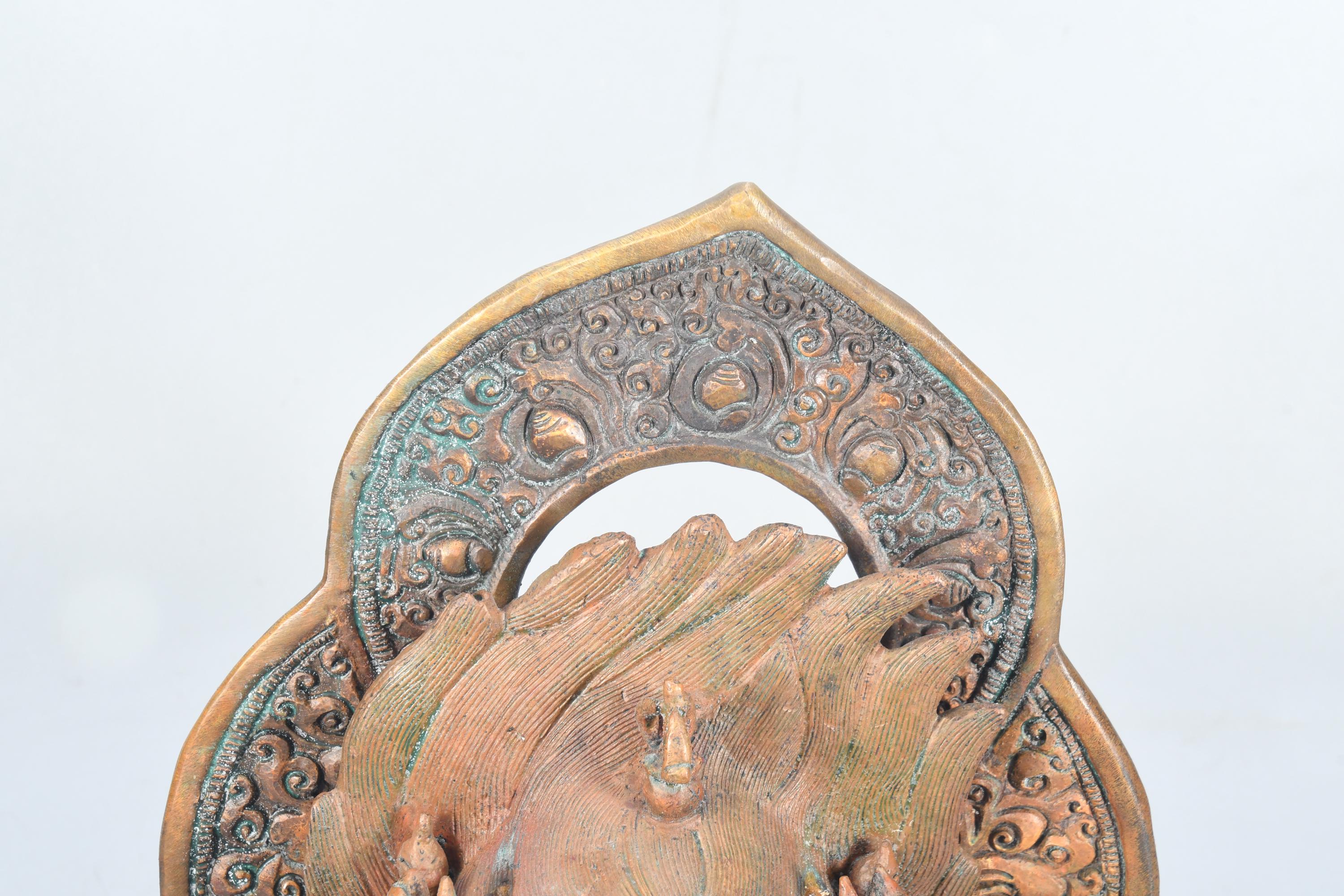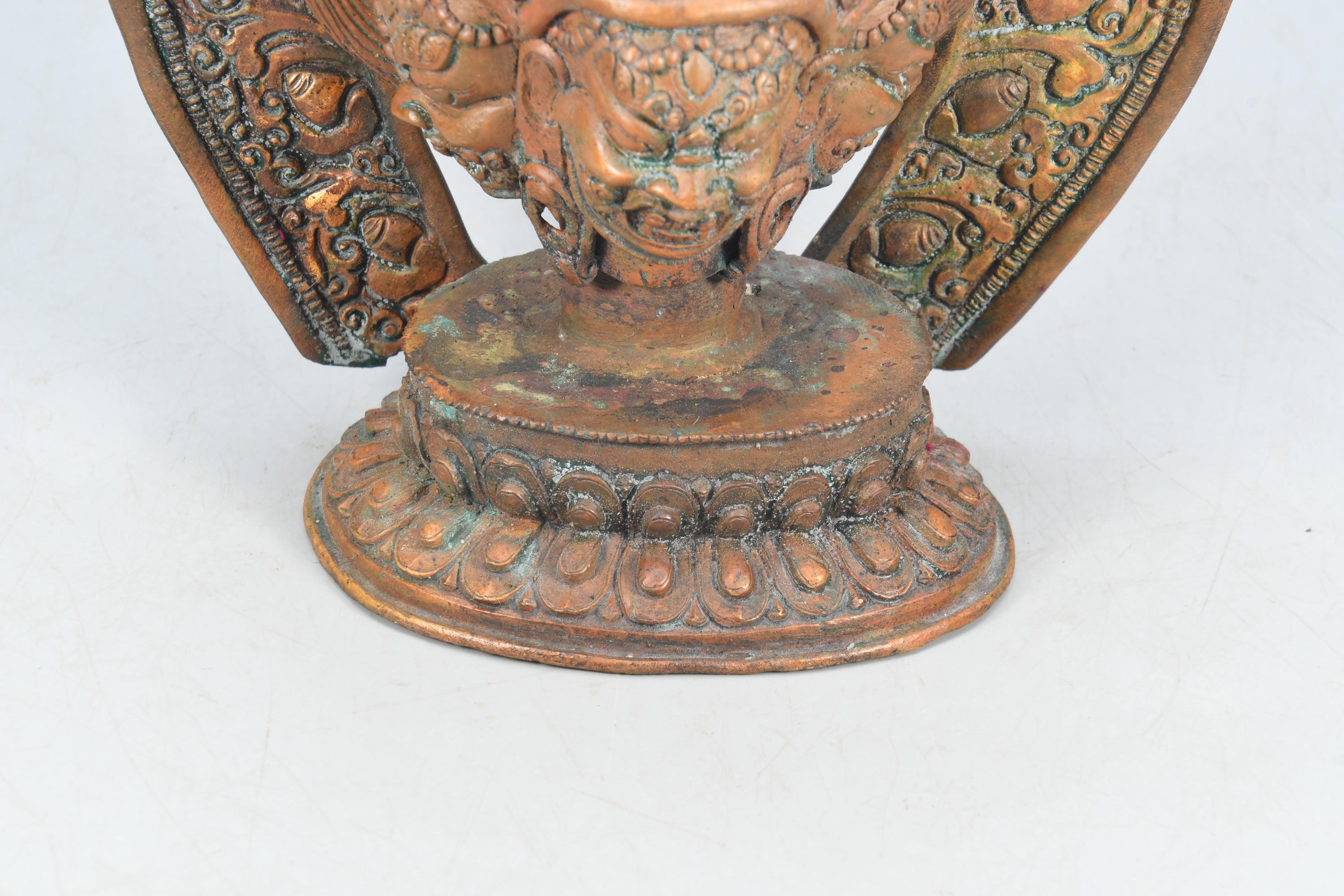 This particular form of Mahakala, with one face, two hands, holding a curved knife, a skull-cup at his heart and a khatvanga in the hollow of his left elbow, his two legs standing on a corpse, is of outstanding workmanship.