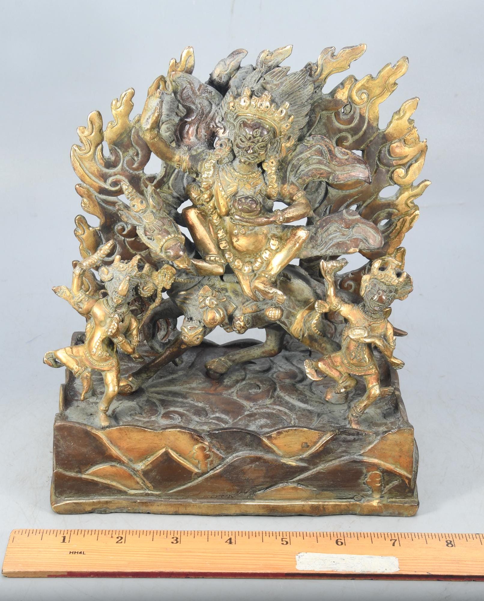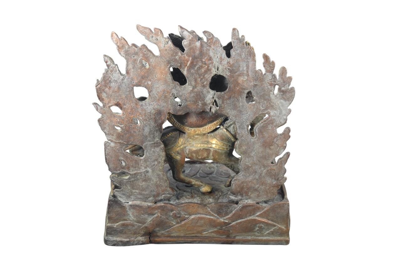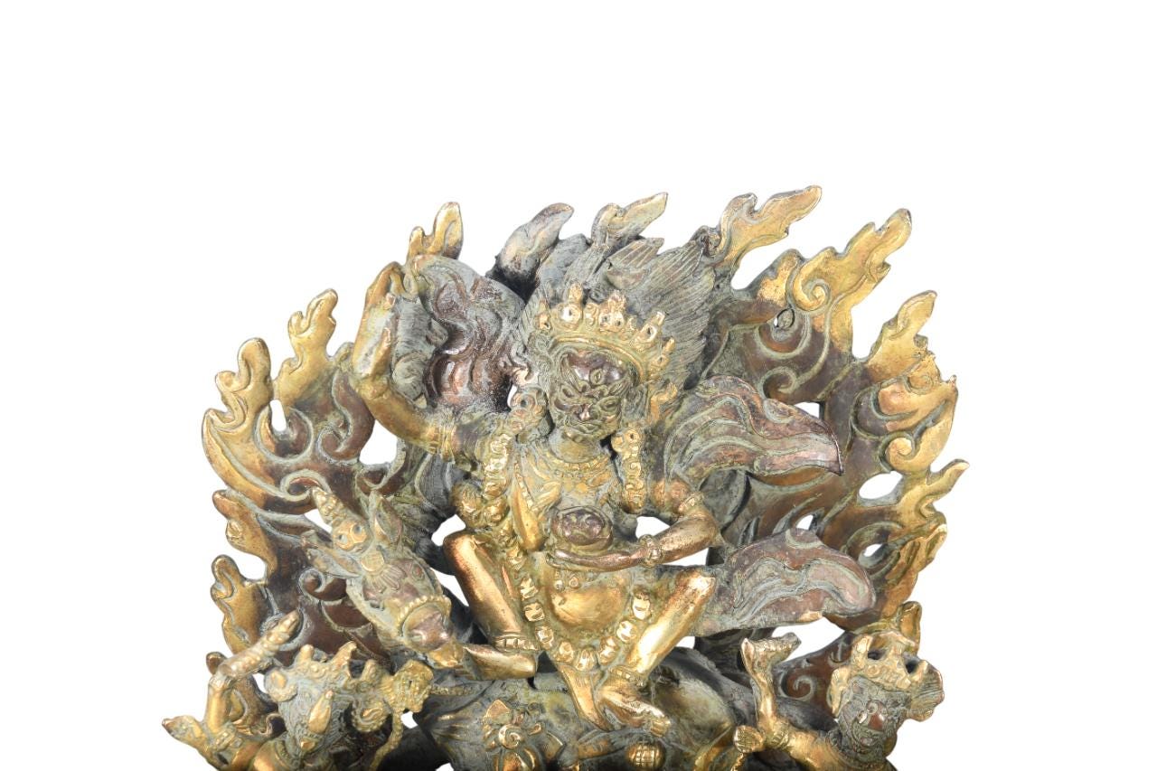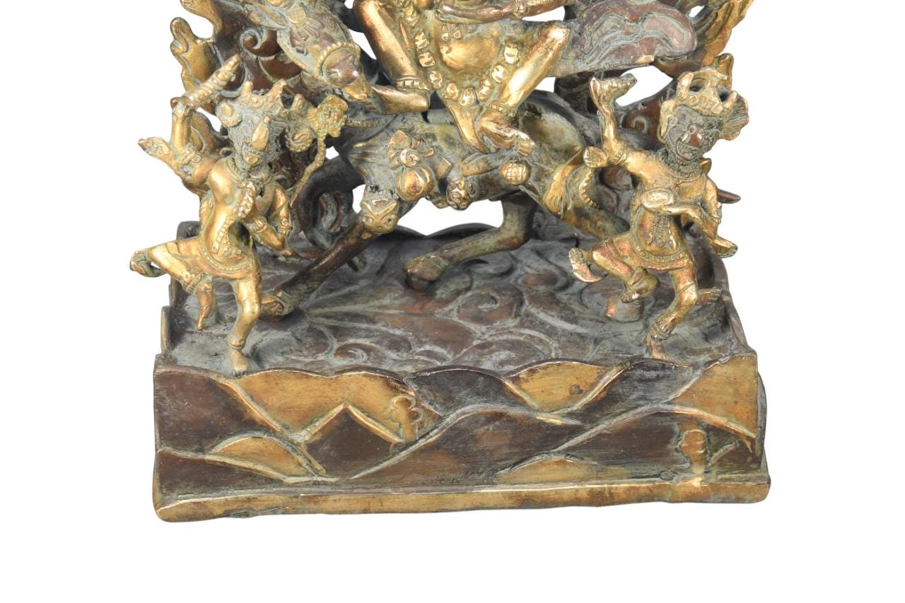 This particular form of Mahakala, with one face, two hands, holding a curved knife, a skull-cup at his heart and a khatvanga in the hollow of his left elbow, his two legs standing on a corpse, is of outstanding workmanship.