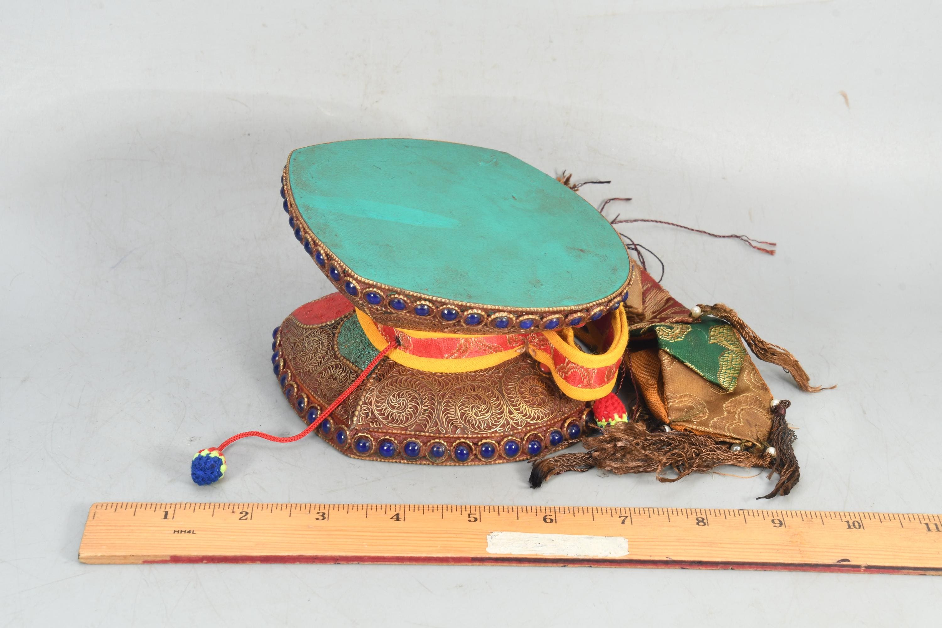 This is an beautiful used antique handcrafted damaru it has been previously used there are some marks of it. This Tibetan damaru is perfect in tune and design.In the Tibetan Buddhist tradition, the Damaru is part of a collection of sacred implements and musical instruments. This Damaru was adopted from the tantric practices of ancient India. The pitch of the drum varies, and the tone may vary depending on conditions of dampness, temperature and so on. Played slowly, and methodically, the droning of the damaru accompanies the haunting melodies and chants of the chod ritual, as of which are accompaniments for the inner meditations and visualizations that are at the heart of this spiritual practice.
