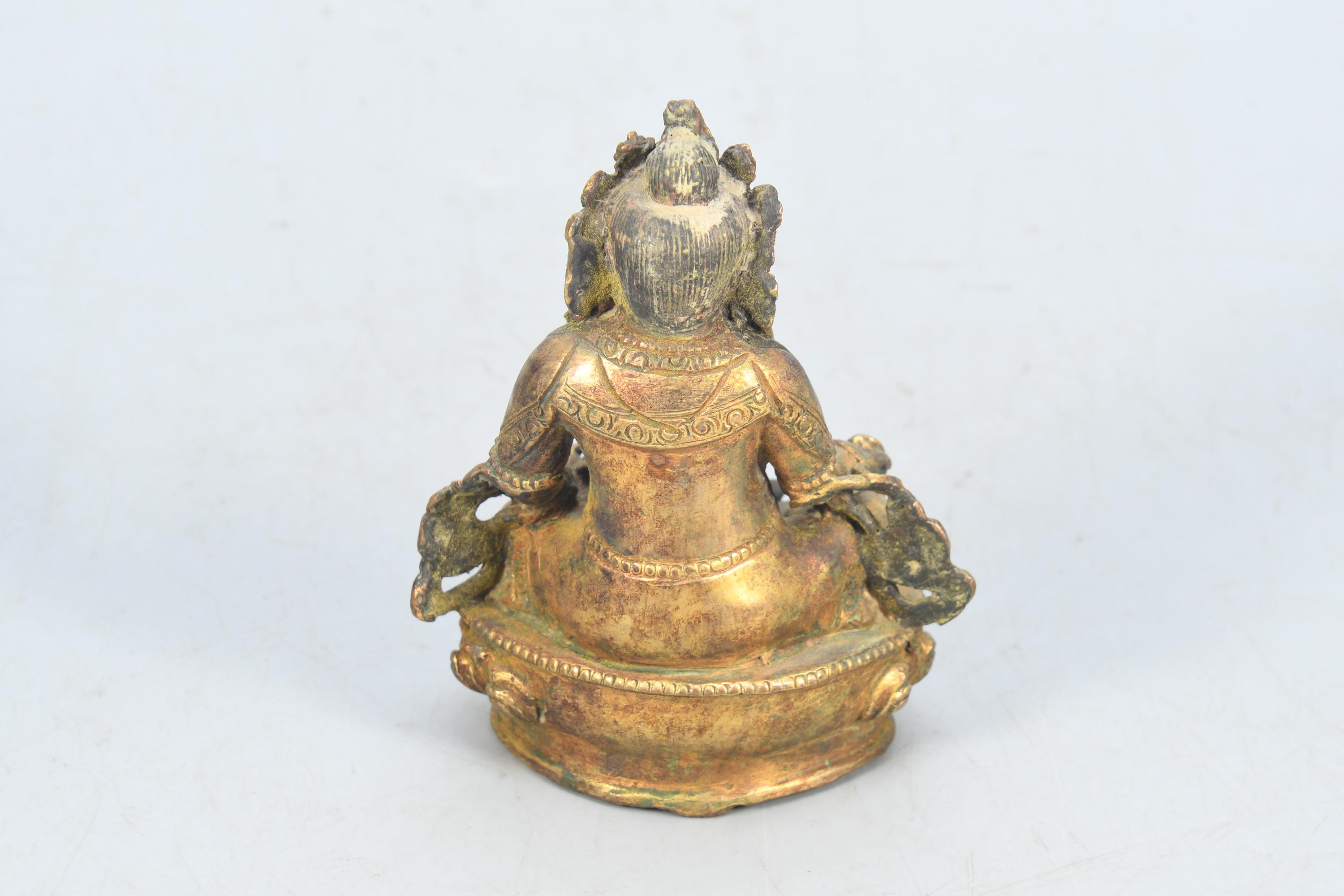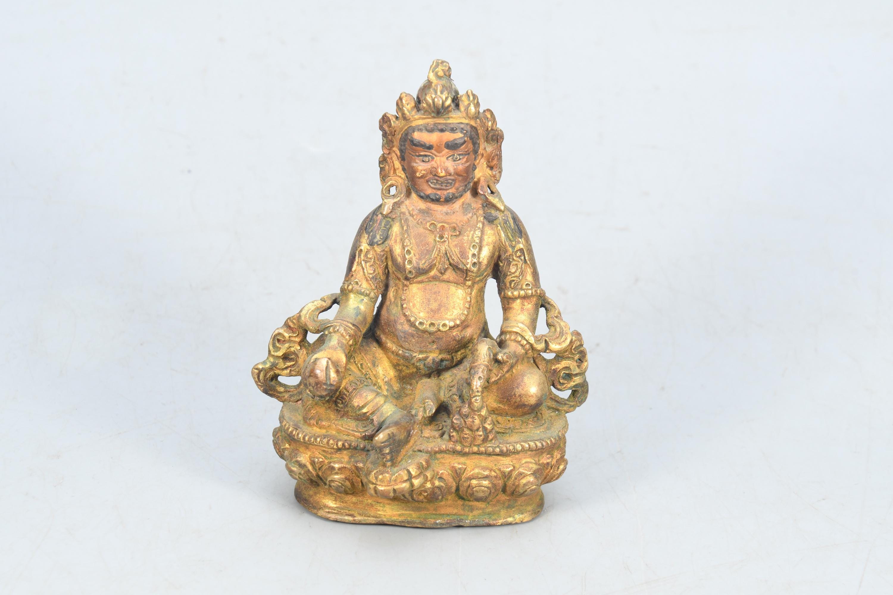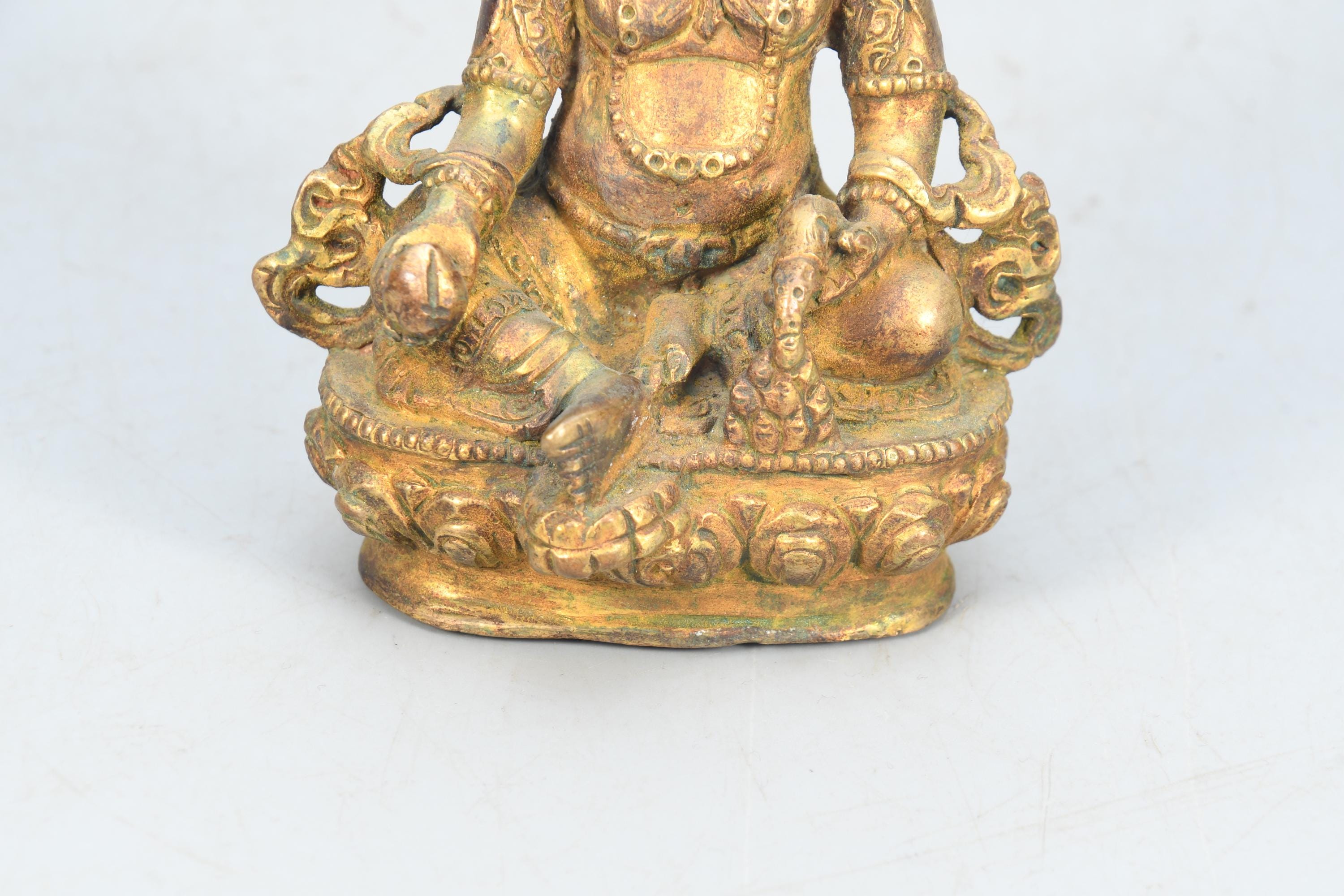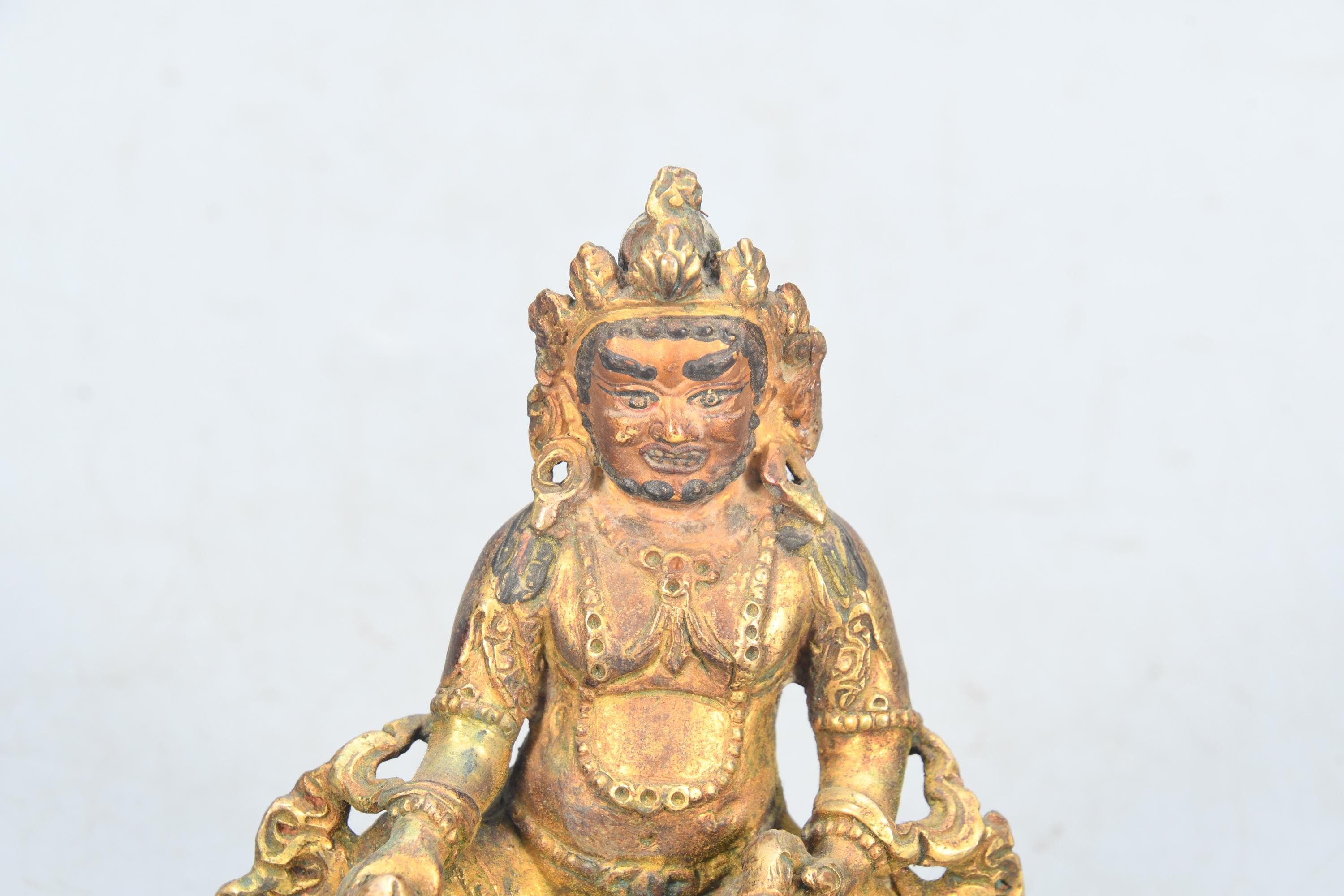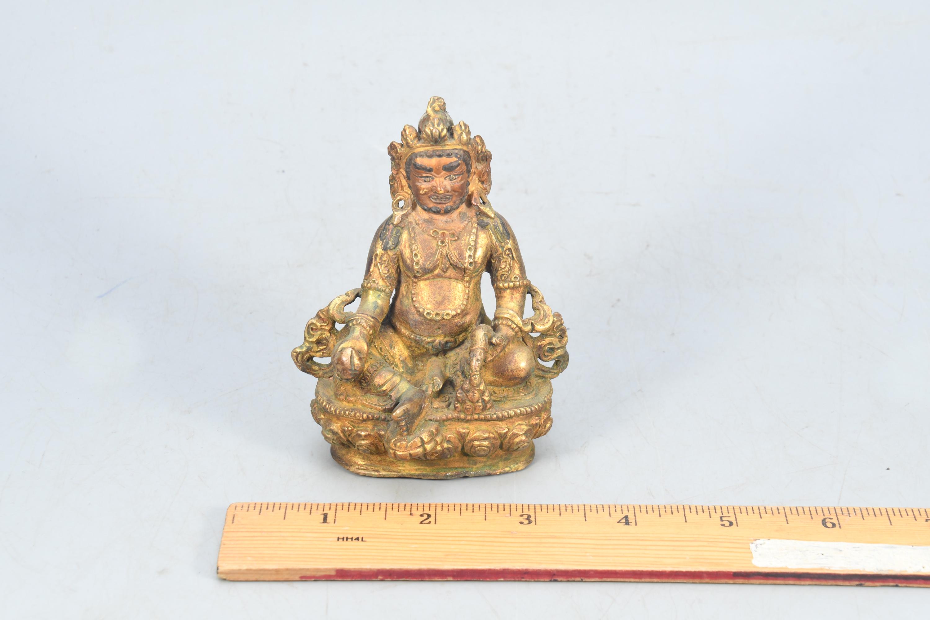 In this representation, Jambhala, like Kubera, appears slightly obese and dwarfish. Kubera began as a demonic figure, who controlled the sources of gold and jewels in the Himalaya mountains. When he came to be worshipped as a god of prosperity and good fortune, he still retained the earlier grotesque demonic features. Jambhala is shown with his foot on money pots and holding the Nakula, or mongoose who spits out jewels. The assimilation of this god to Buddhism is indicated by the eight-fold emanation of Jambhala overhead, surmounted by Shakyamuni, the historical Buddha. The god is richly clothed and ornamented with jewelry. Although these worldly features seem at odds with Buddhist detachment from the world, they are common in images dealing with the mundane world. The figure of the donor on the base also refers to the human sphere.