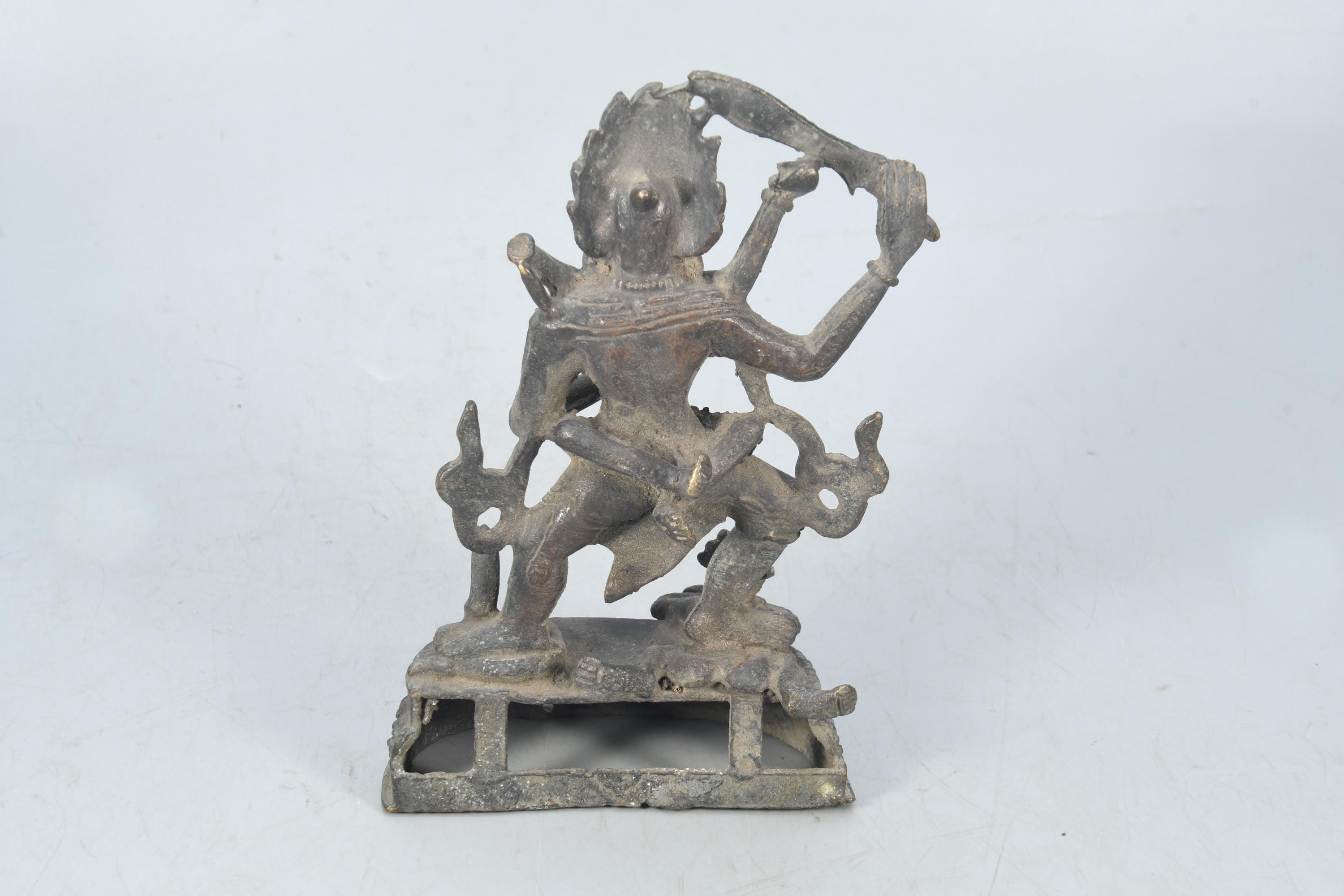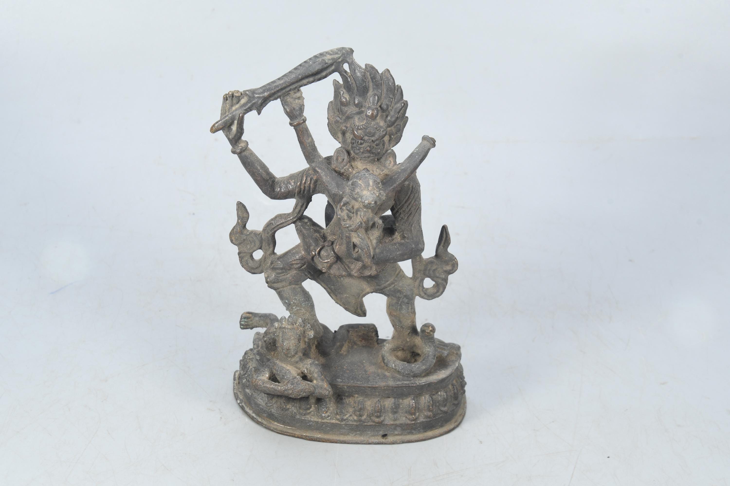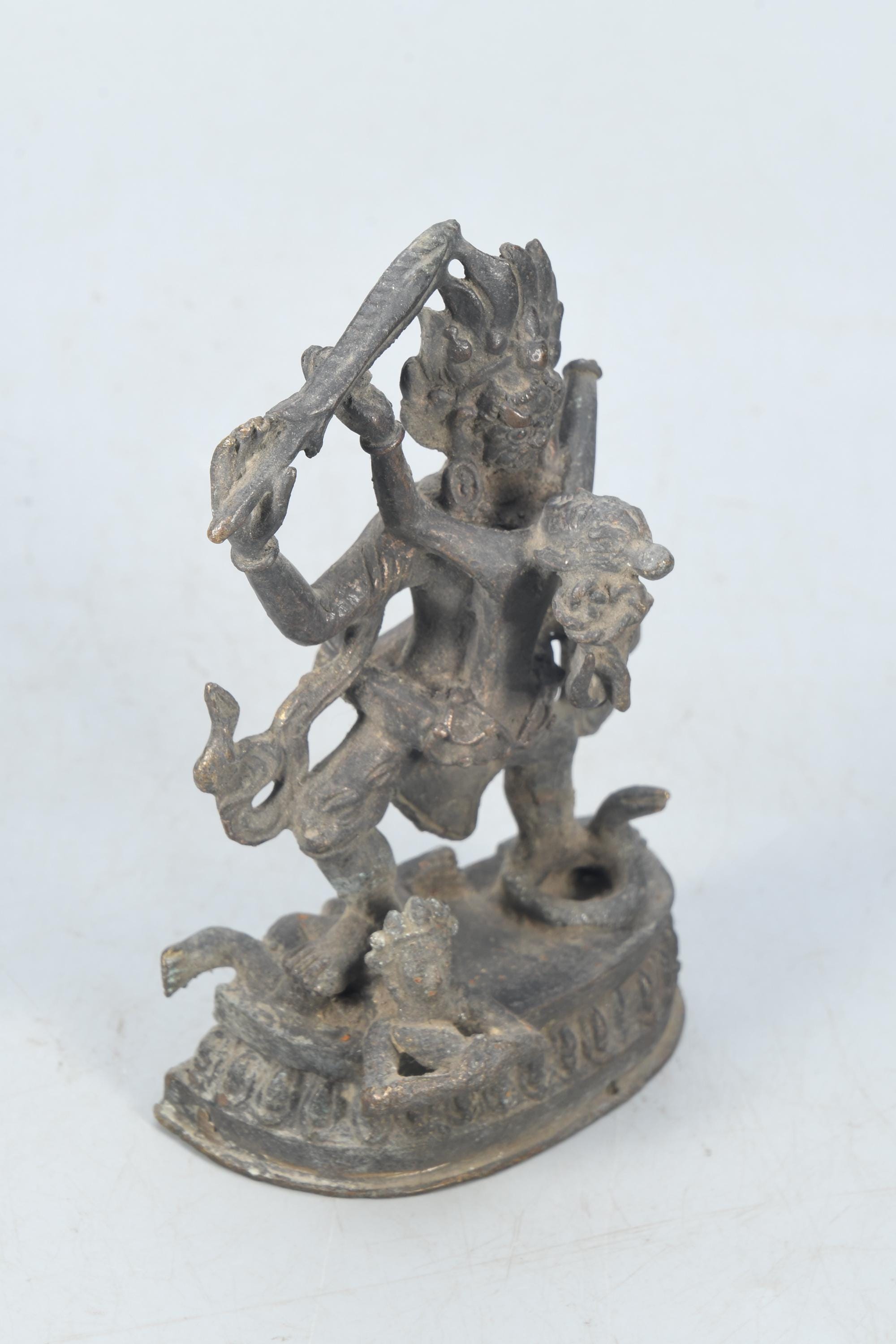 This particular form of Mahakala, with one face, two hands, holding a curved knife, a skull-cup at his heart and a khatvanga in the hollow of his left elbow, his two legs standing on a corpse, is of outstanding workmanship.