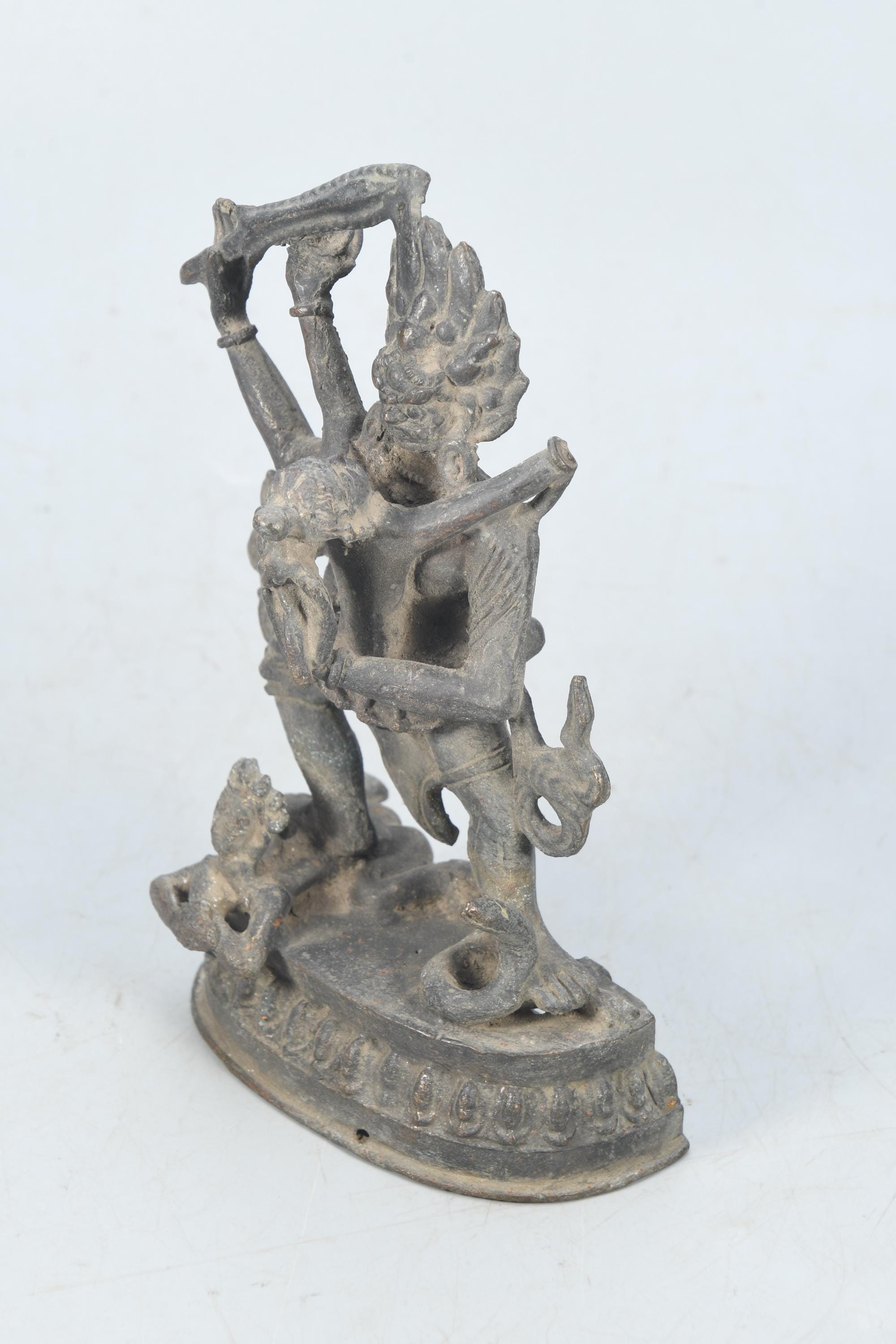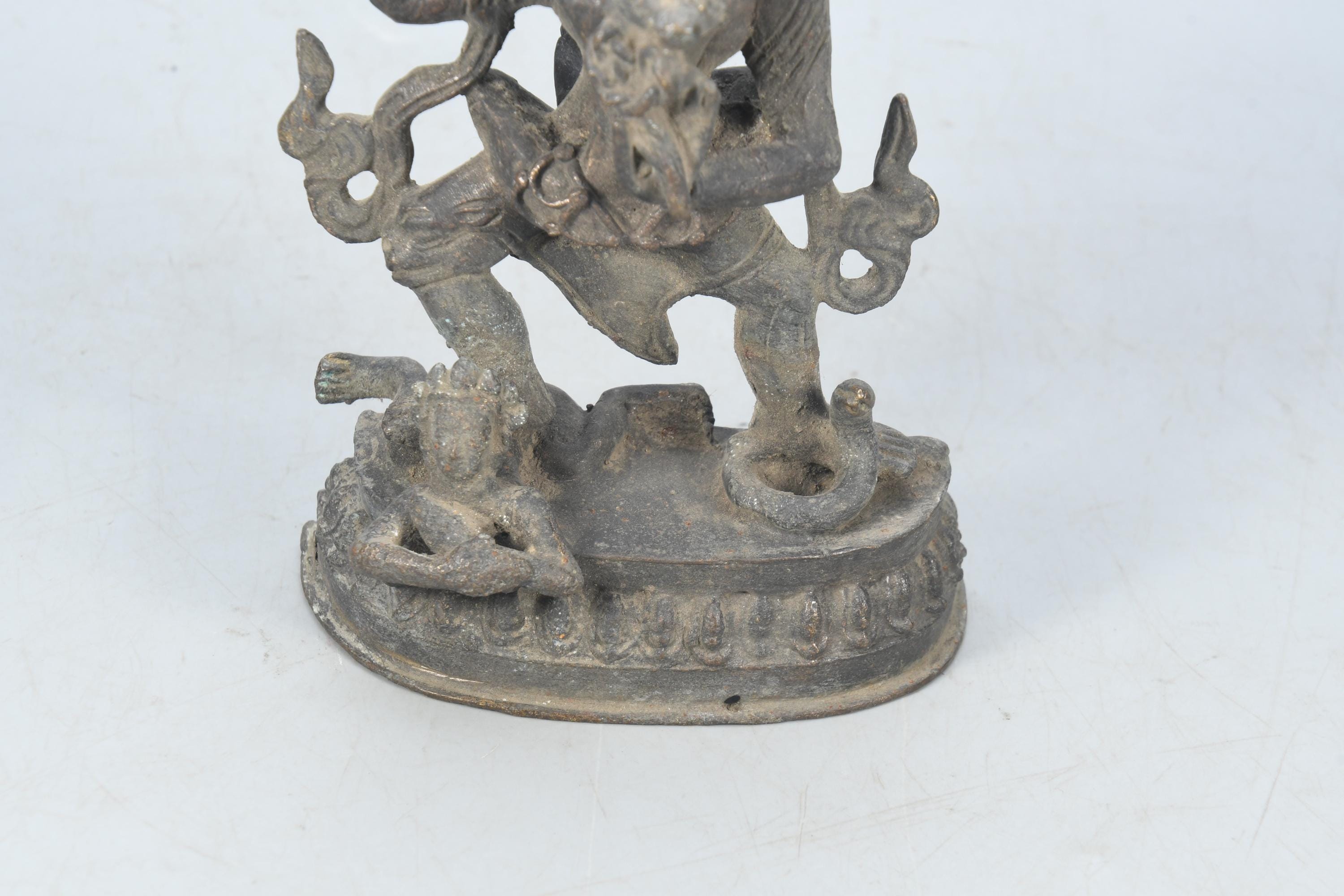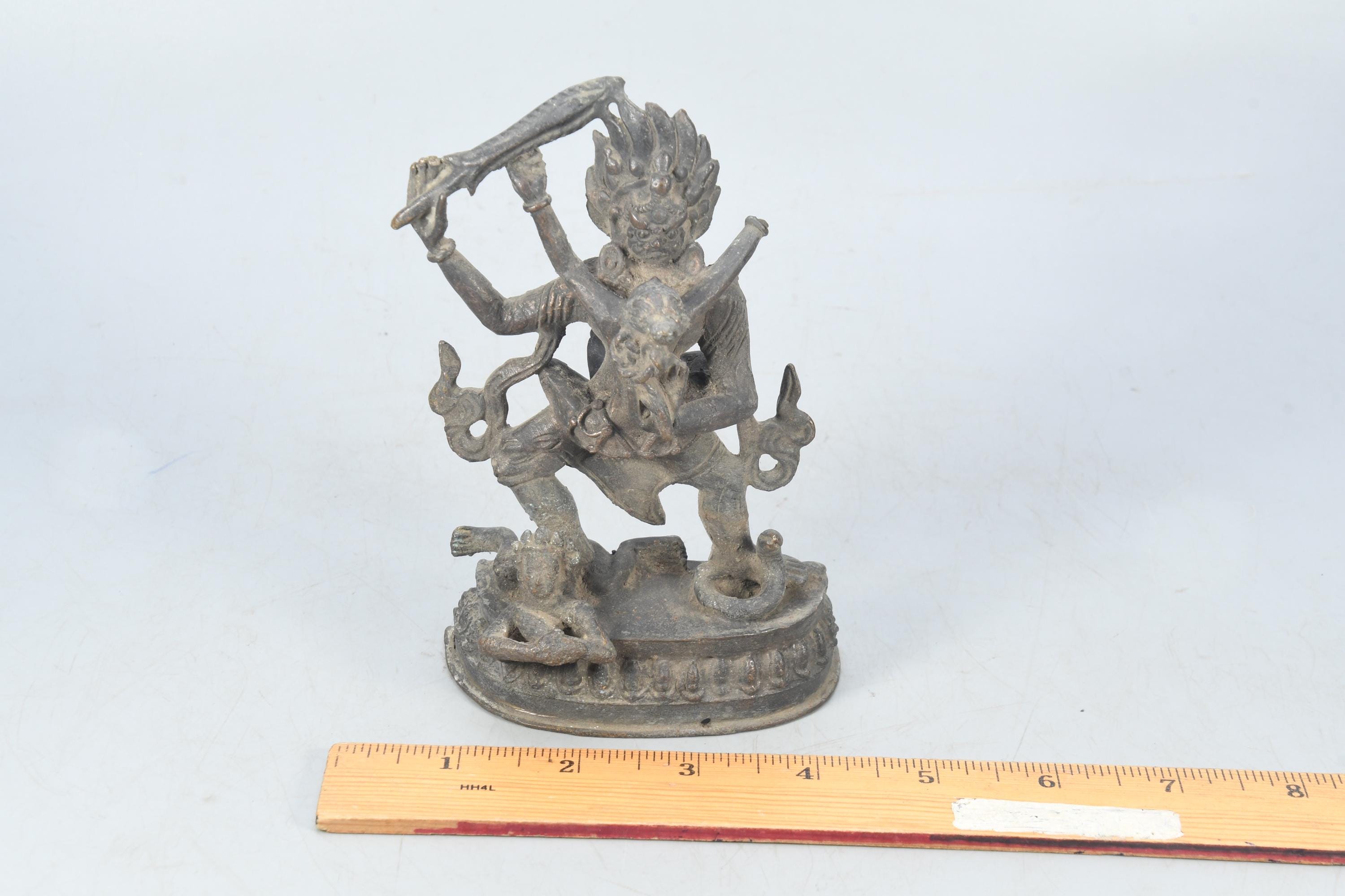 This particular form of Mahakala, with one face, two hands, holding a curved knife, a skull-cup at his heart and a khatvanga in the hollow of his left elbow, his two legs standing on a corpse, is of outstanding workmanship.