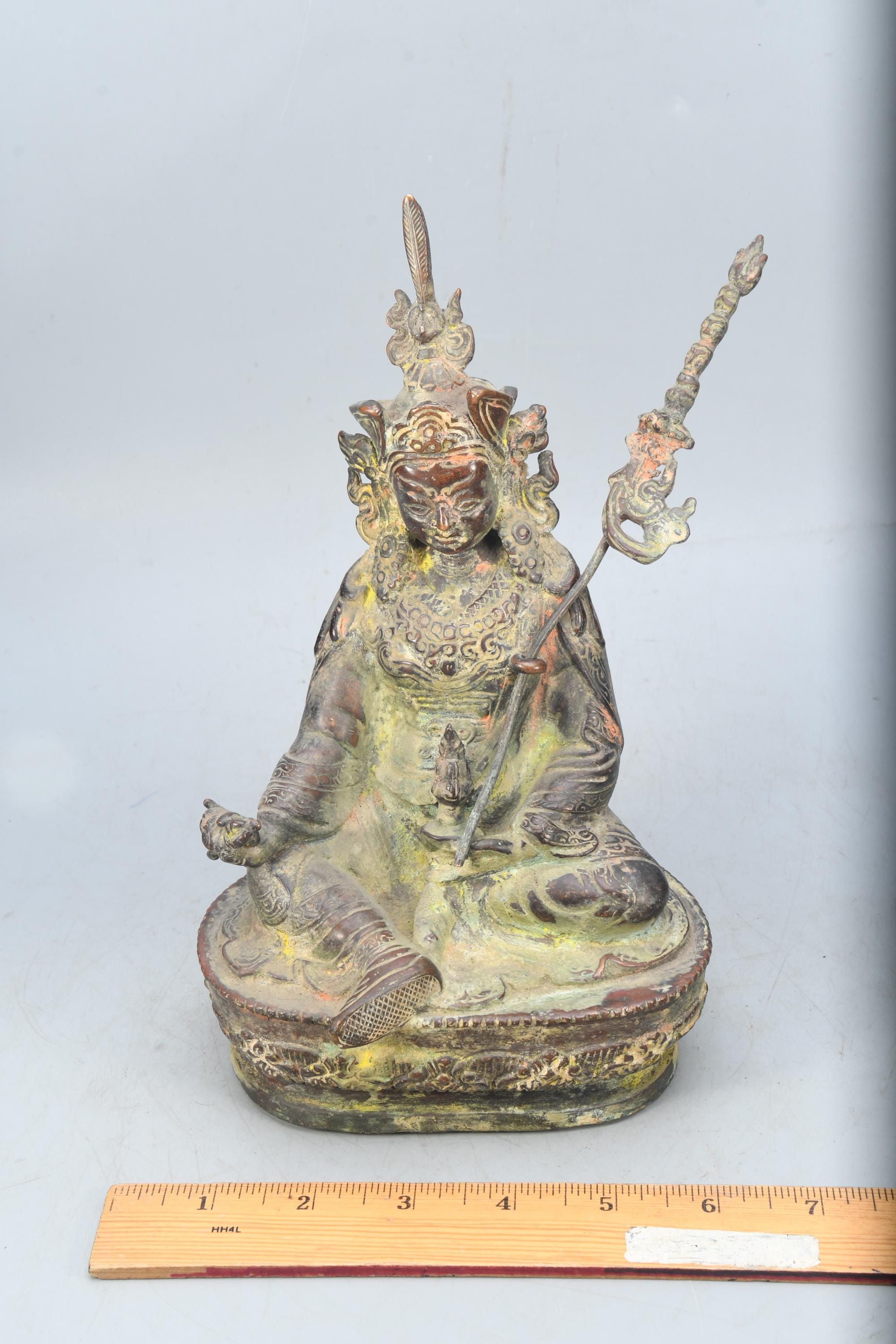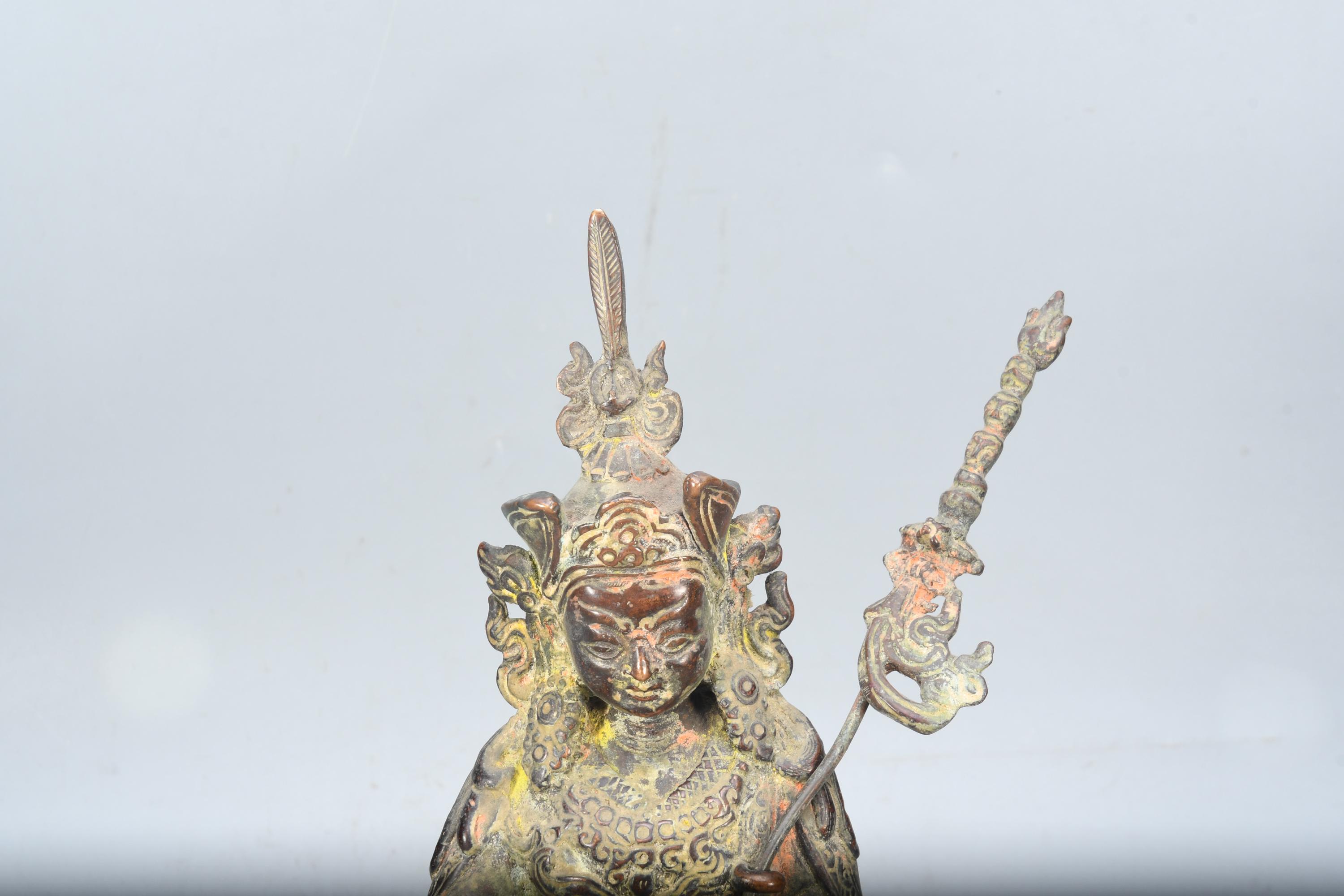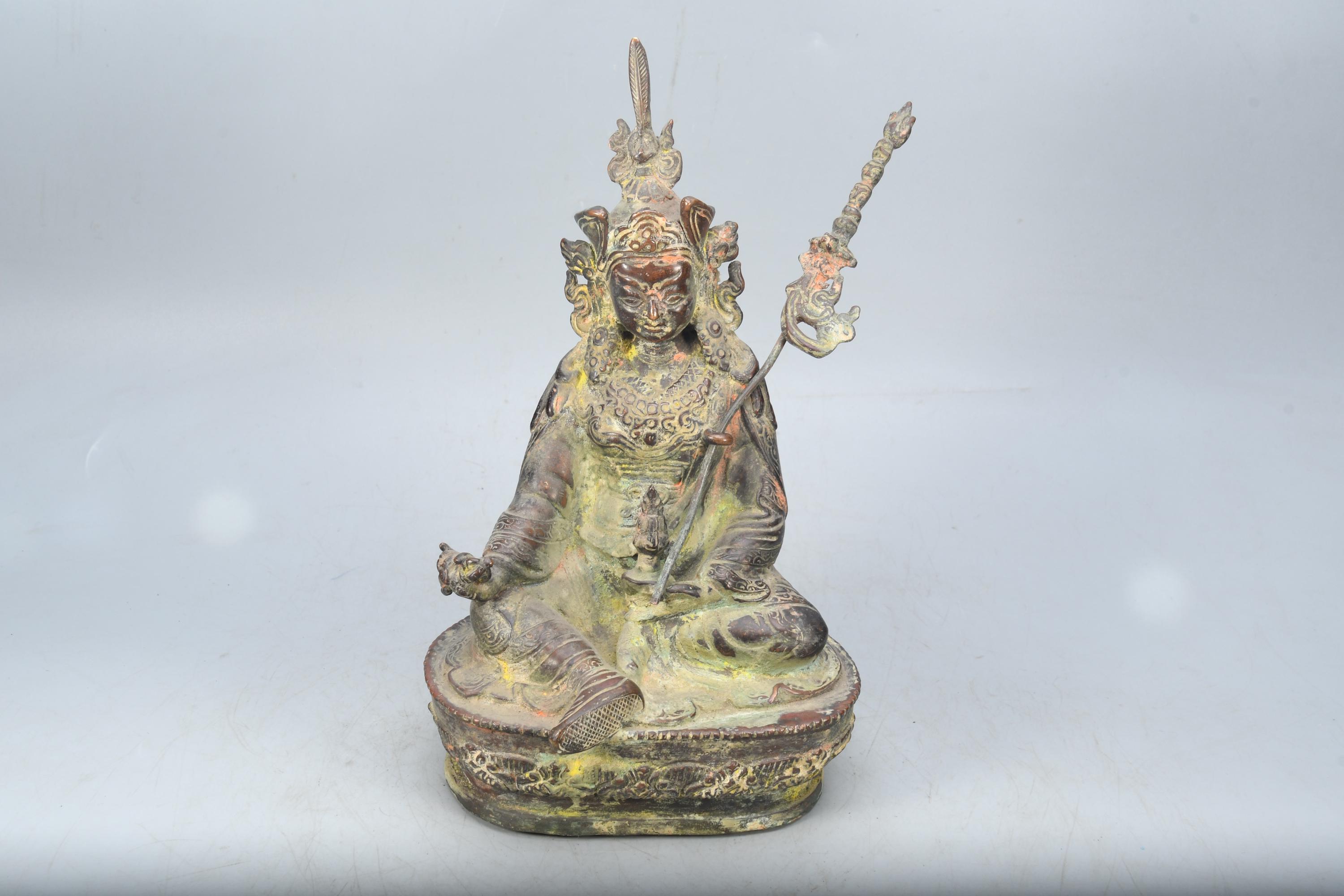 A Copper statue of Guru Rinpoche Padmasambhava was sculpted in Nepal. Padmasambhava is seated on a lotus throne holding a vajra with His right hand while His left-hand dhyana mudra, holds a skull cup containing the nectar of wisdom immortality. Leaning on his left shoulder a “khatvanga” (ritual trident) with three severed heads symbolizing the liberation from the three main causes of suffering (kayas). The characteristic hat is adorned with an eagle feather on top and His robes are beautifully sculpted with meticulous decors. Guru Rinpoche is considered by Tibetan Buddhists to be the second Buddha, the master that introduced Buddhism to Tibet and spread the practice of tantra in all Himalayan regions.Padmasambhava was born from a lotus blossom and is considered an emanation of Buddha Amitabha. He was known for His power to control spirits and protect the practitioners of Dharma from their influence.
