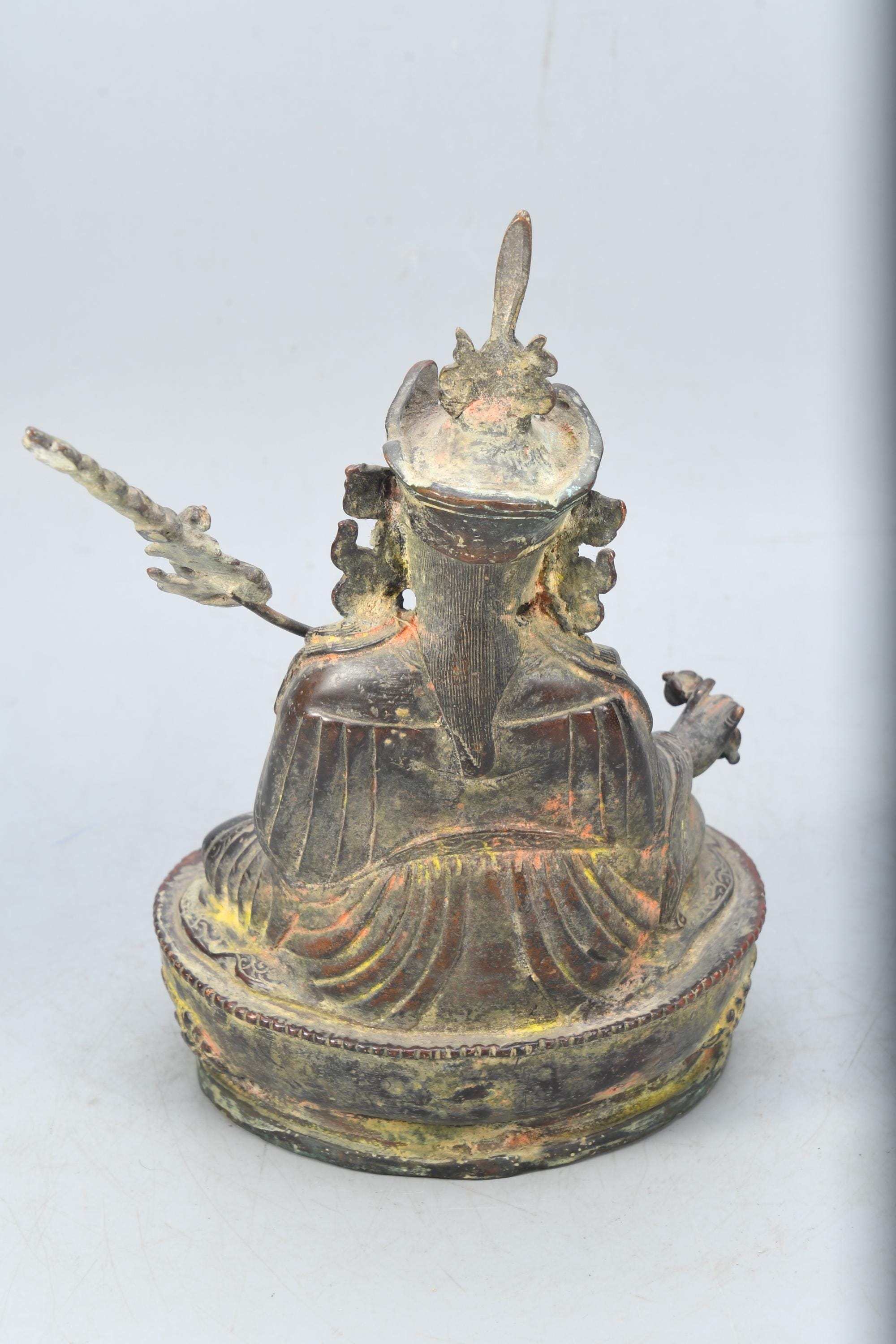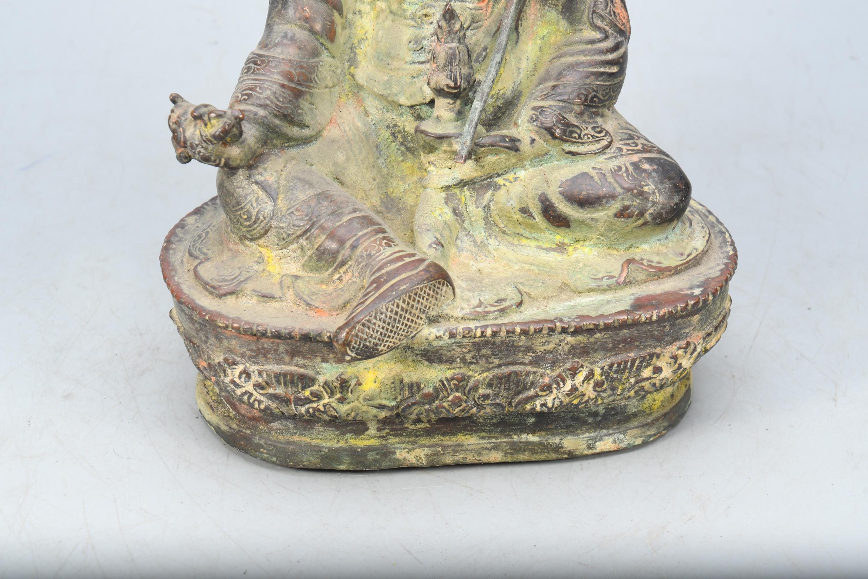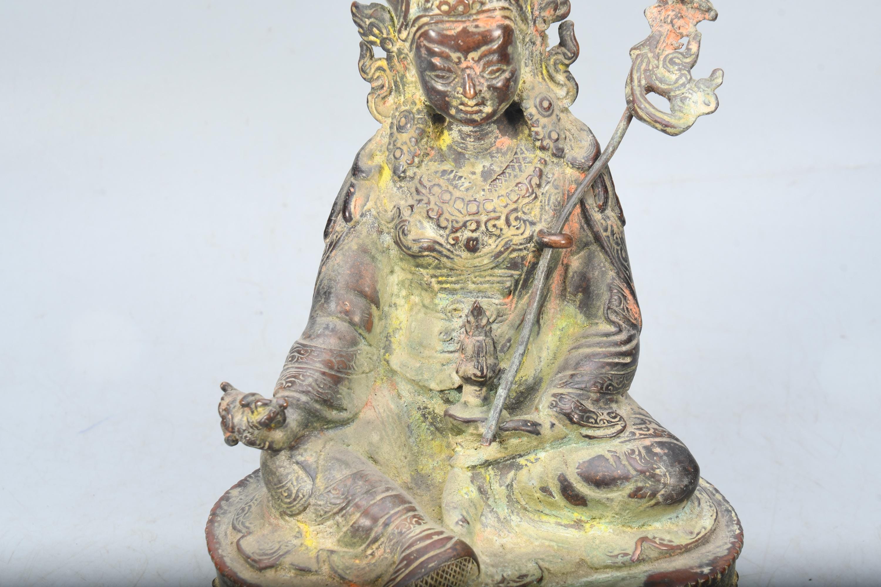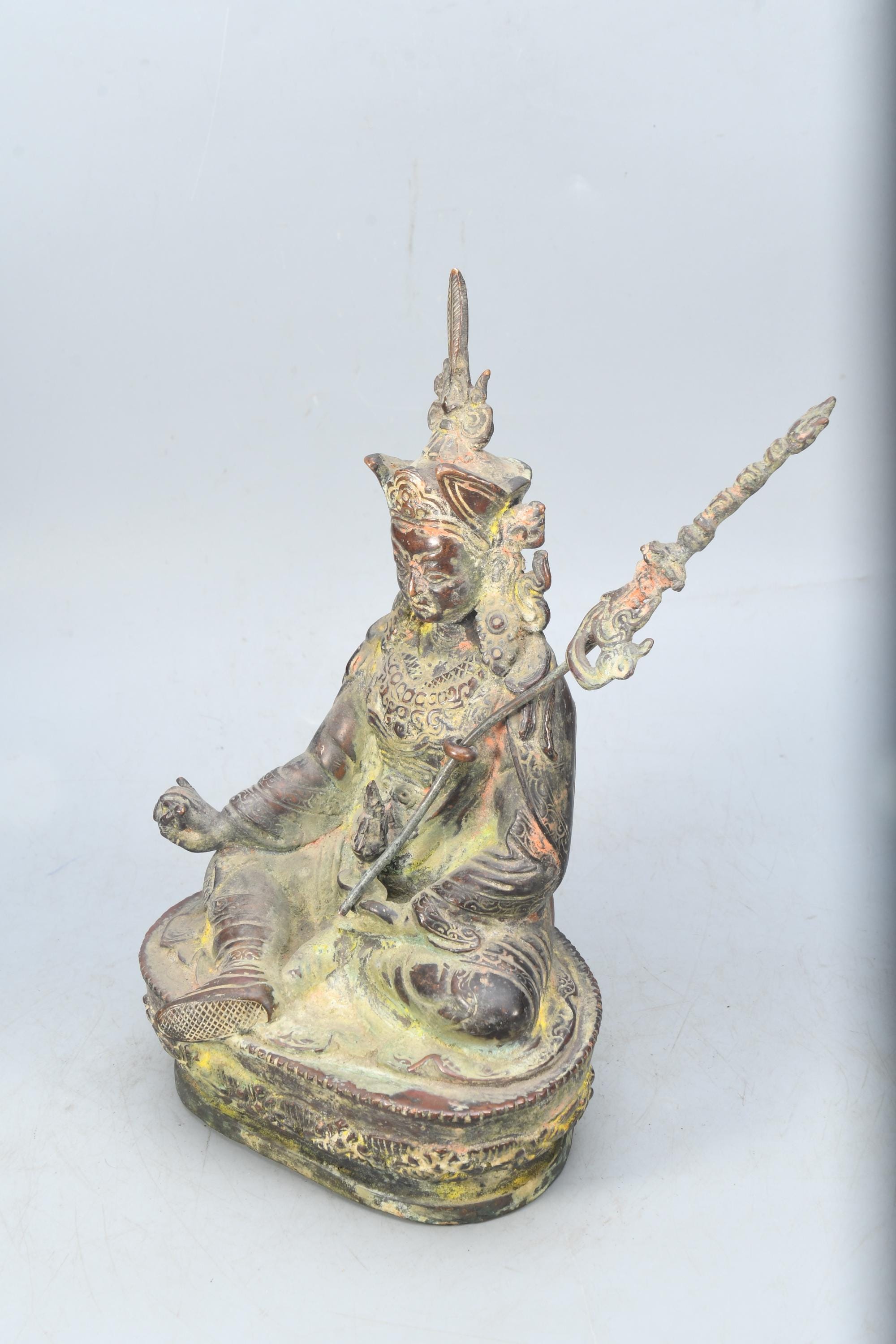 A Copper statue of Guru Rinpoche Padmasambhava was sculpted in Nepal. Padmasambhava is seated on a lotus throne holding a vajra with His right hand while His left-hand dhyana mudra, holds a skull cup containing the nectar of wisdom immortality. Leaning on his left shoulder a “khatvanga” (ritual trident) with three severed heads symbolizing the liberation from the three main causes of suffering (kayas). The characteristic hat is adorned with an eagle feather on top and His robes are beautifully sculpted with meticulous decors. Guru Rinpoche is considered by Tibetan Buddhists to be the second Buddha, the master that introduced Buddhism to Tibet and spread the practice of tantra in all Himalayan regions.Padmasambhava was born from a lotus blossom and is considered an emanation of Buddha Amitabha. He was known for His power to control spirits and protect the practitioners of Dharma from their influence.