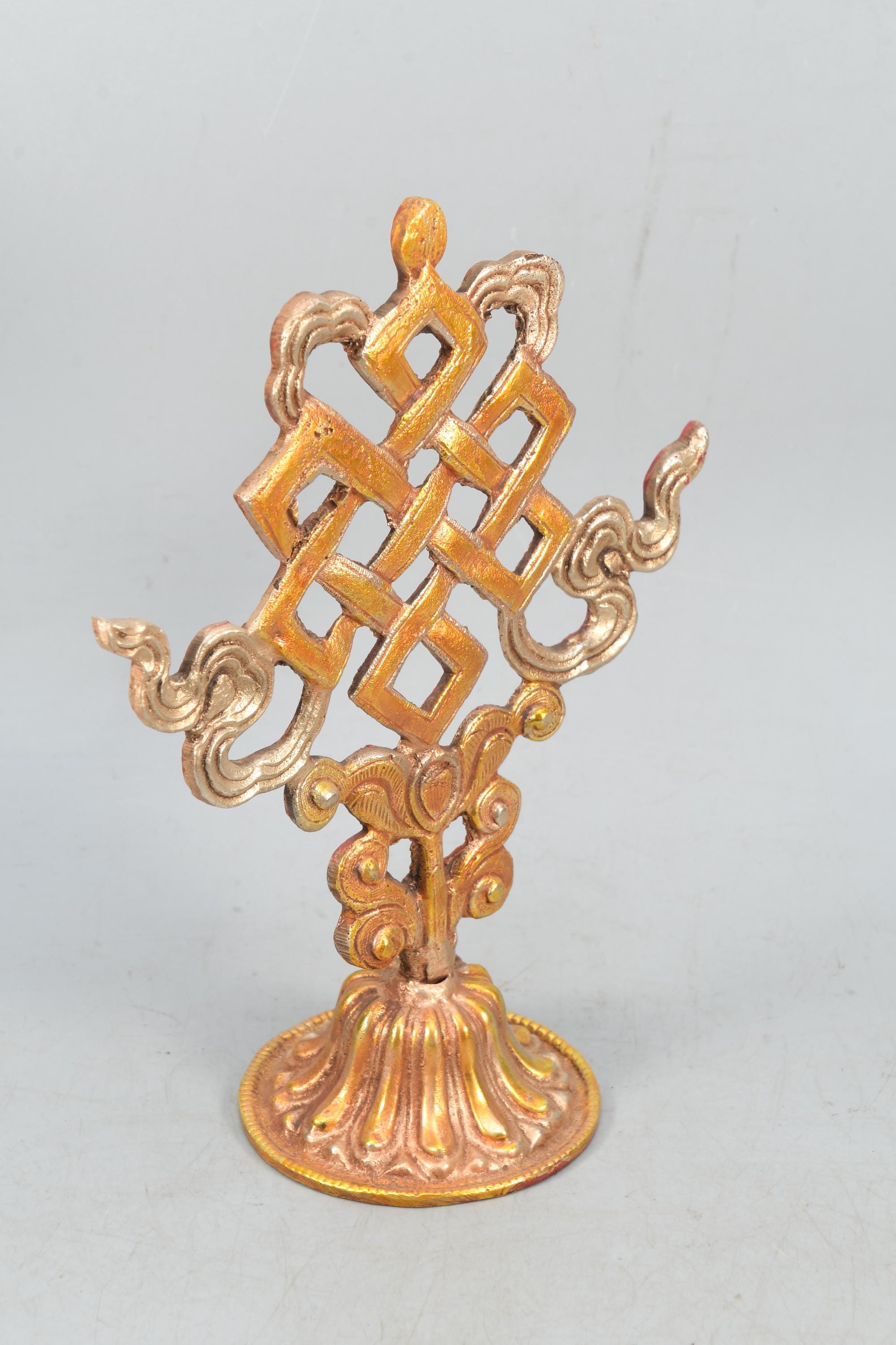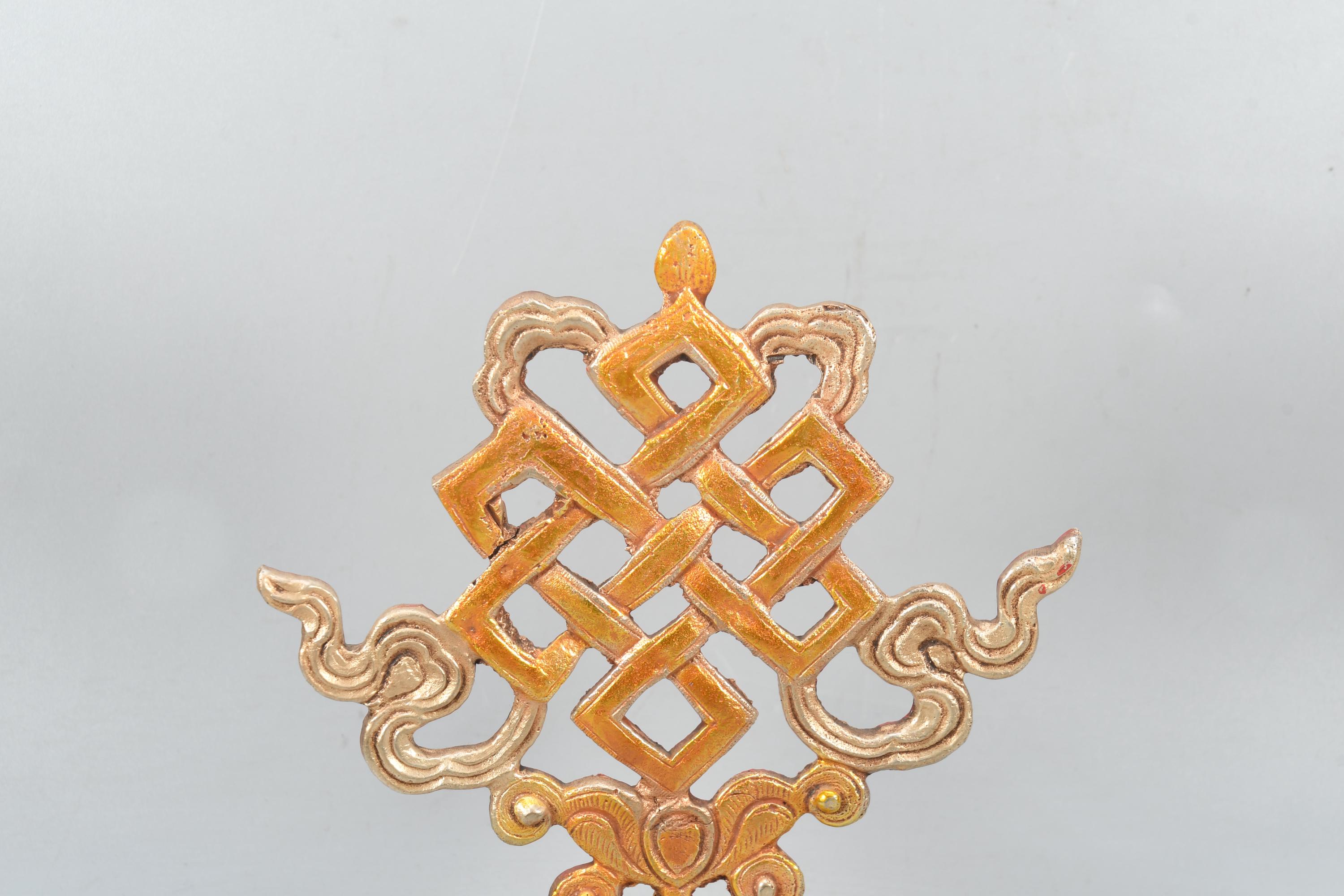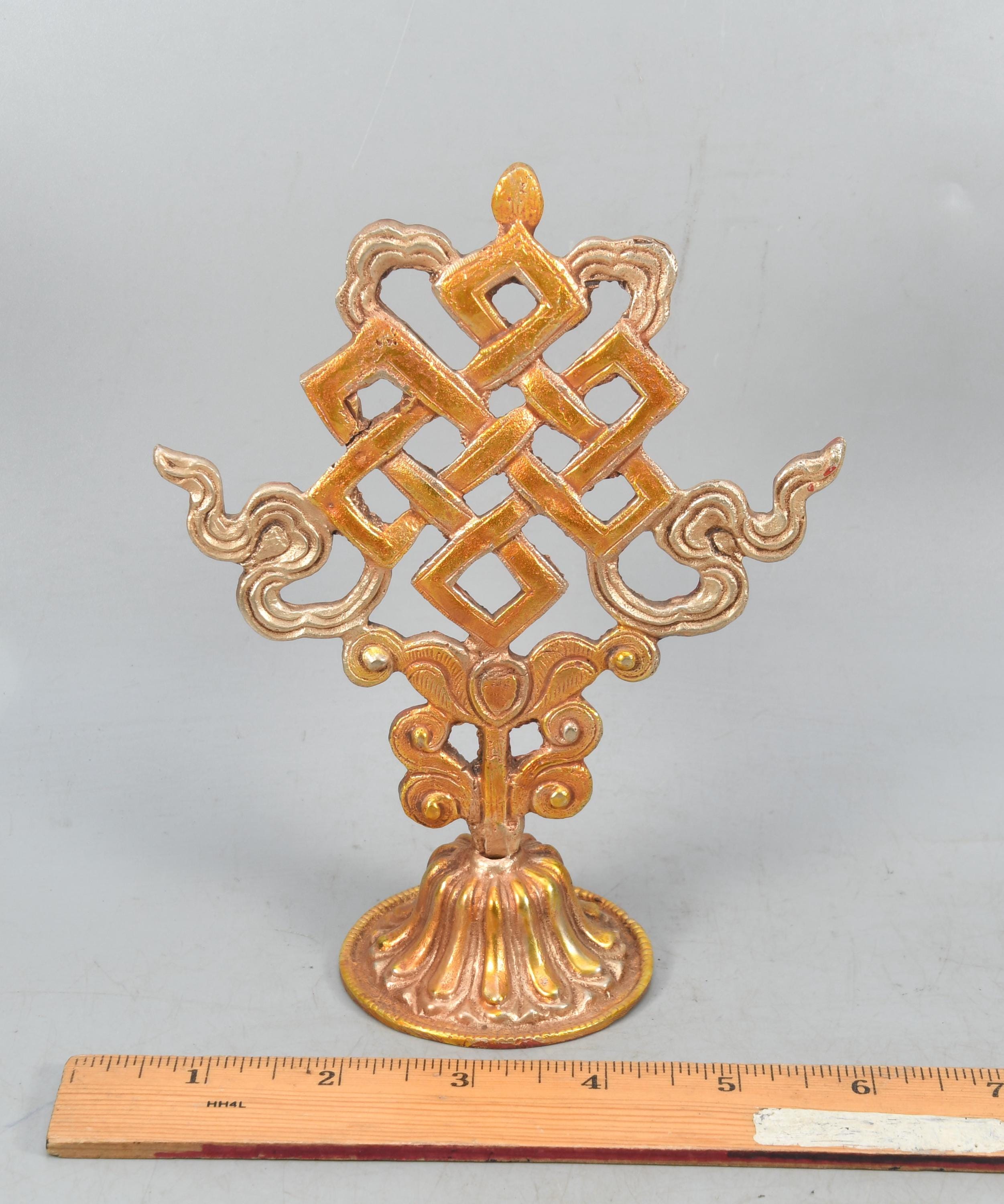 Antique Handmade Gold Colored Endless Knot | Vintage Tibetan Buddhism Symbol | Auspicious Carved Art Decor