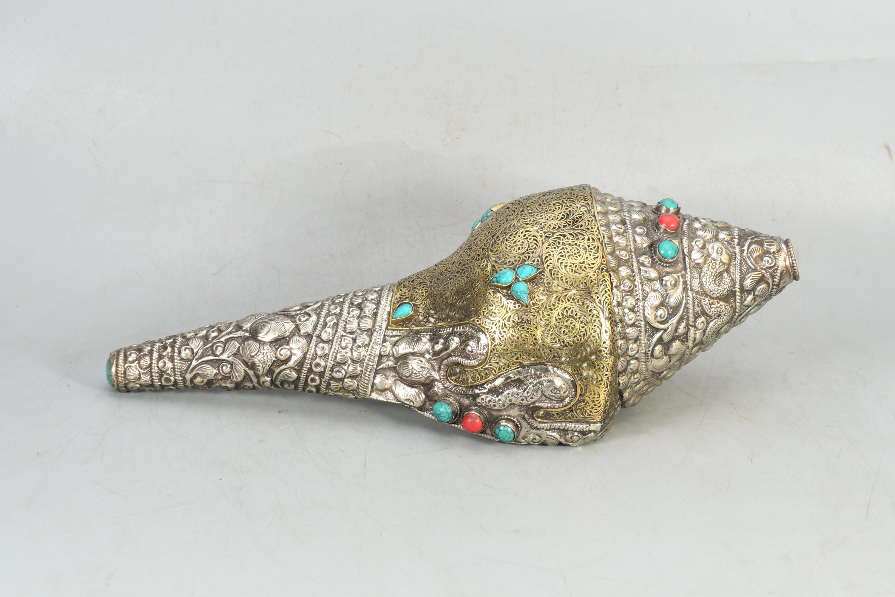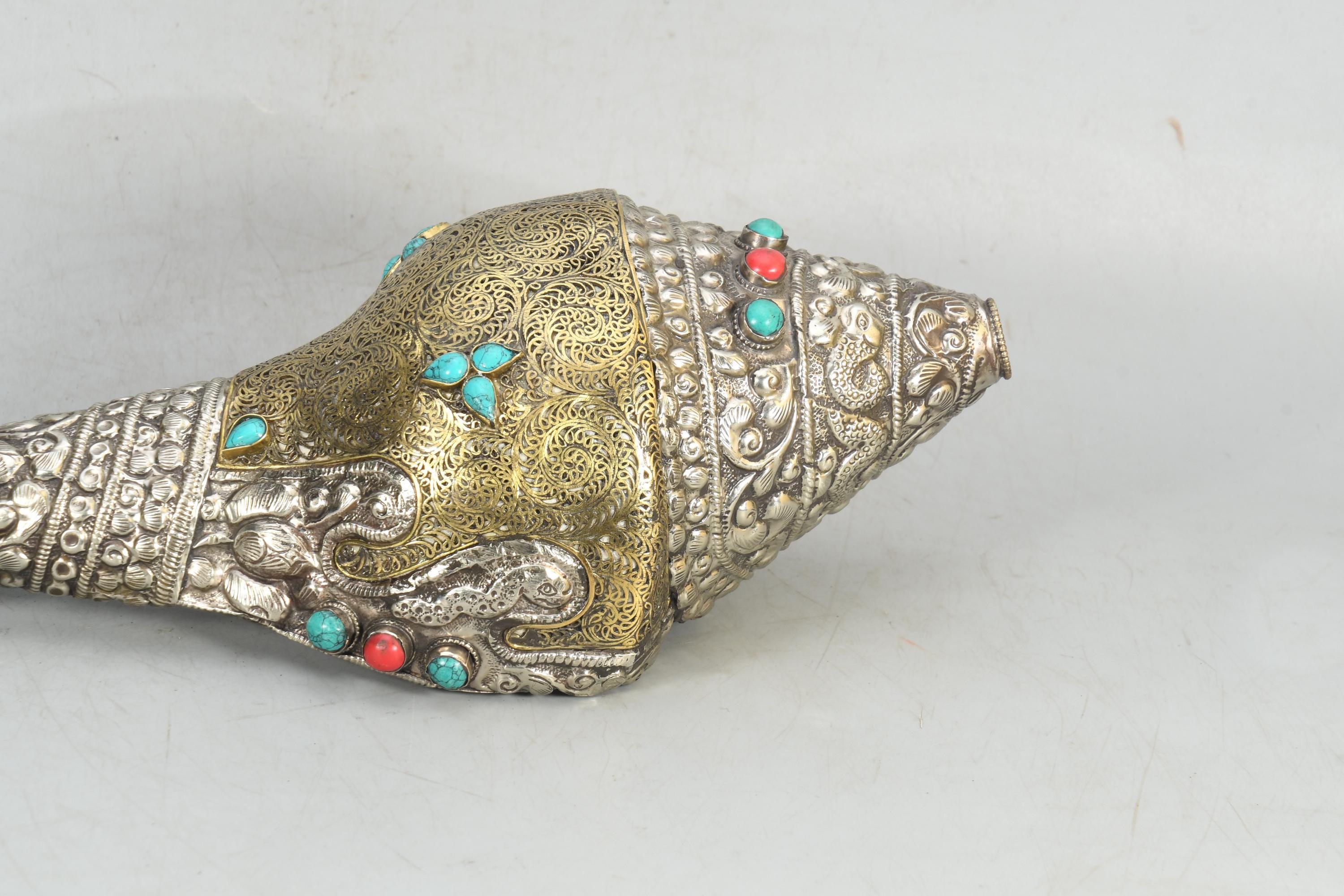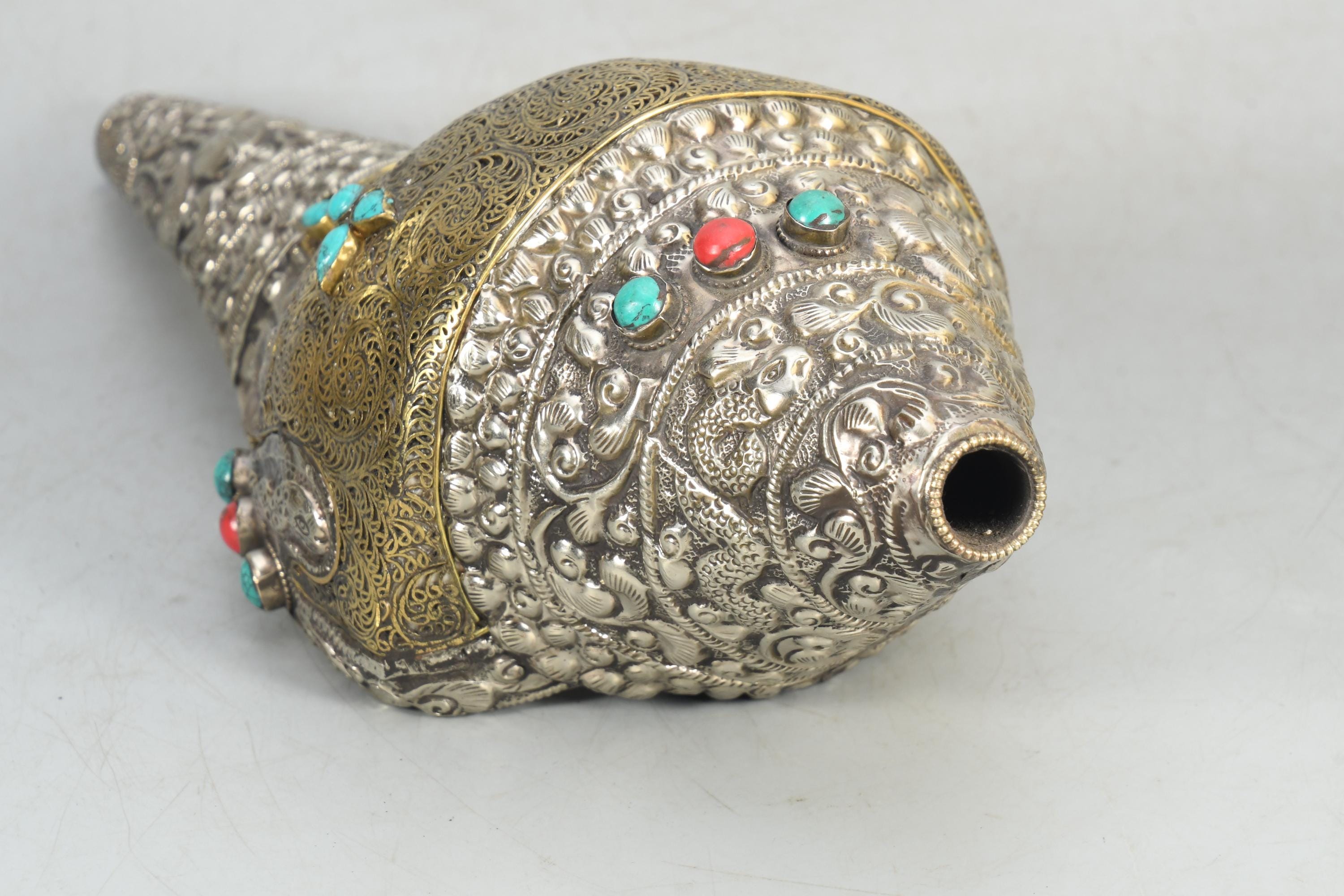 Handcrafted Brass & Tibetan Silver Gemstone Inlay Sankha Conch Shell | Antique Vintage Collectible