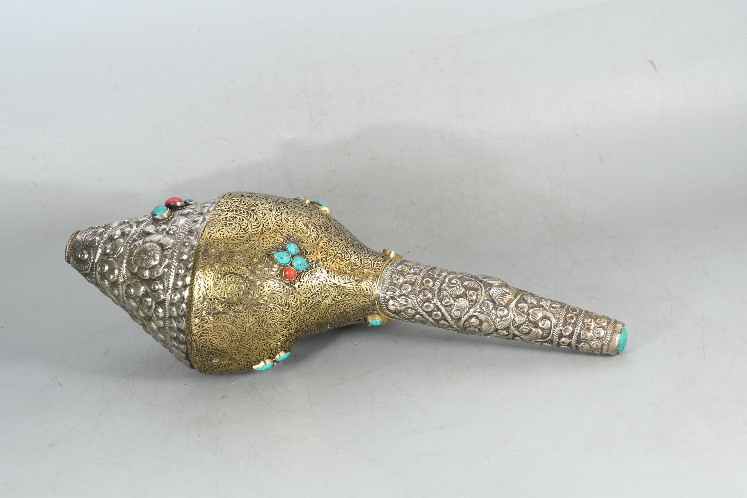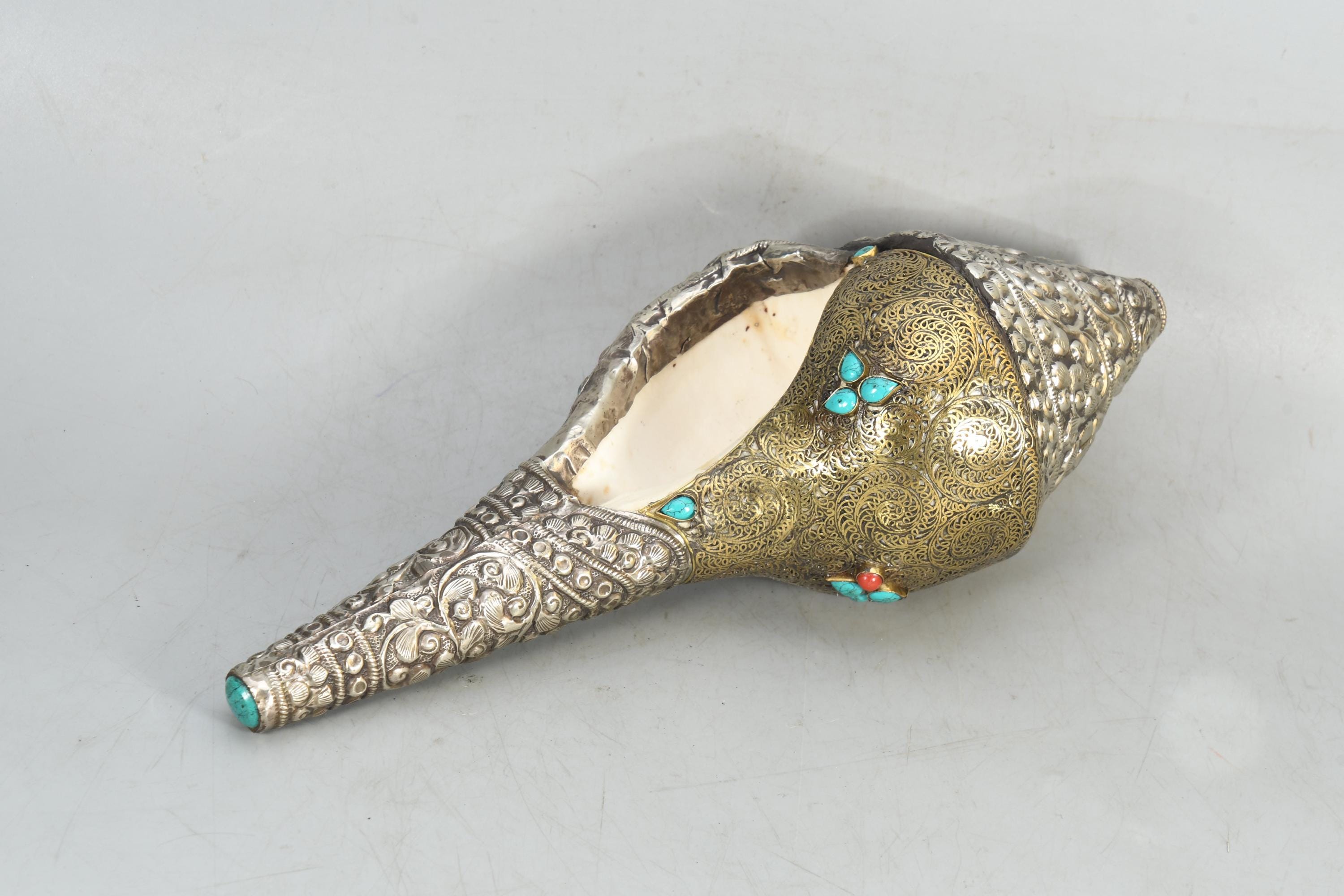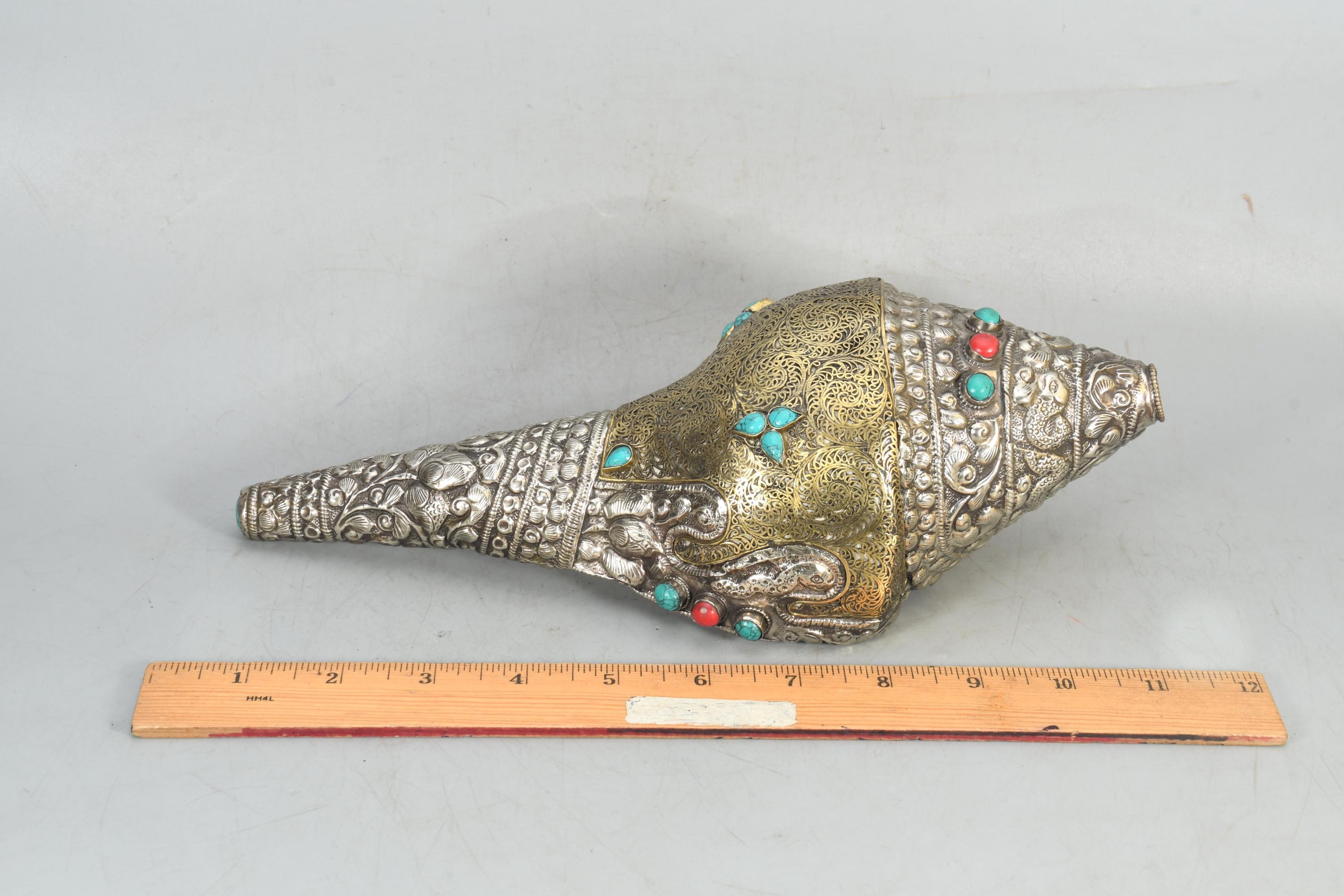 Handcrafted Brass & Tibetan Silver Gemstone Inlay Sankha Conch Shell | Antique Vintage Collectible