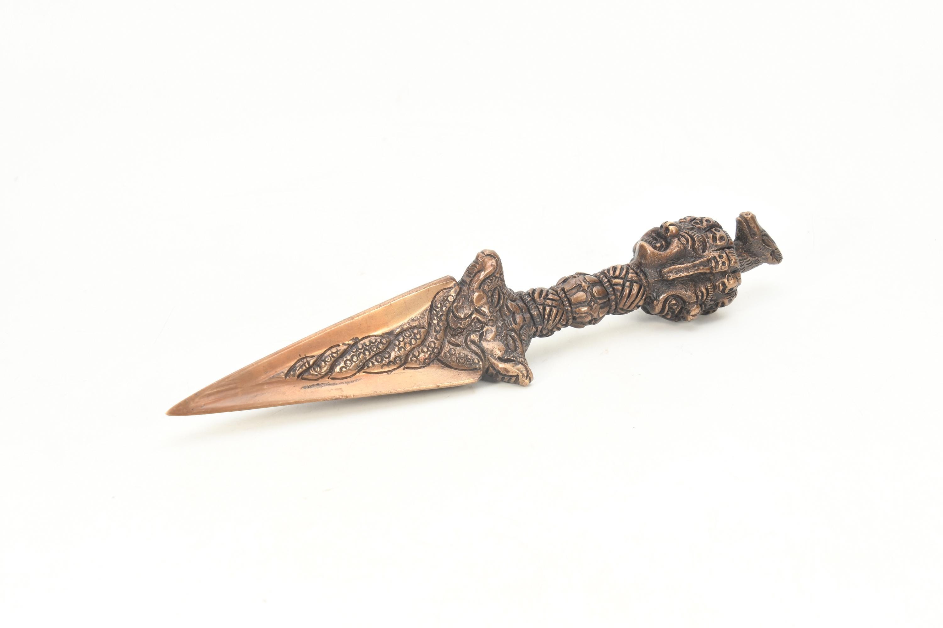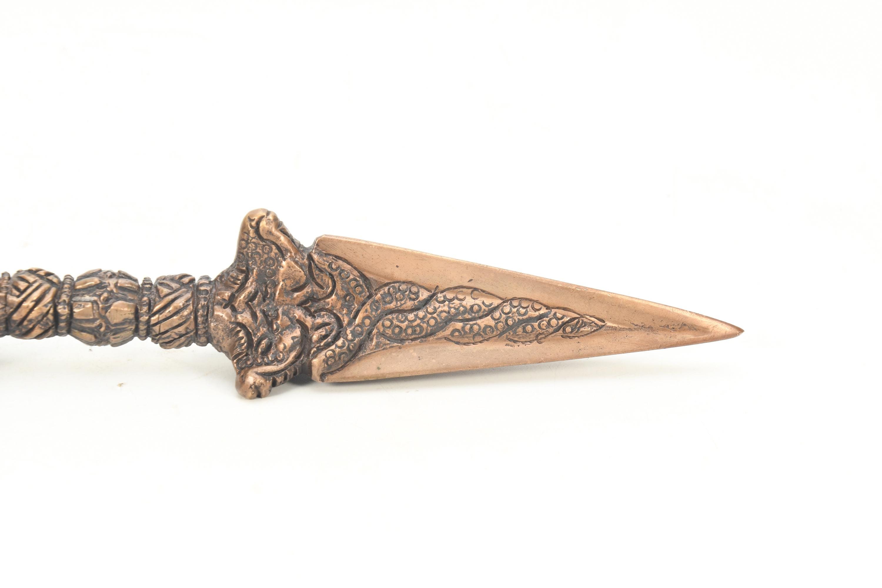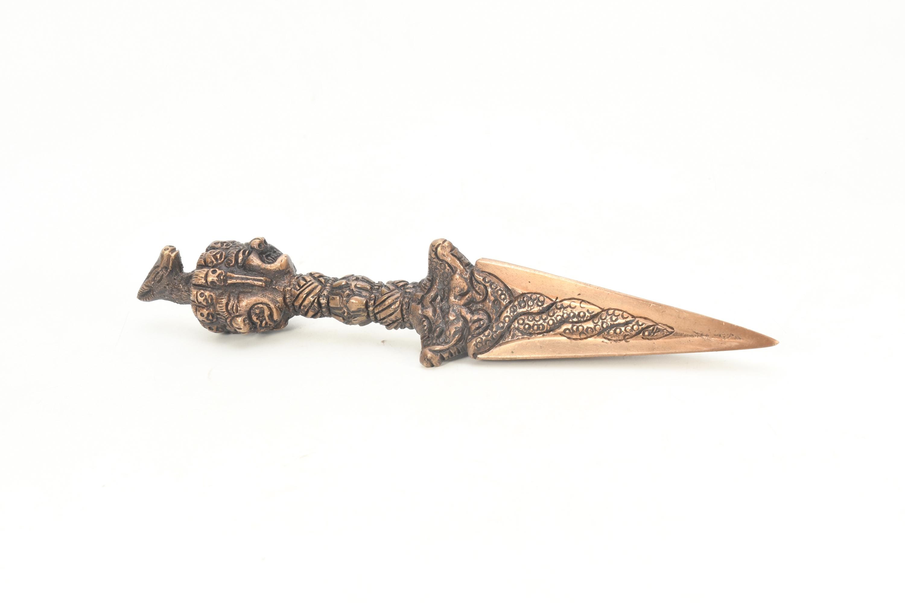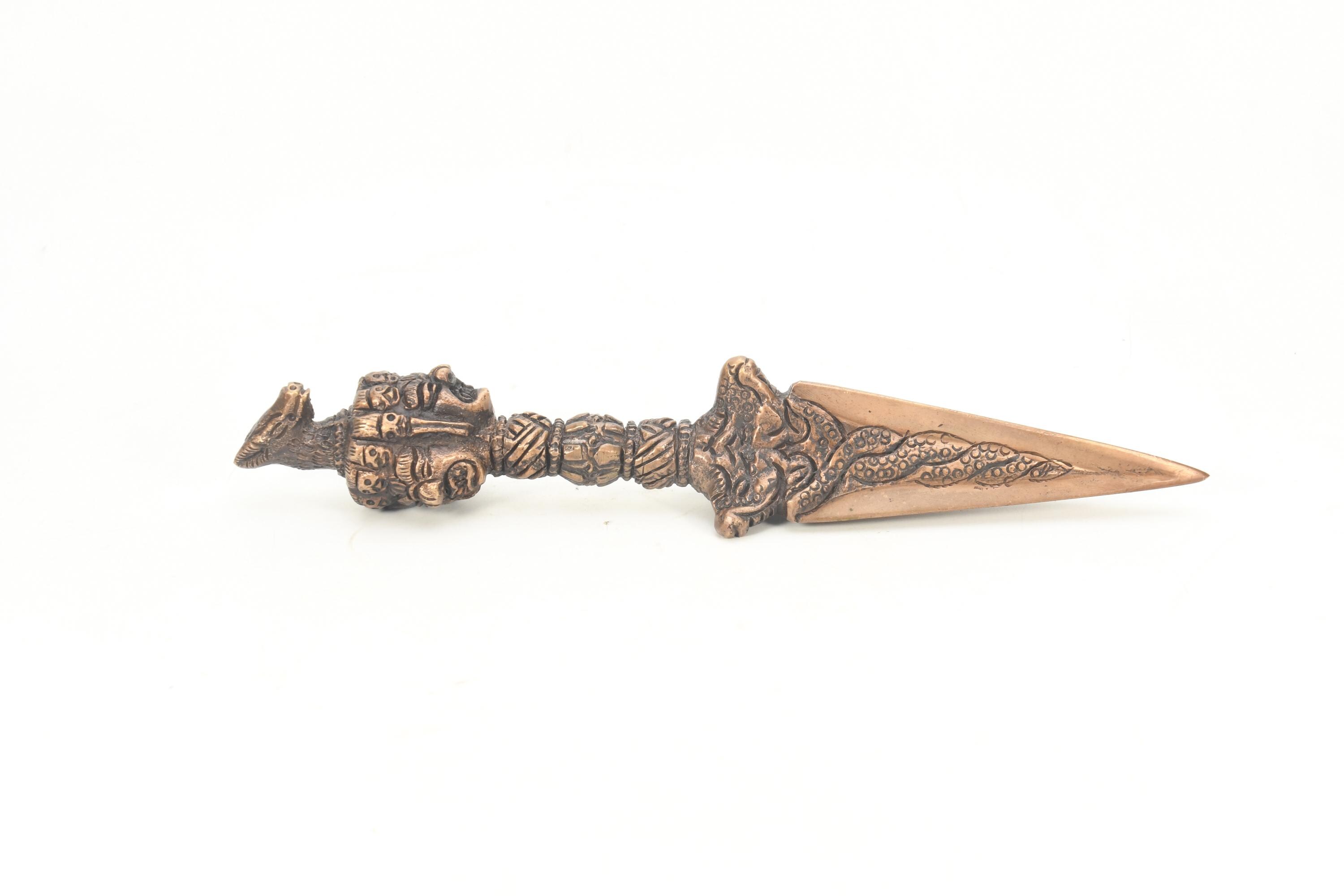 The phurba is also called 'the magic dagger'. 'Phur' is translated from the Sanskrit 'kila' which means peg or nail. The phurba is a three-sided stake that is used in Buddhist rituals.