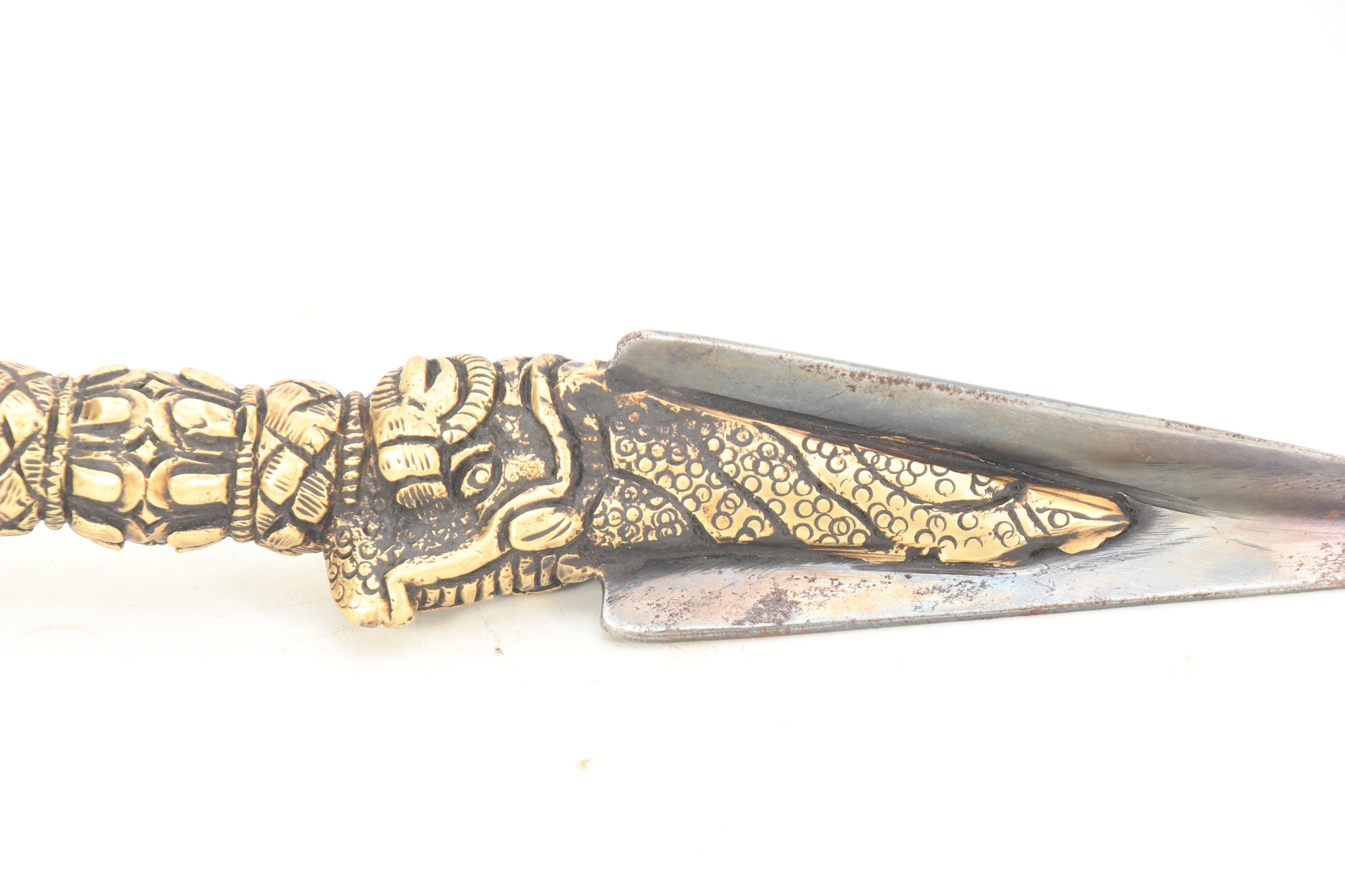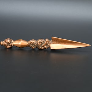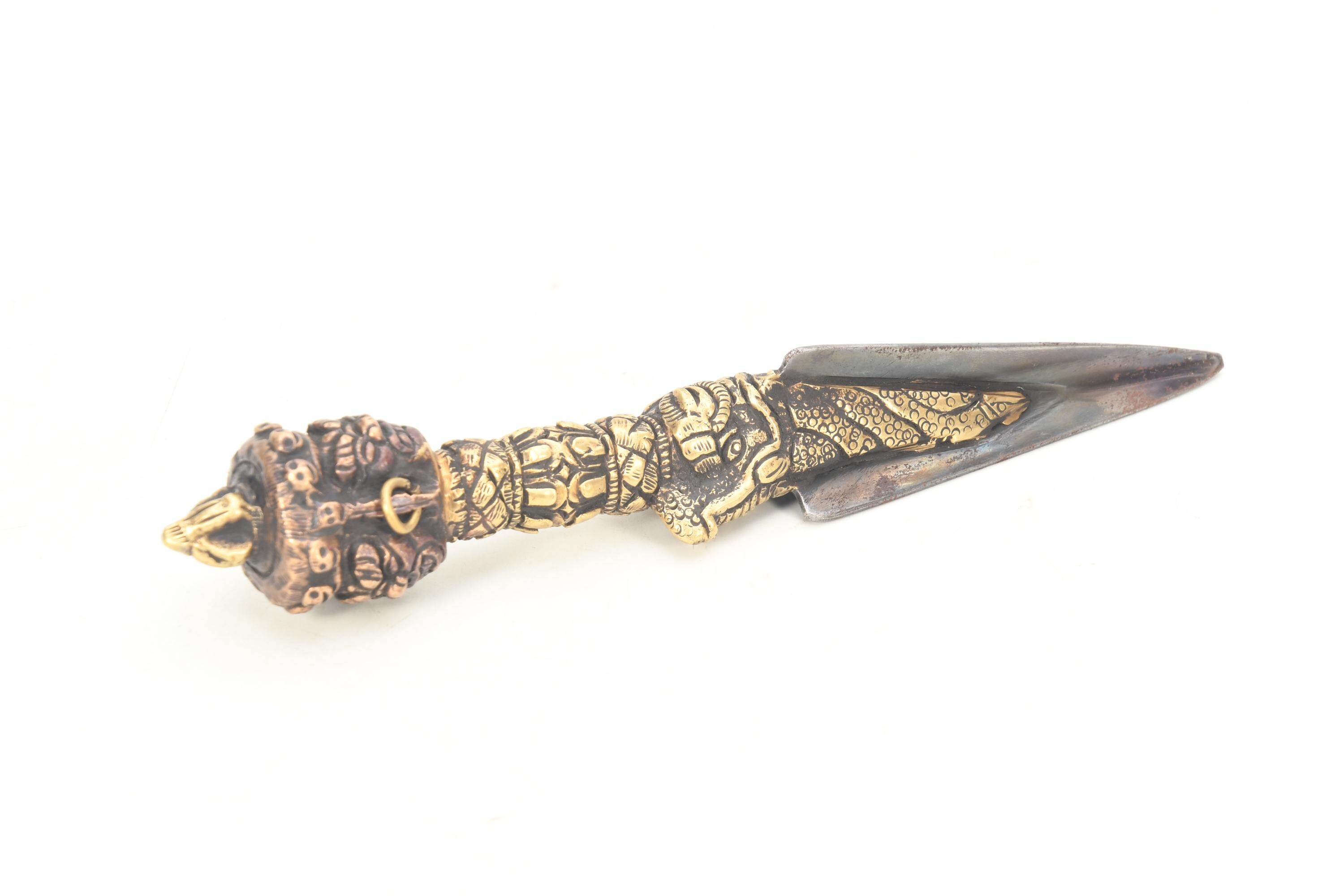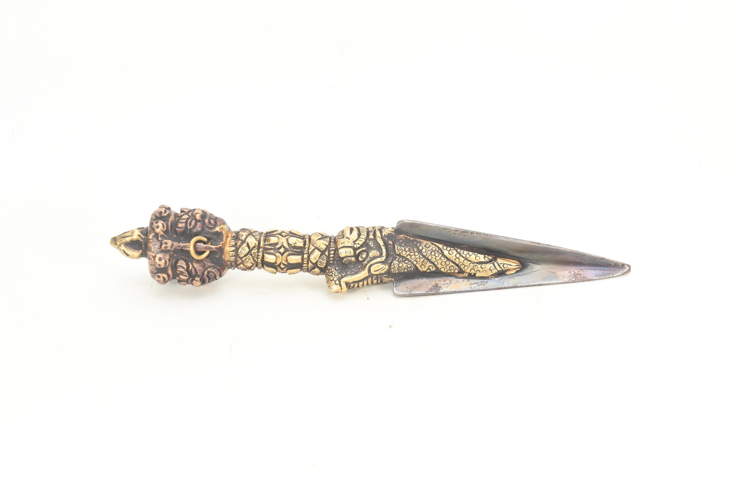 The phurba is also called 'the magic dagger'. 'Phur' is translated from the Sanskrit 'kila' which means peg or nail. The phurba is a three-sided stake that is used in Buddhist rituals.