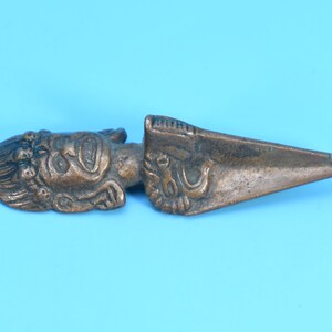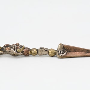 The three-sided style of the phurba comes from an ancient vedic tool. It has three segments on its blade, each representing the power of the phurba to transform negative energies. These energies are known as the 'three poisons,' and are attachment, ignorance, and aversion. The three sides of the phurba also represent the three spirit worlds, and the phurba itself represents the axis of the three spirit worlds. The handle of the phurba represents 'wisdom', while the blade represents 'method'.