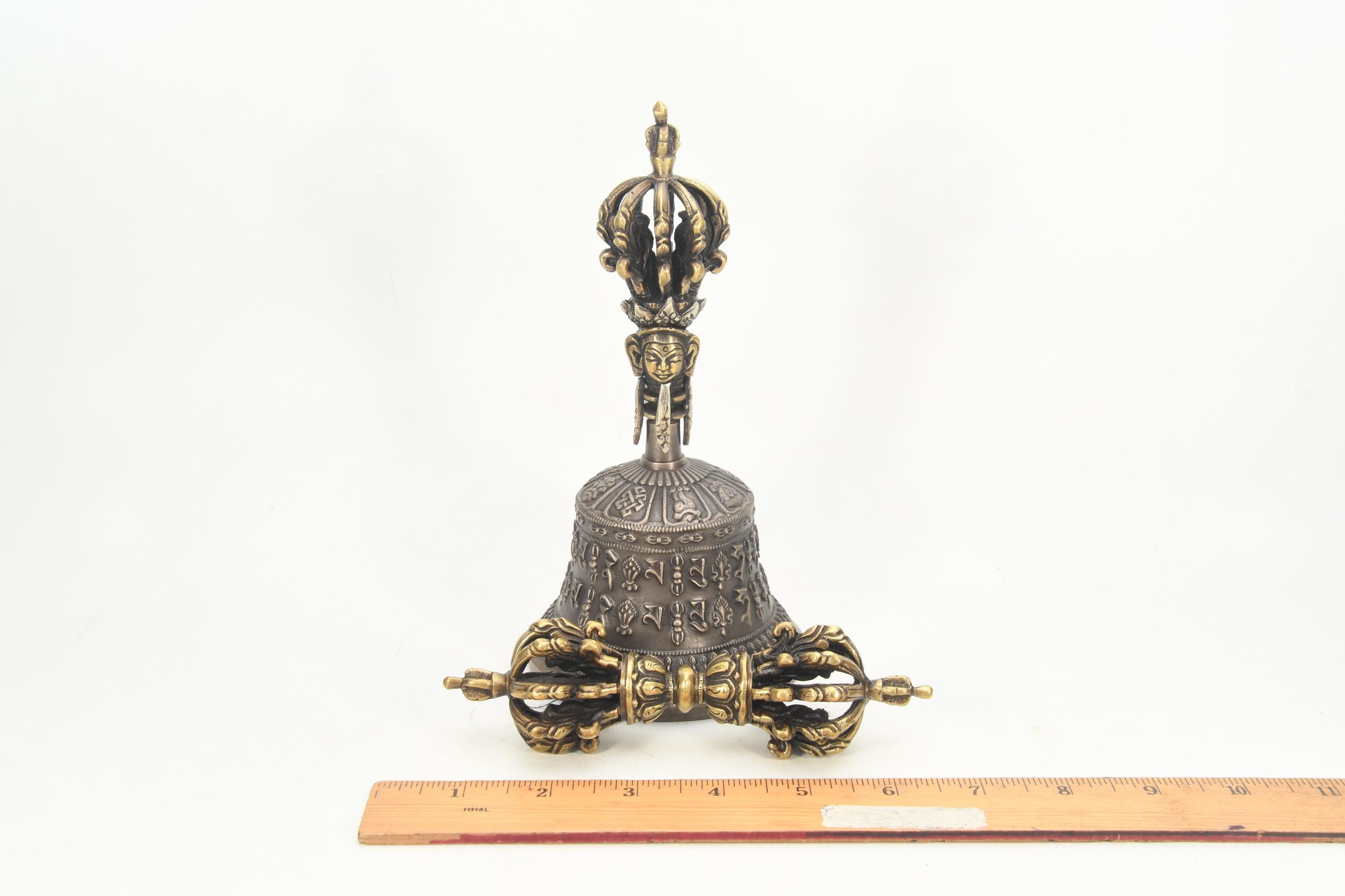 This is a high quality Tibetan large handcrafted Solid Bell decorated with embossed Tibetan Buddhist dorji and Victory banner. This Handmade Tibetan Buddhist Prayer Bell seven metals alloy including brass and bronze in Northern India where traditional metal craft support the entire community. The Bell has great sound. This Handmade Tibetan Buddhist Prayer Bell can be also used to call practitioners for meditation, yoga or family.