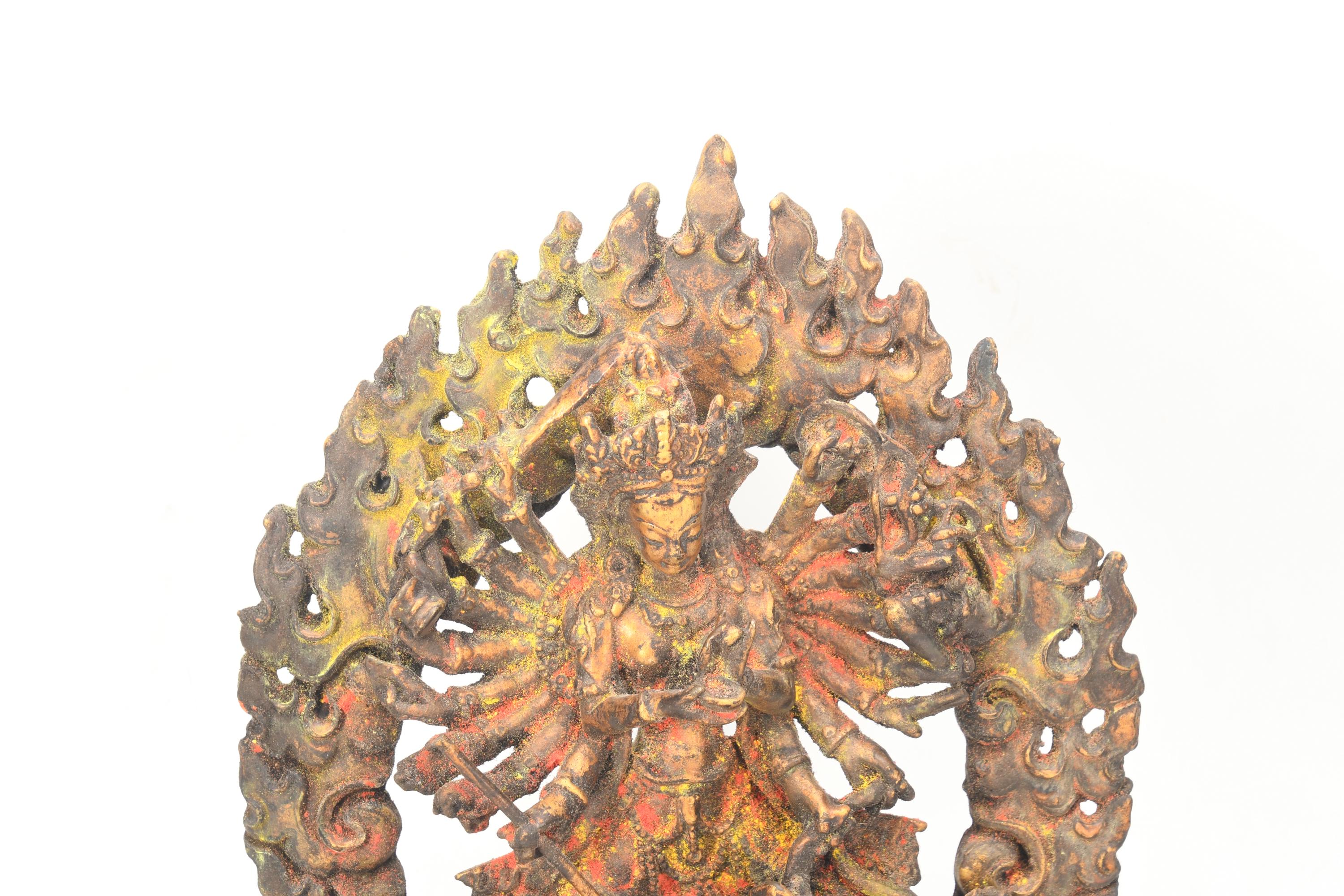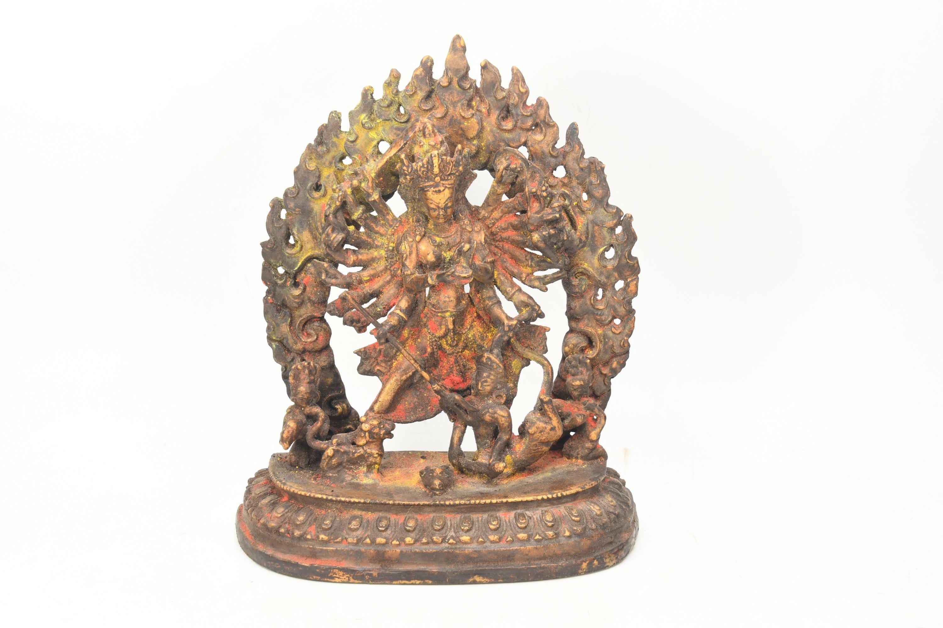 In Hinduism, the goddess Durga is the "the inaccessible" or "the invincibleâ, or Maa Durga (Mother Durga) "one who can redeem in situations of utmost distress". Durga is a form of Devi, the supremely radiant goddess, depicted as having ten arms, riding a lion or a tiger, carrying weapons (including a Lotus flower), maintaining a meditative smile, and practicing mudras, or symbolic hand gestures. An embodiment of creative feminine force (Shakti), Durga exists in a state of svatantrya (dependence on the universe and nothing/nobody else, self-sufficiency) and fierce compassion.