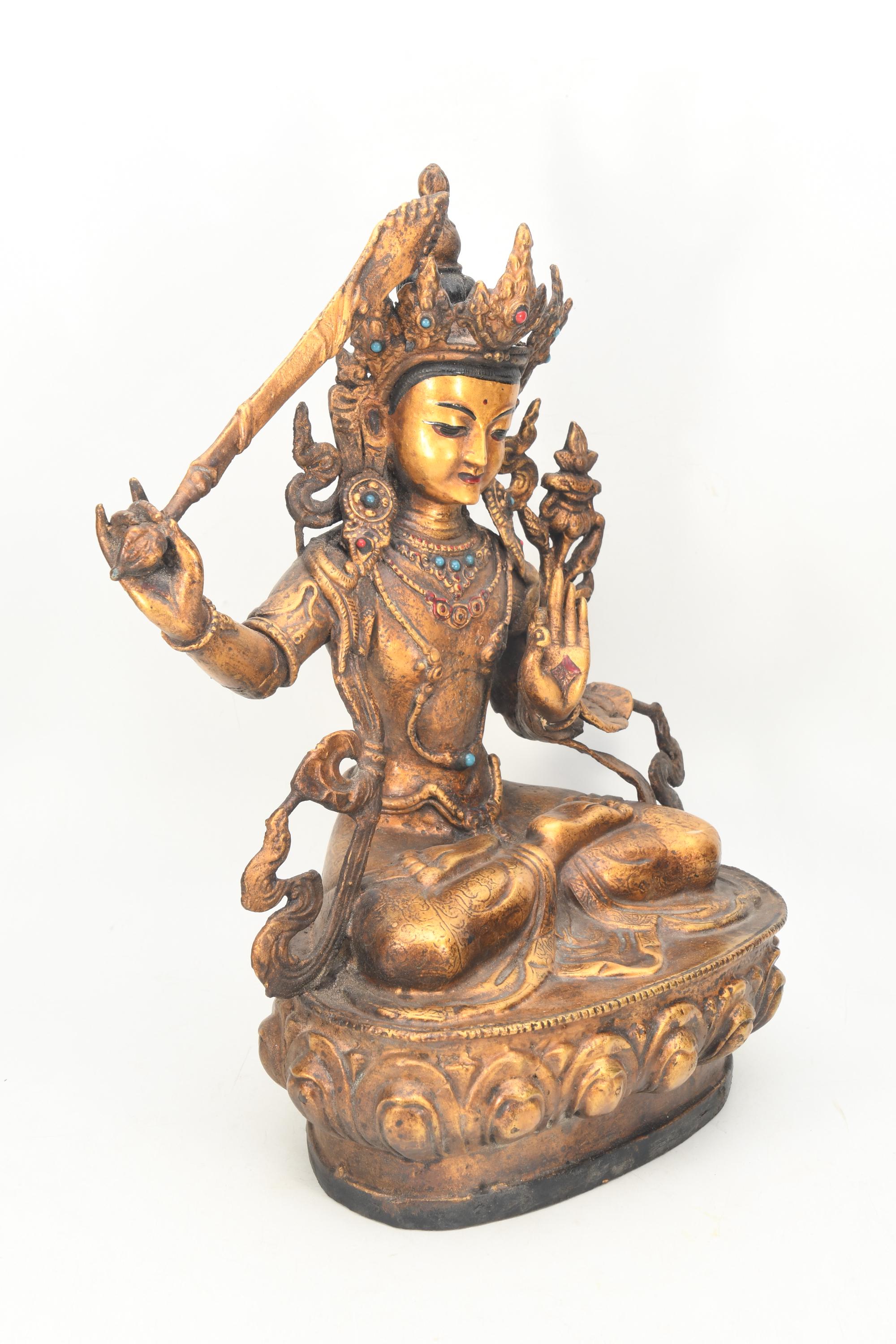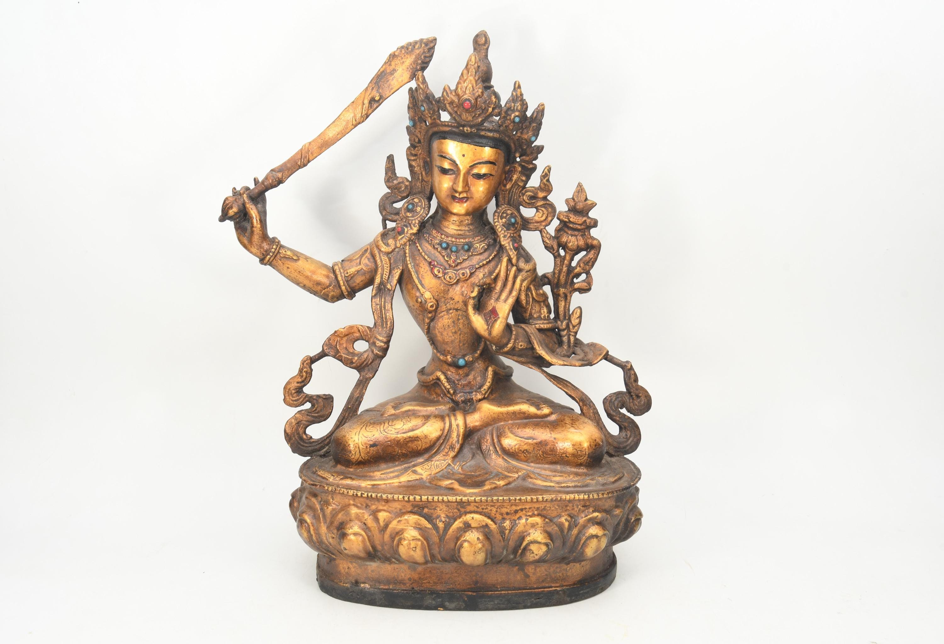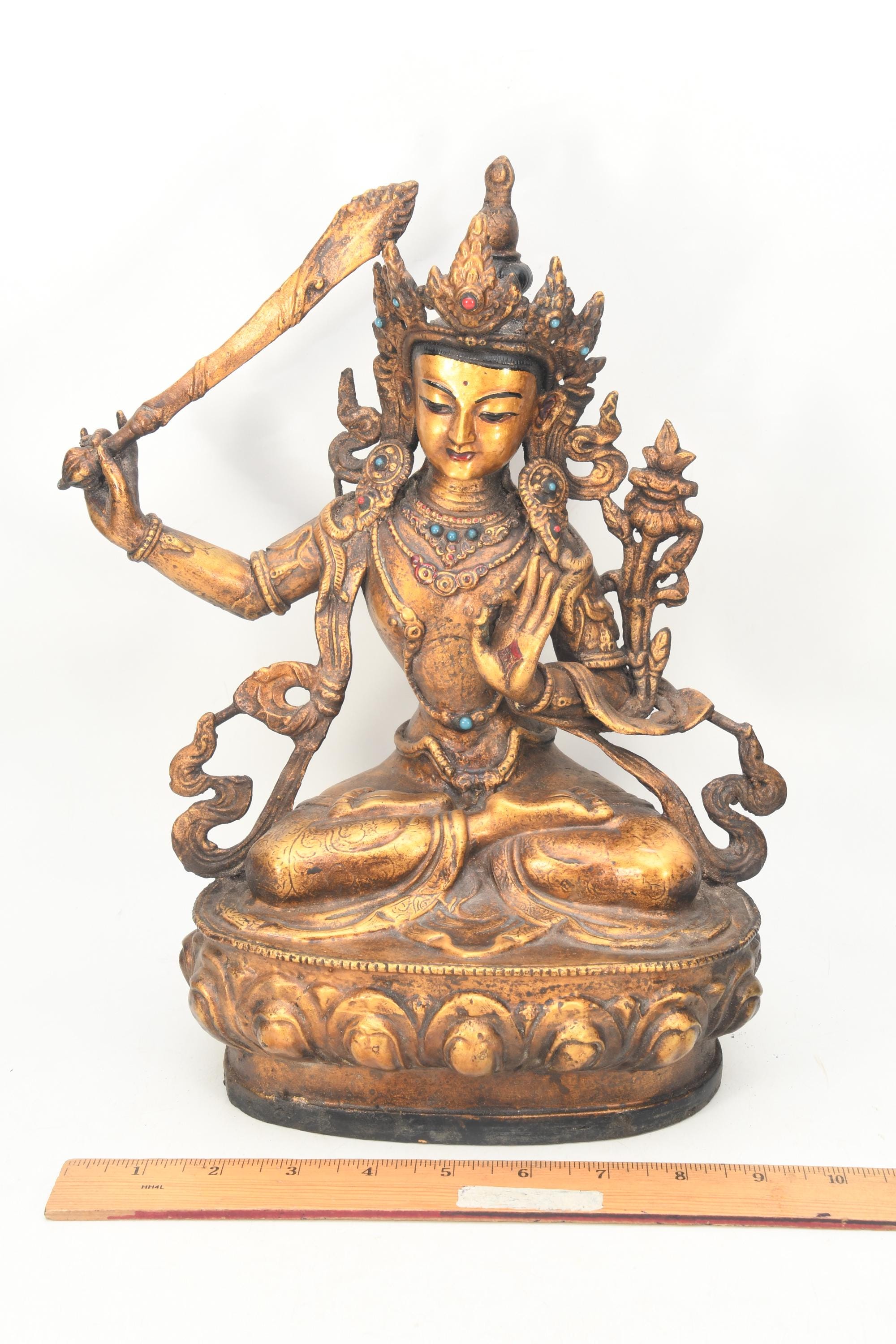 Manjushree Sword Carrying Antique Handmade Gold Gilded Brass Figurine Vintage Tibetan Sculpture Art Collectible