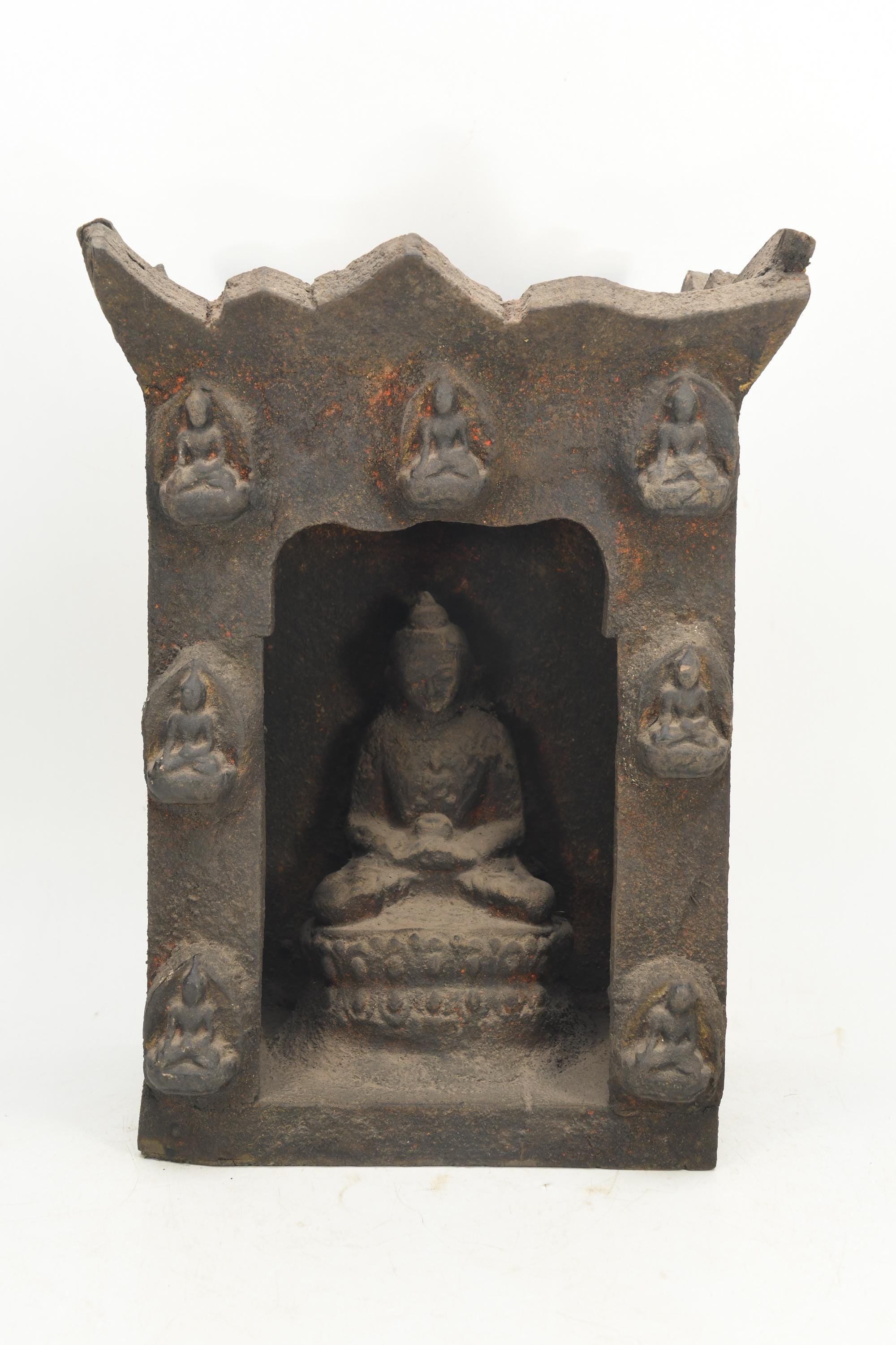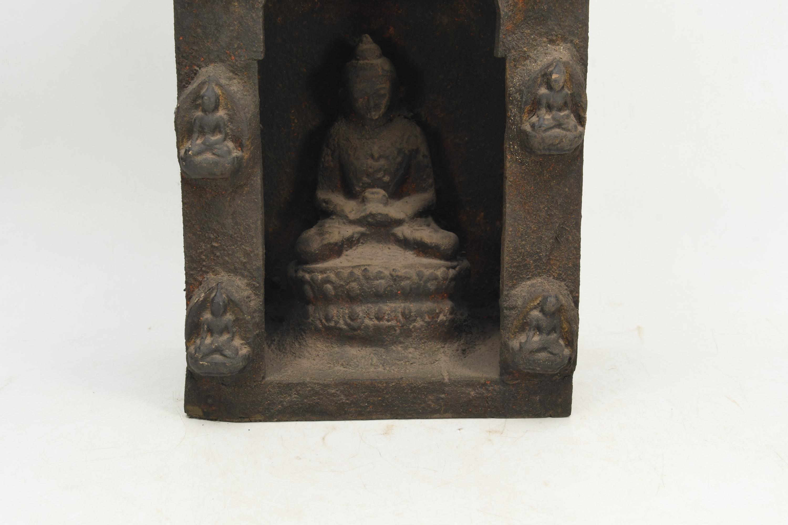 Shakyamuni Buddha is seated in the traditional lotus position, with his hands resting in his lap in the Dhyana Mudra, a gesture of meditation. His eyes are closed in deep concentration, and his serene expression conveys a sense of inner peace and tranquility.