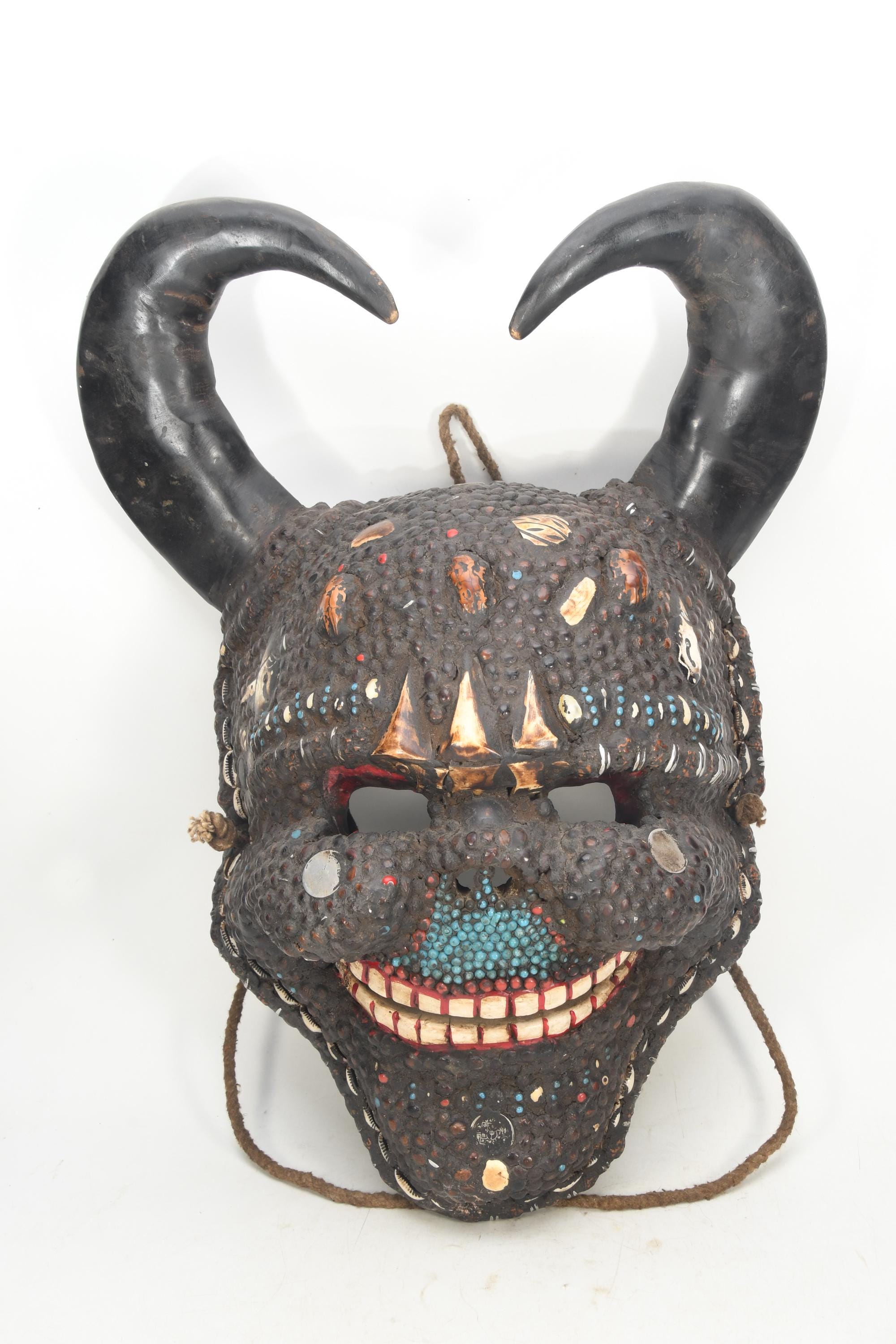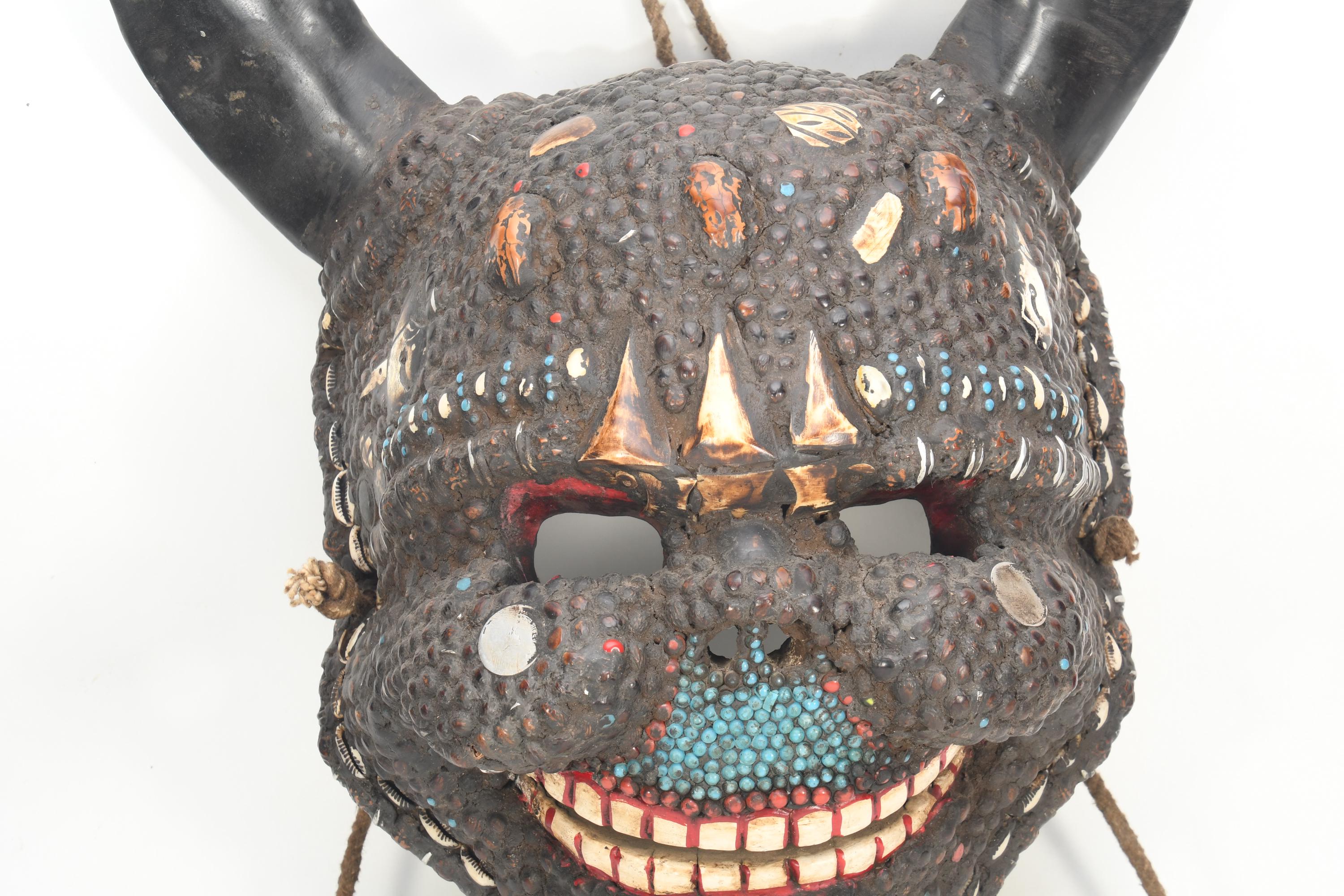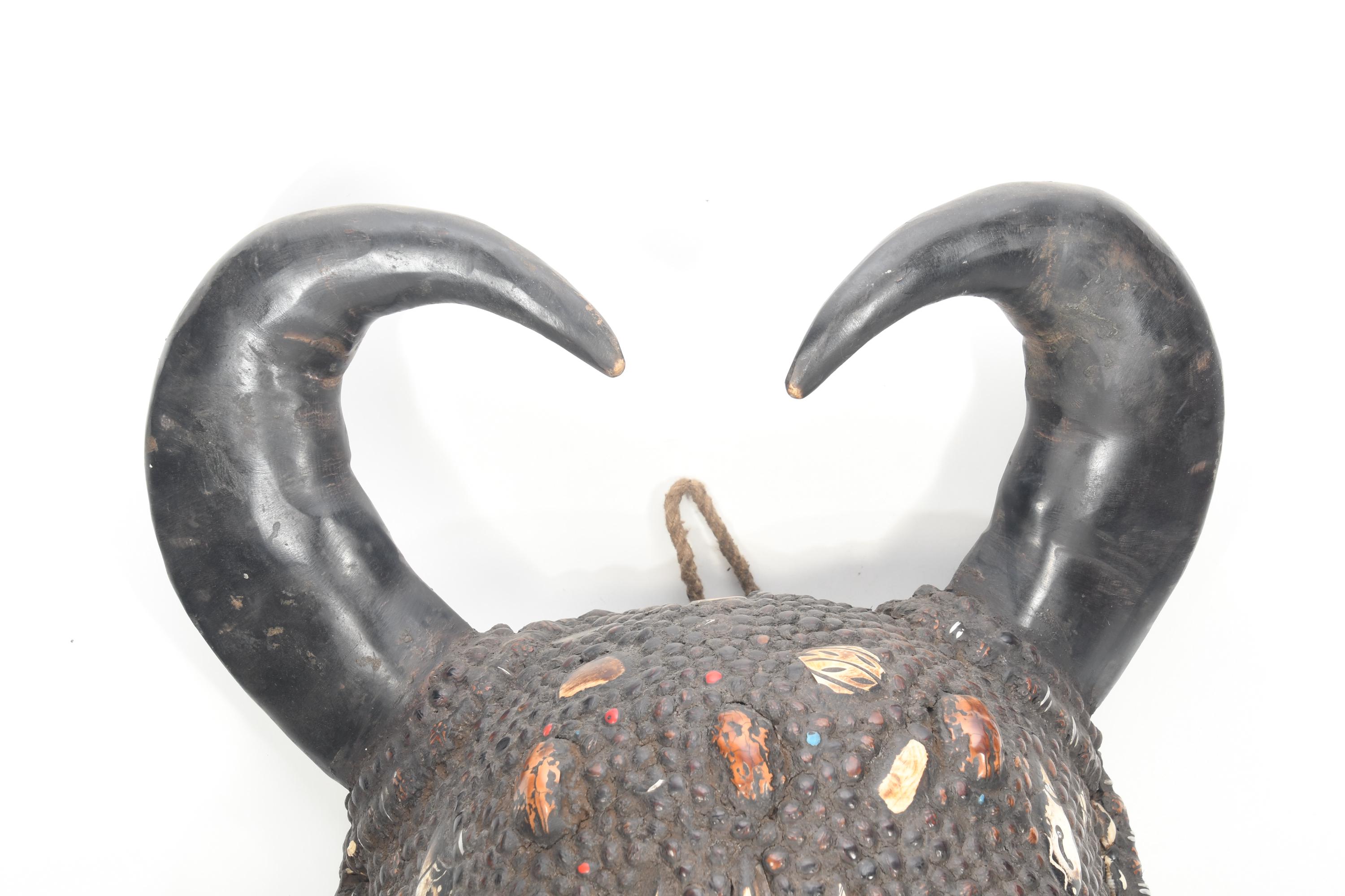 Rudraksha Beaded Tribal Citipati Mask – Horned Shaman, Vintage Wall Hanging