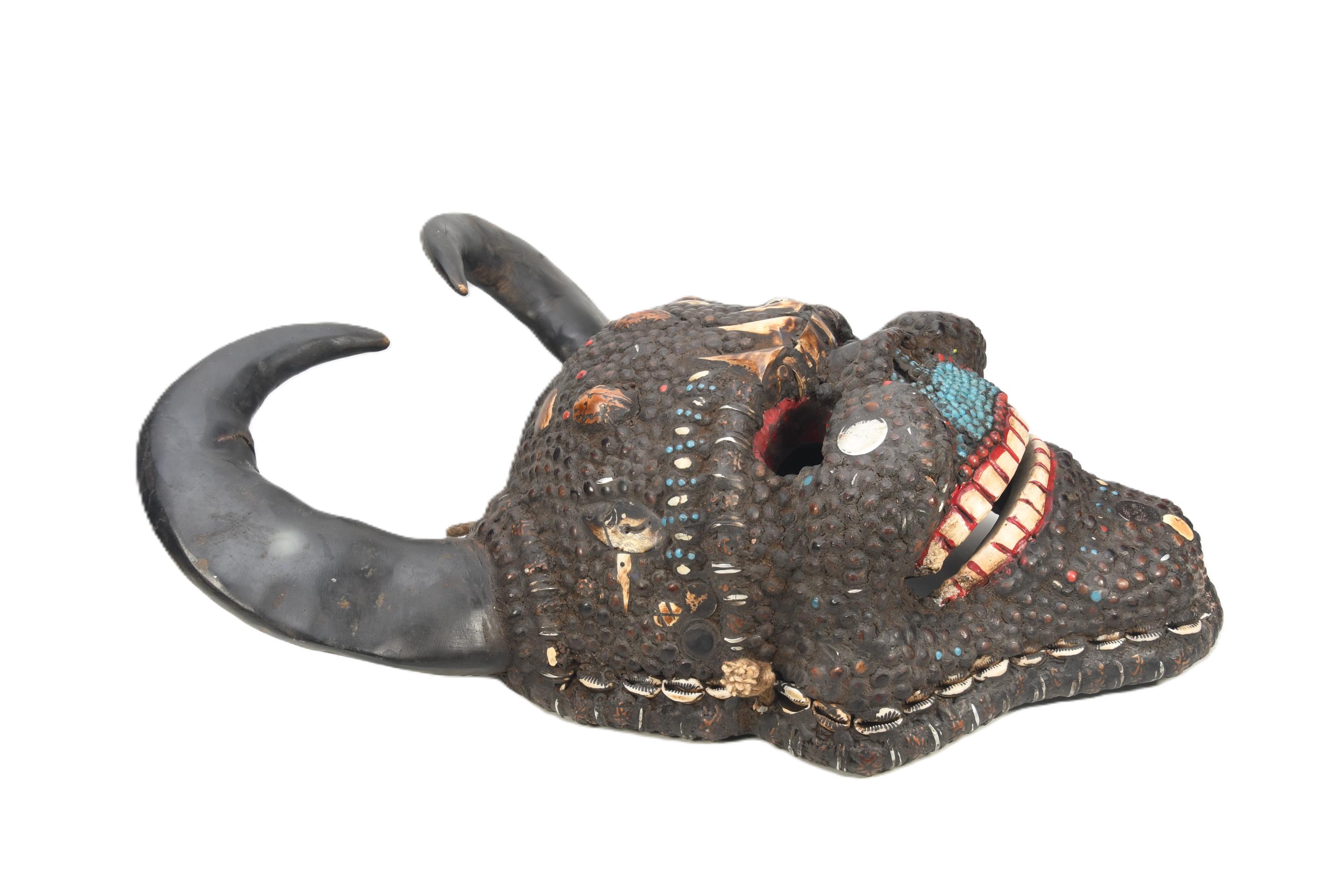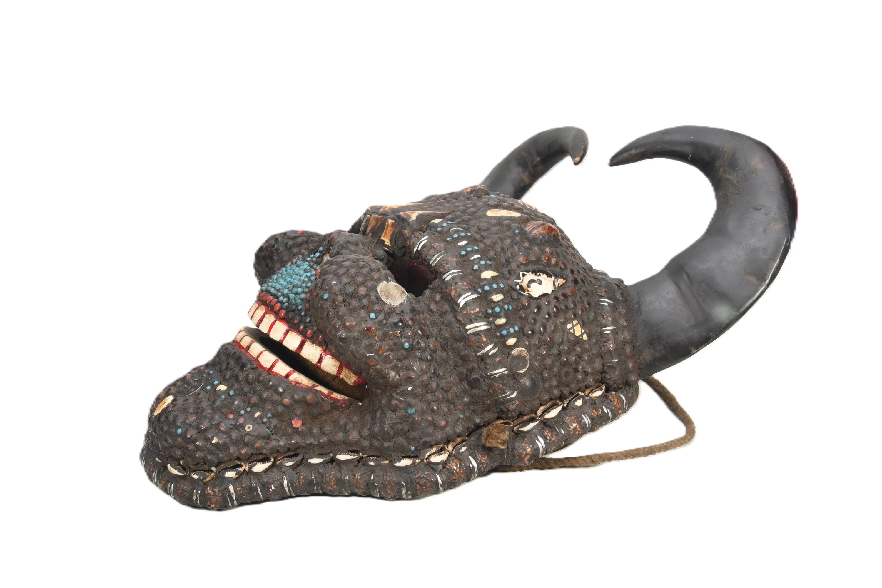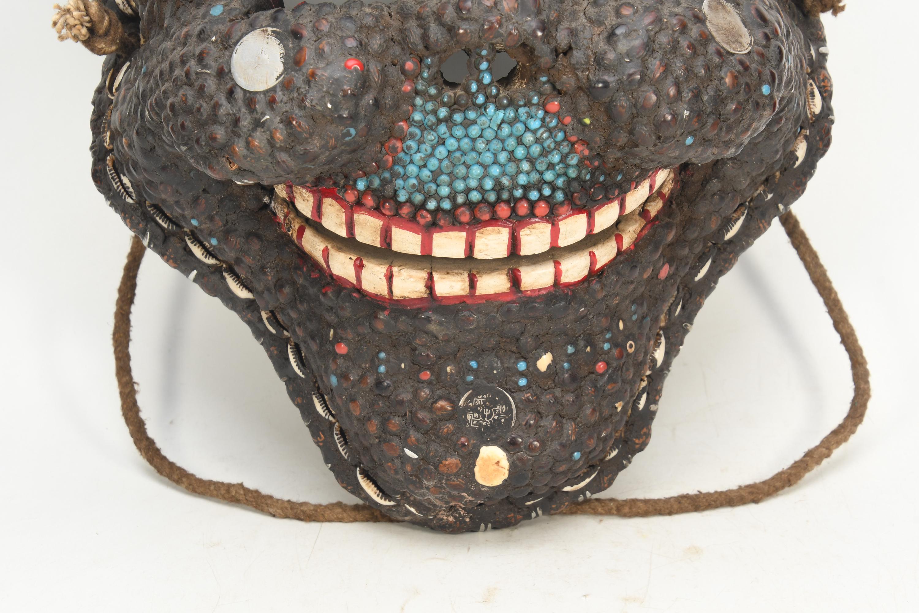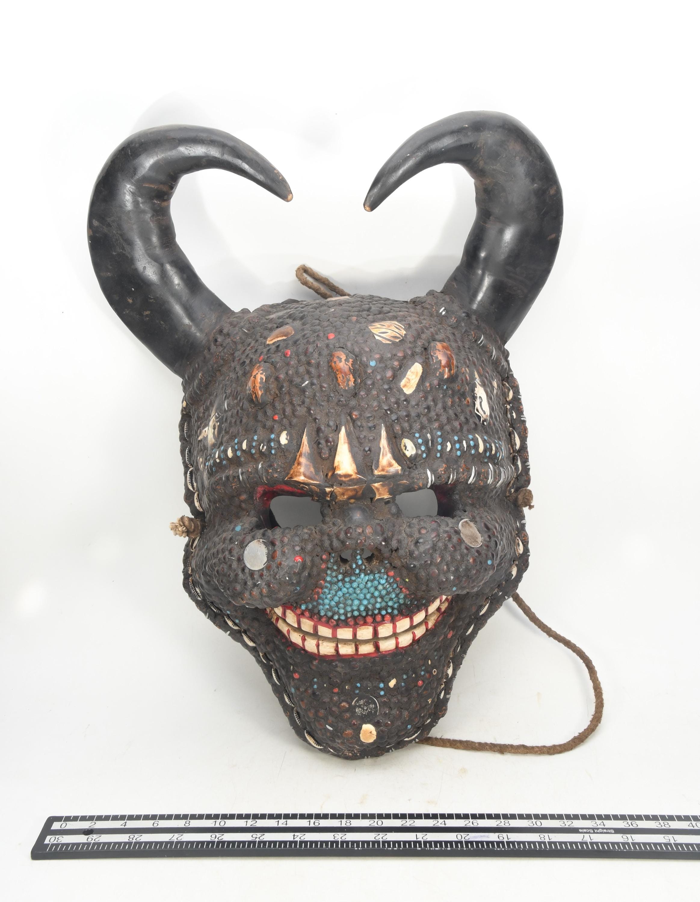 Rudraksha Beaded Tribal Citipati Mask – Horned Shaman, Vintage Wall Hanging