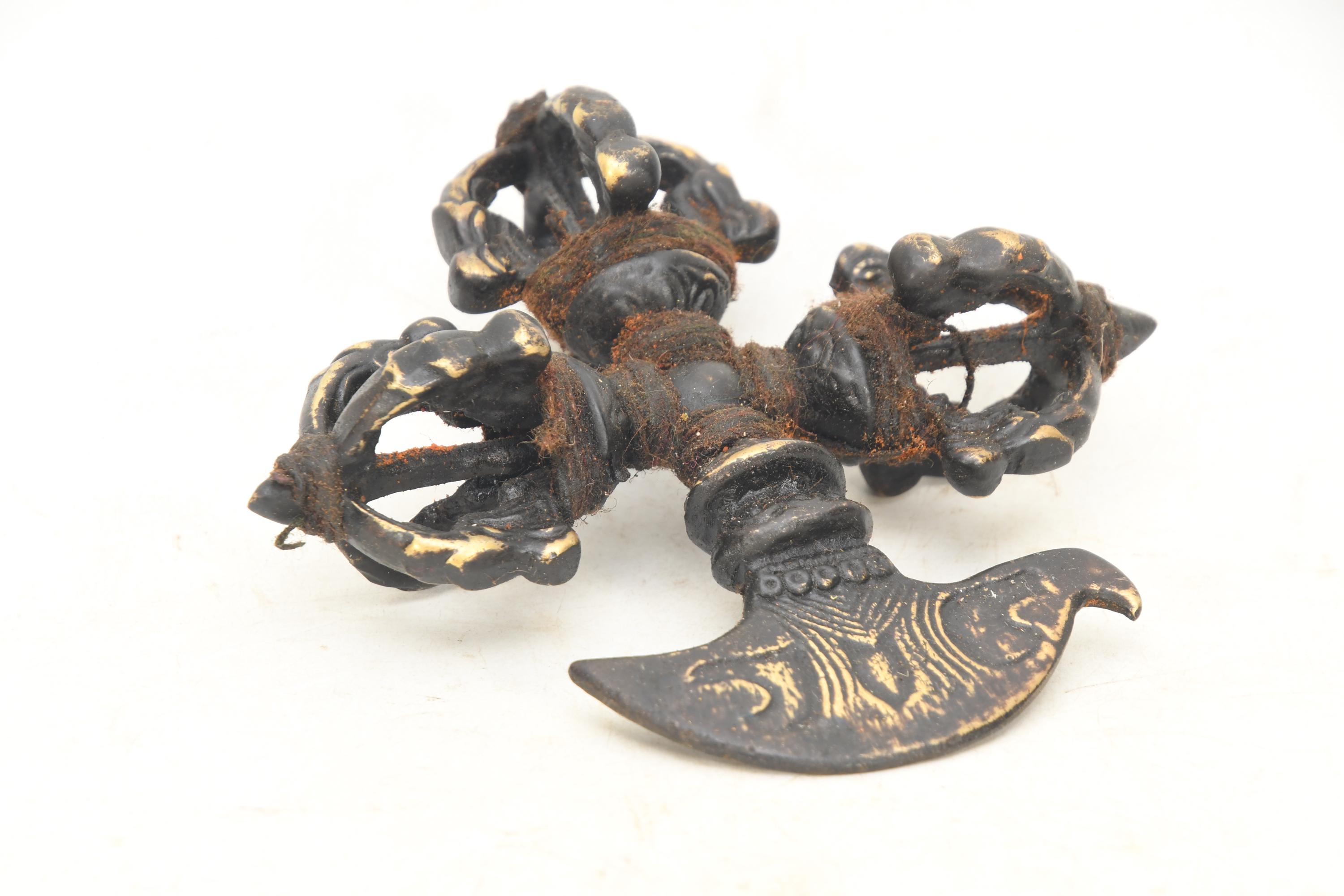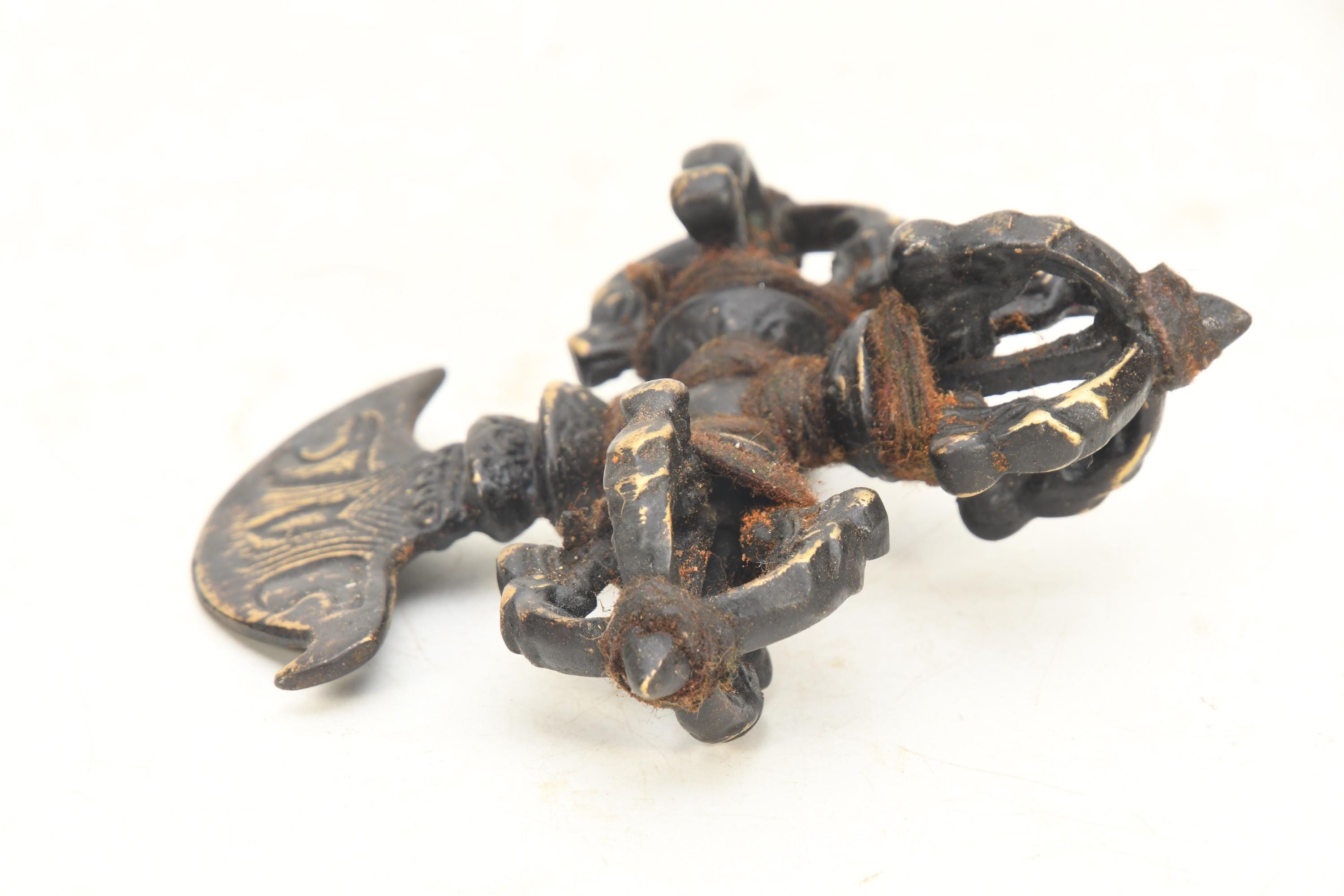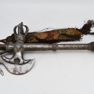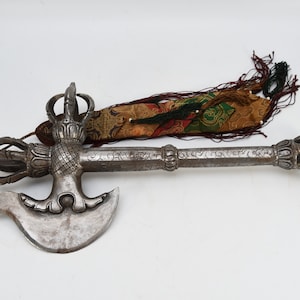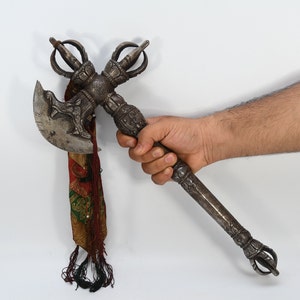 A khaṭvāṅga (Sanskrit: खट्वाङ्ग) is a long, studded club originally created as a weapon. It was adopted as a religious symbol in Indian religions such as Shaivism and Vajrayana Buddhism. The khatvāṅga was adopted by some lineages of historical tantra though it preceded such traditions. Very Rare Old and Antique item from Nepal.