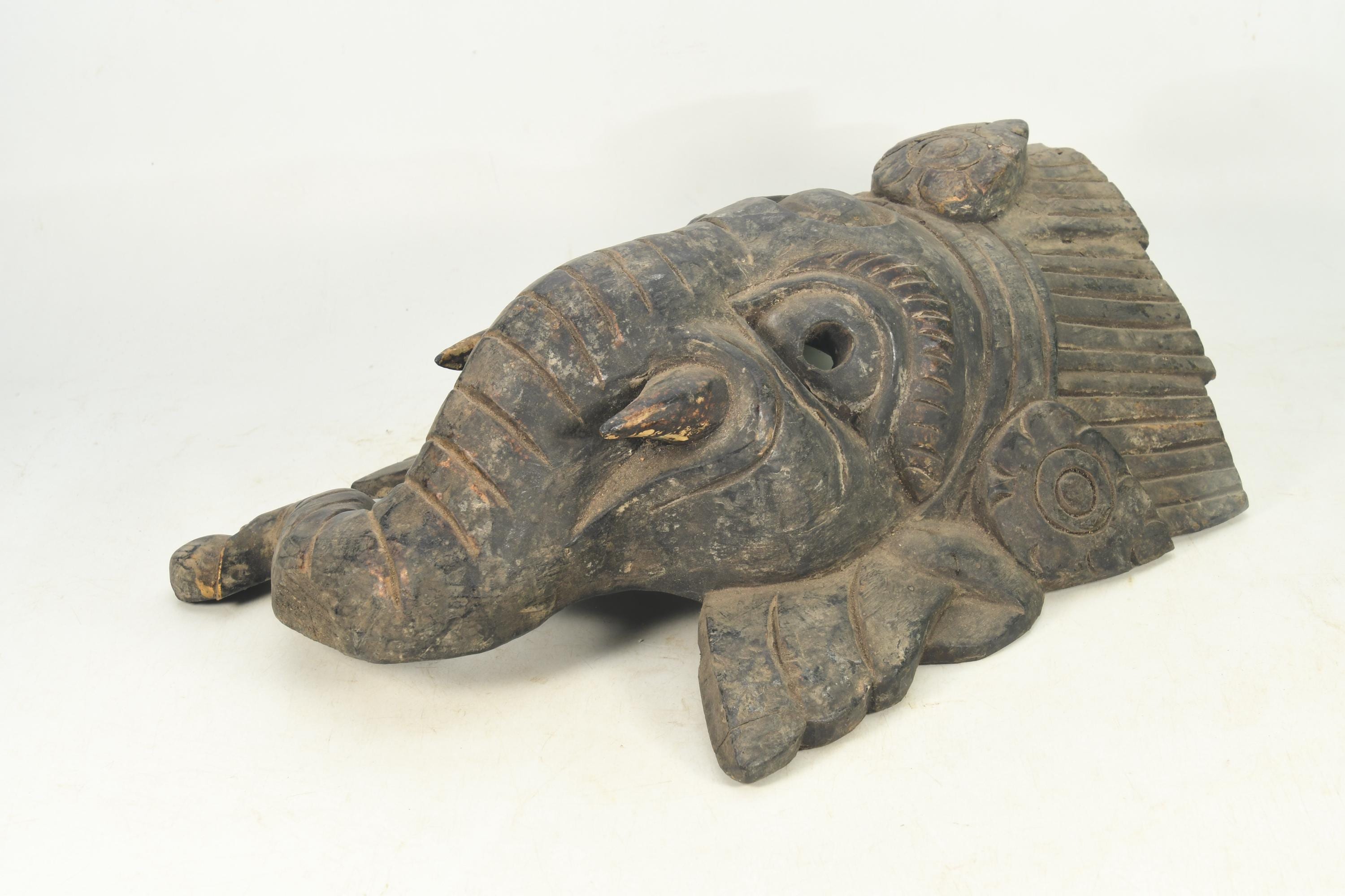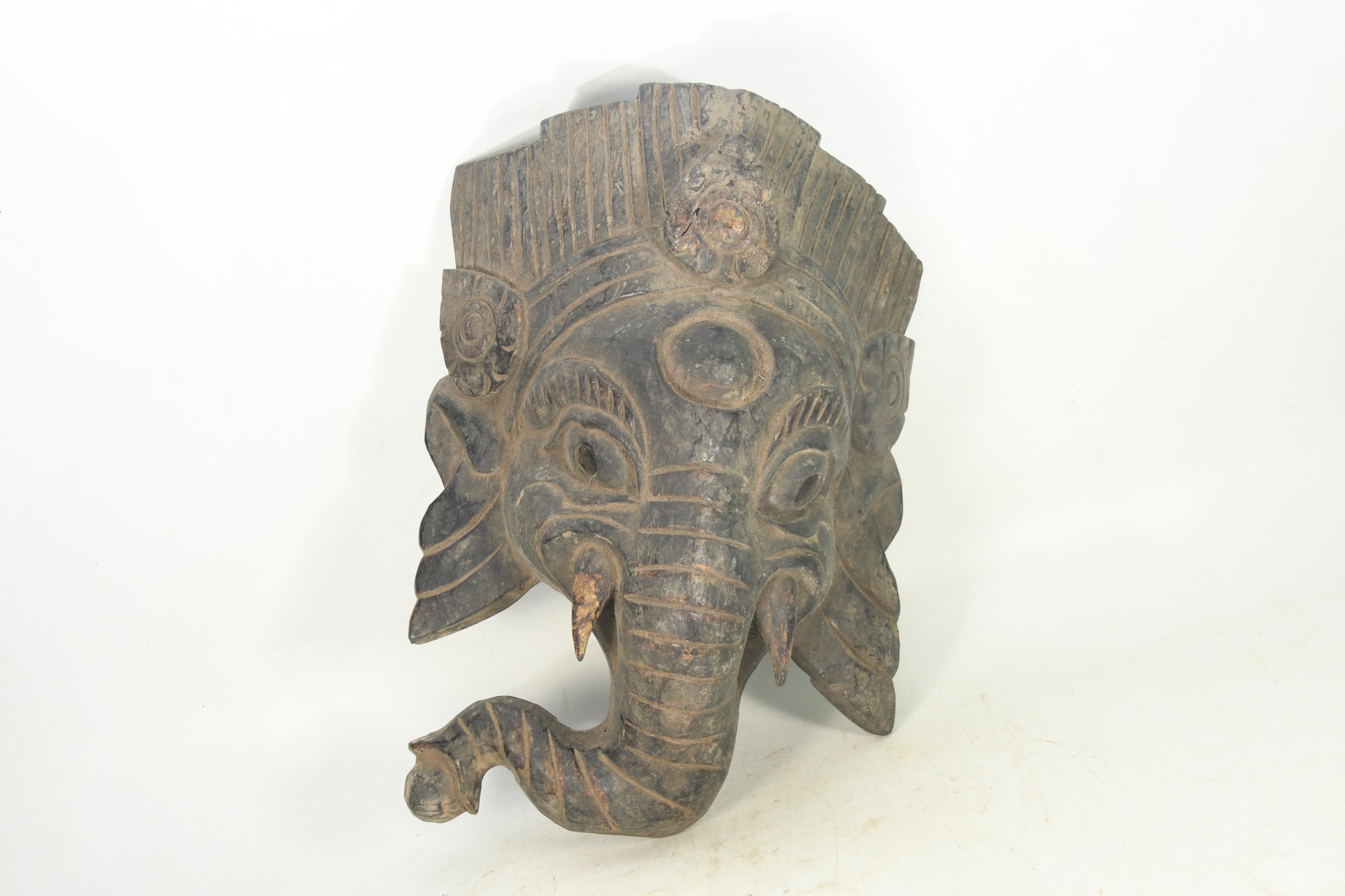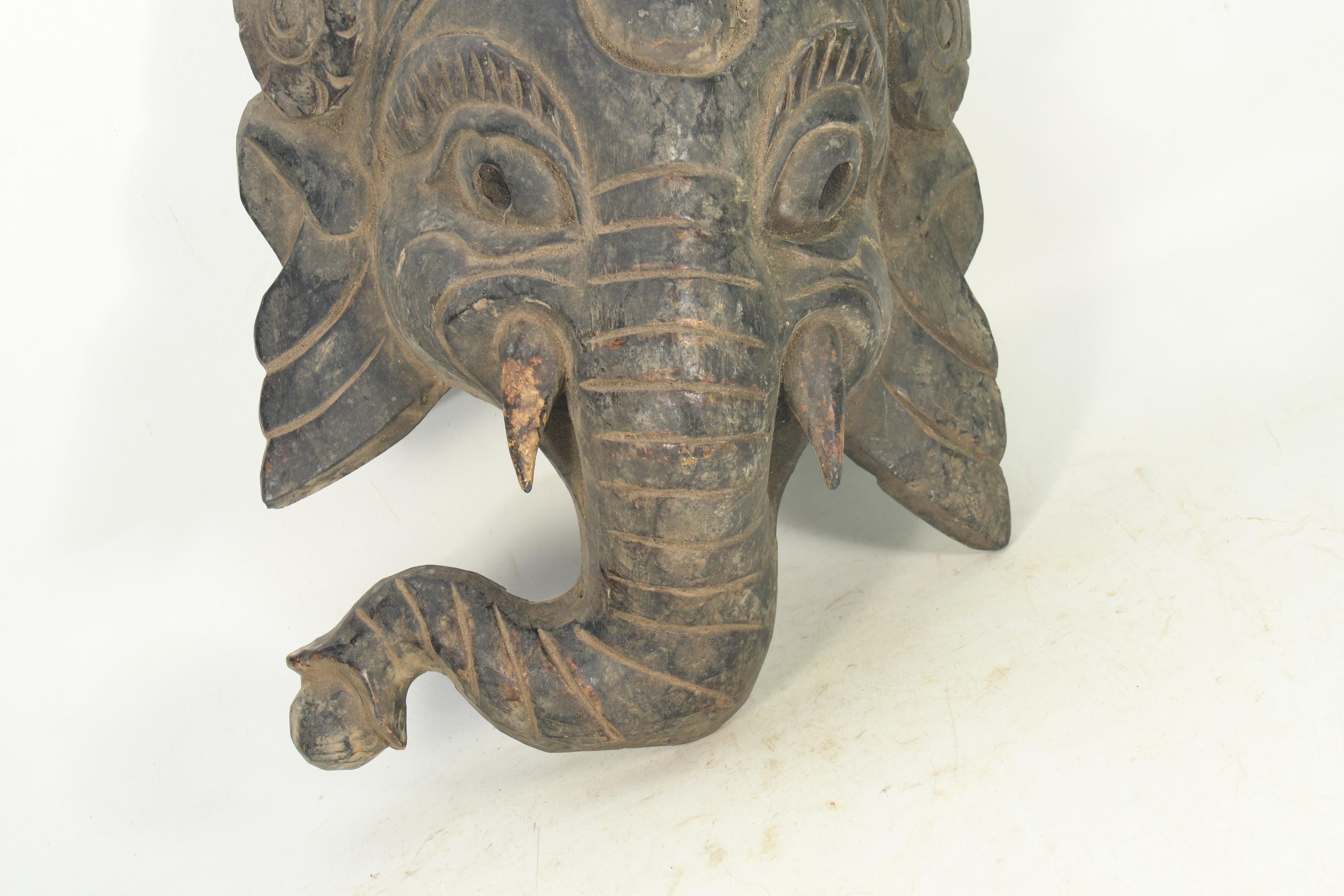 Hand Carved Wooden Ganesha Mask: Antique Tibetan Wall Decor