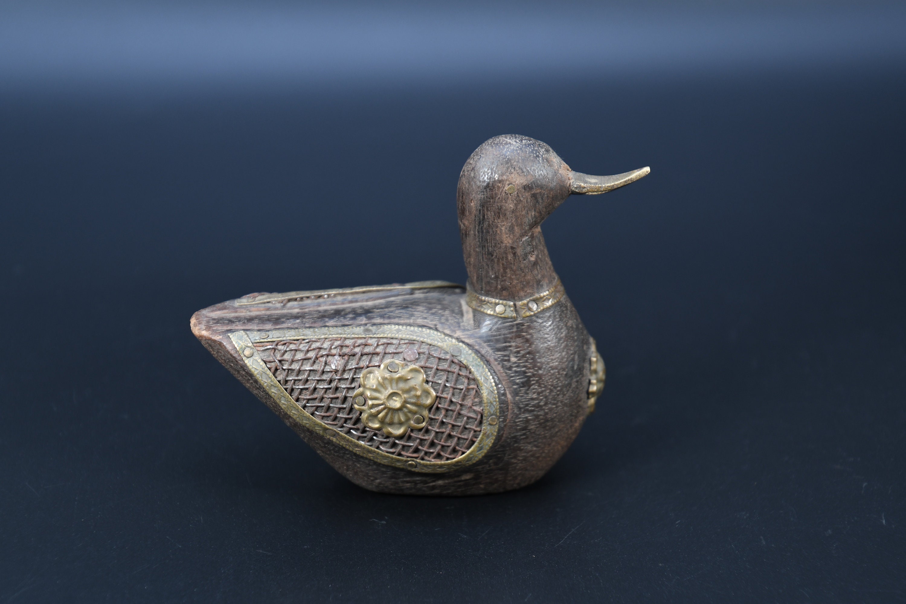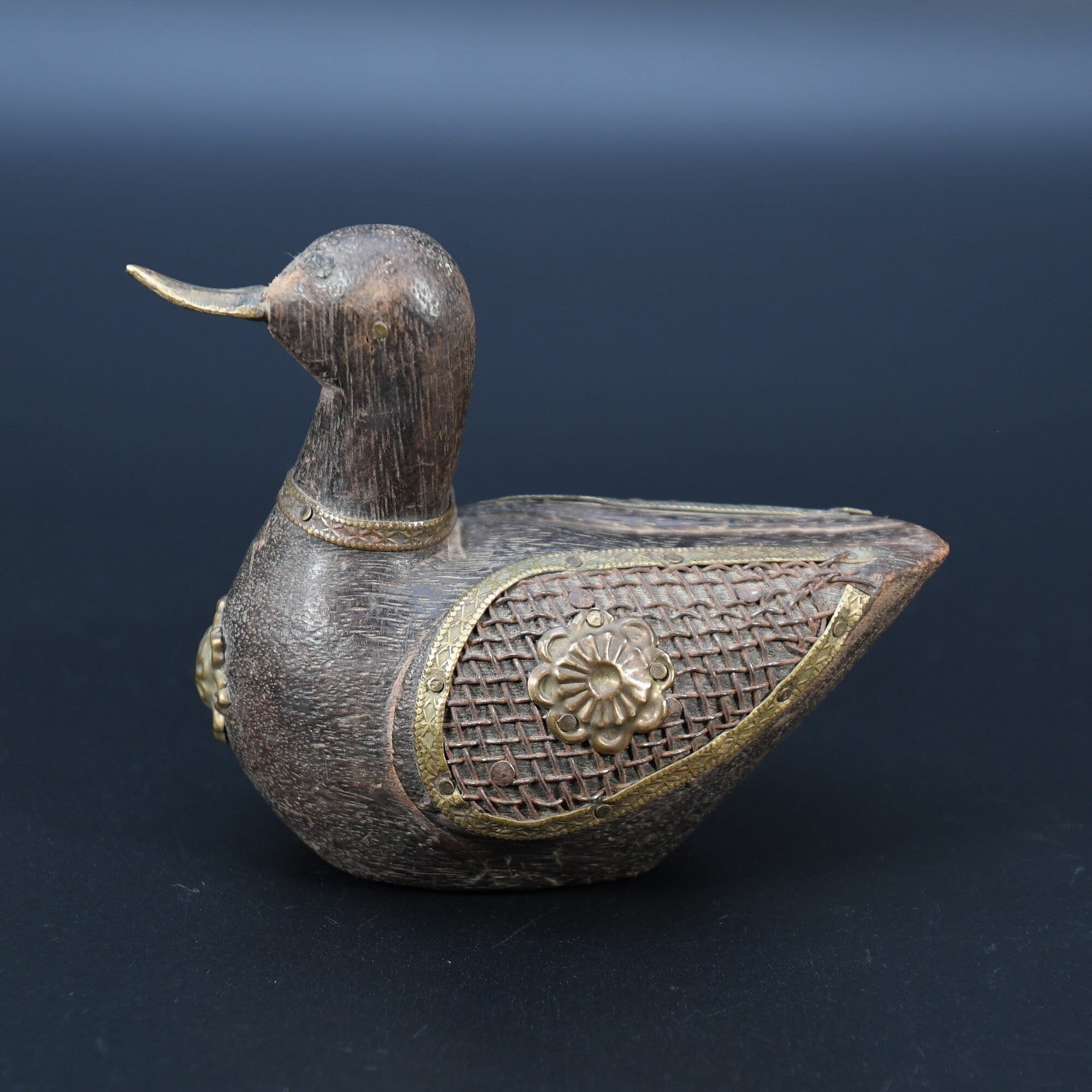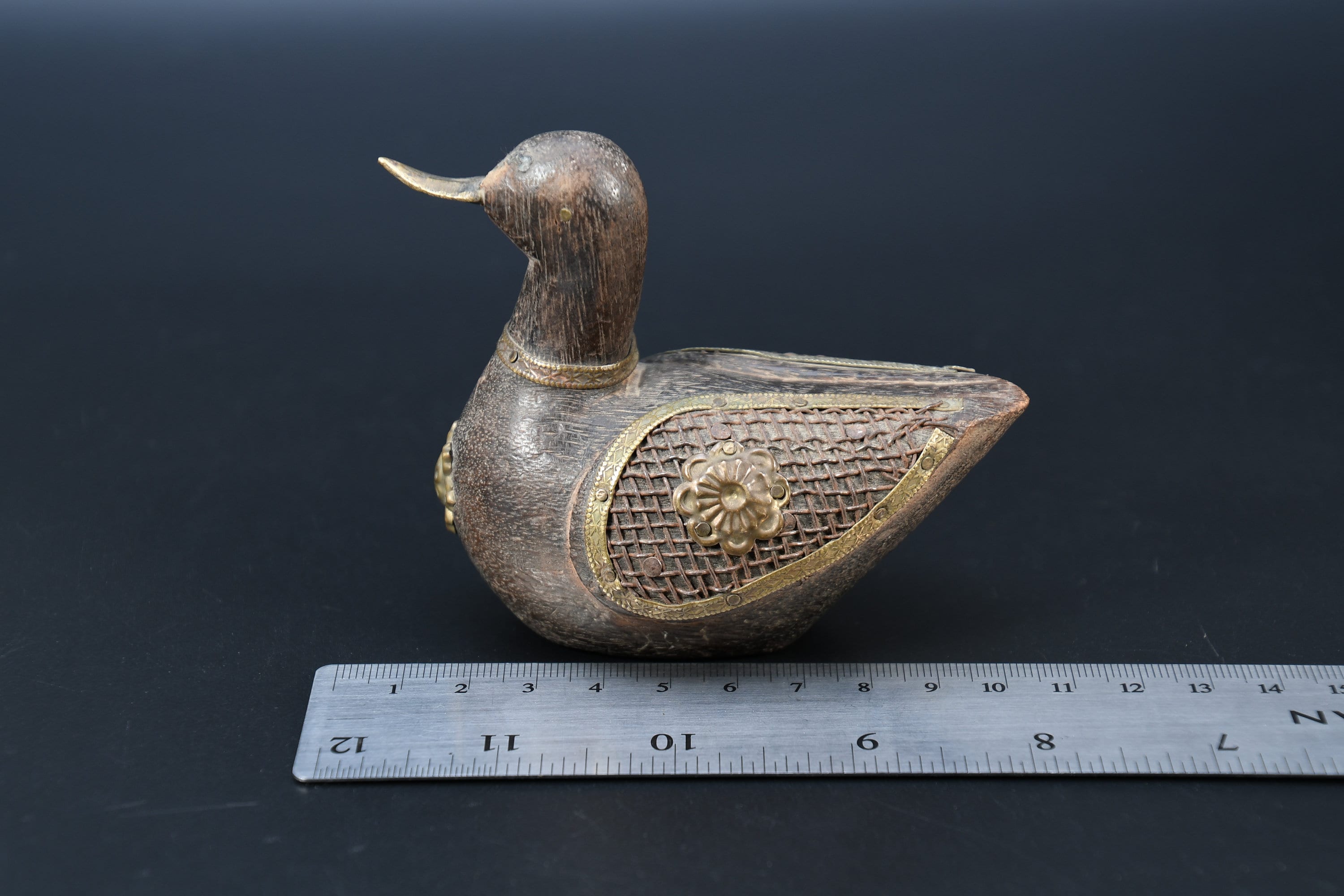 Vintage Hand Carved Wooden Duck Statue, Nepal Brass Details