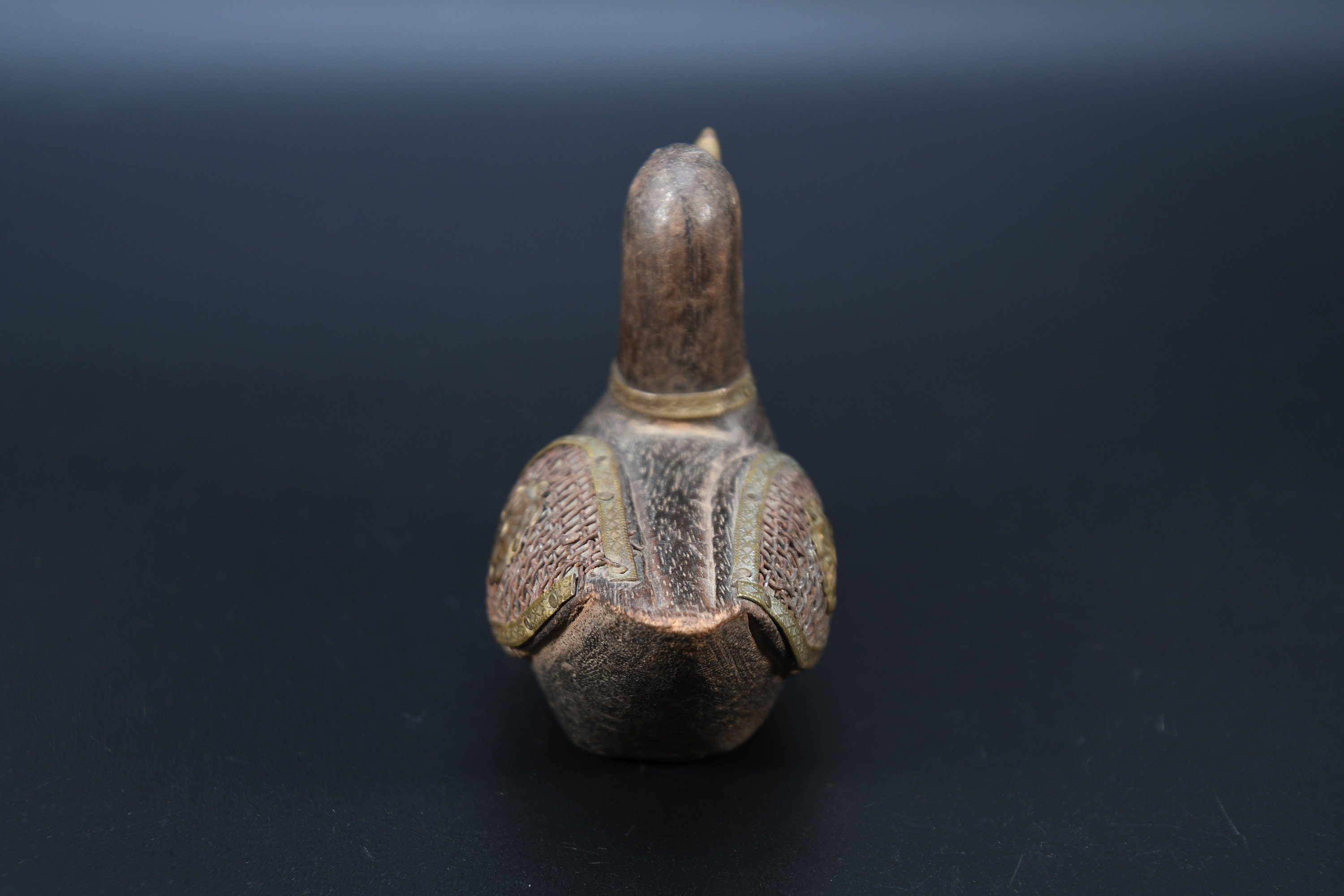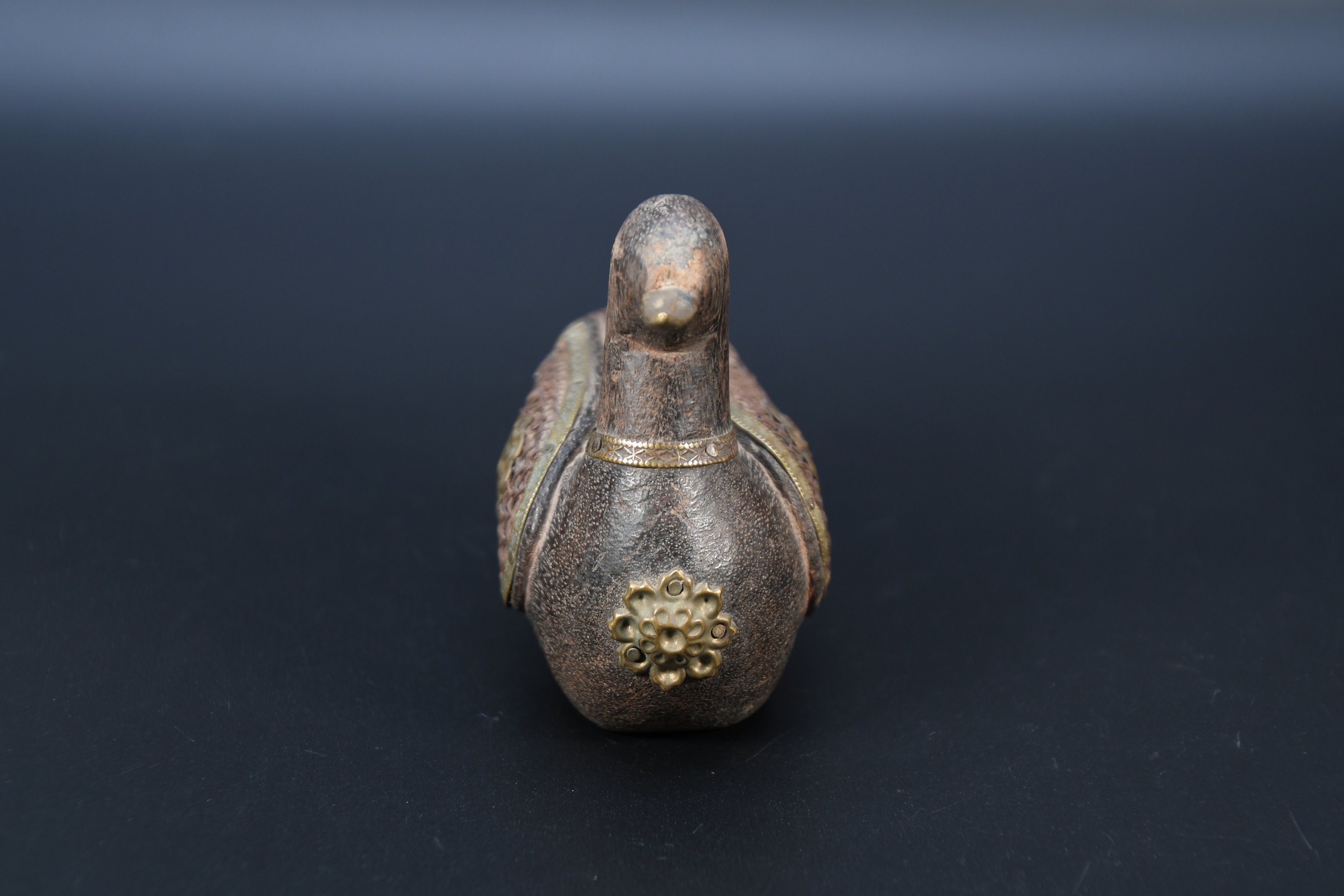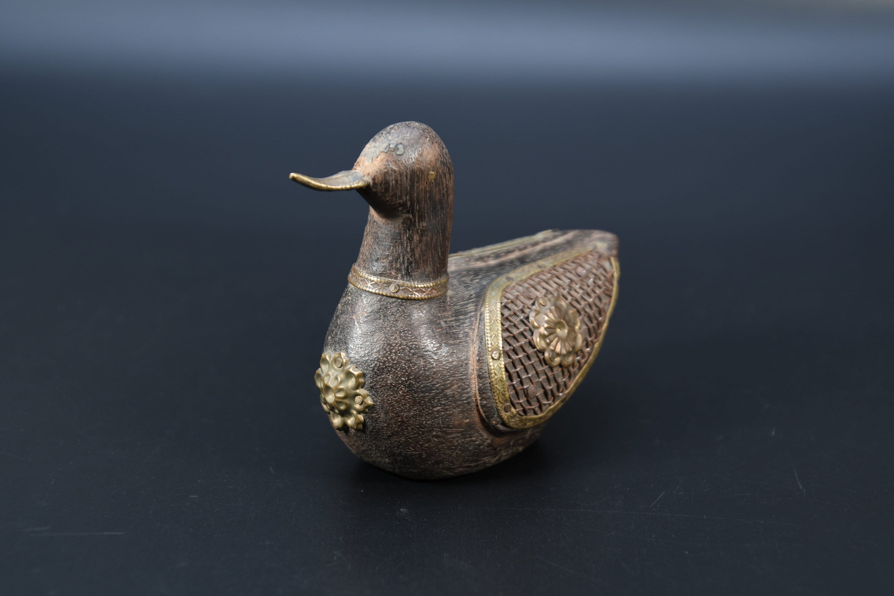 Vintage Hand Carved Wooden Duck Statue, Nepal Brass Details