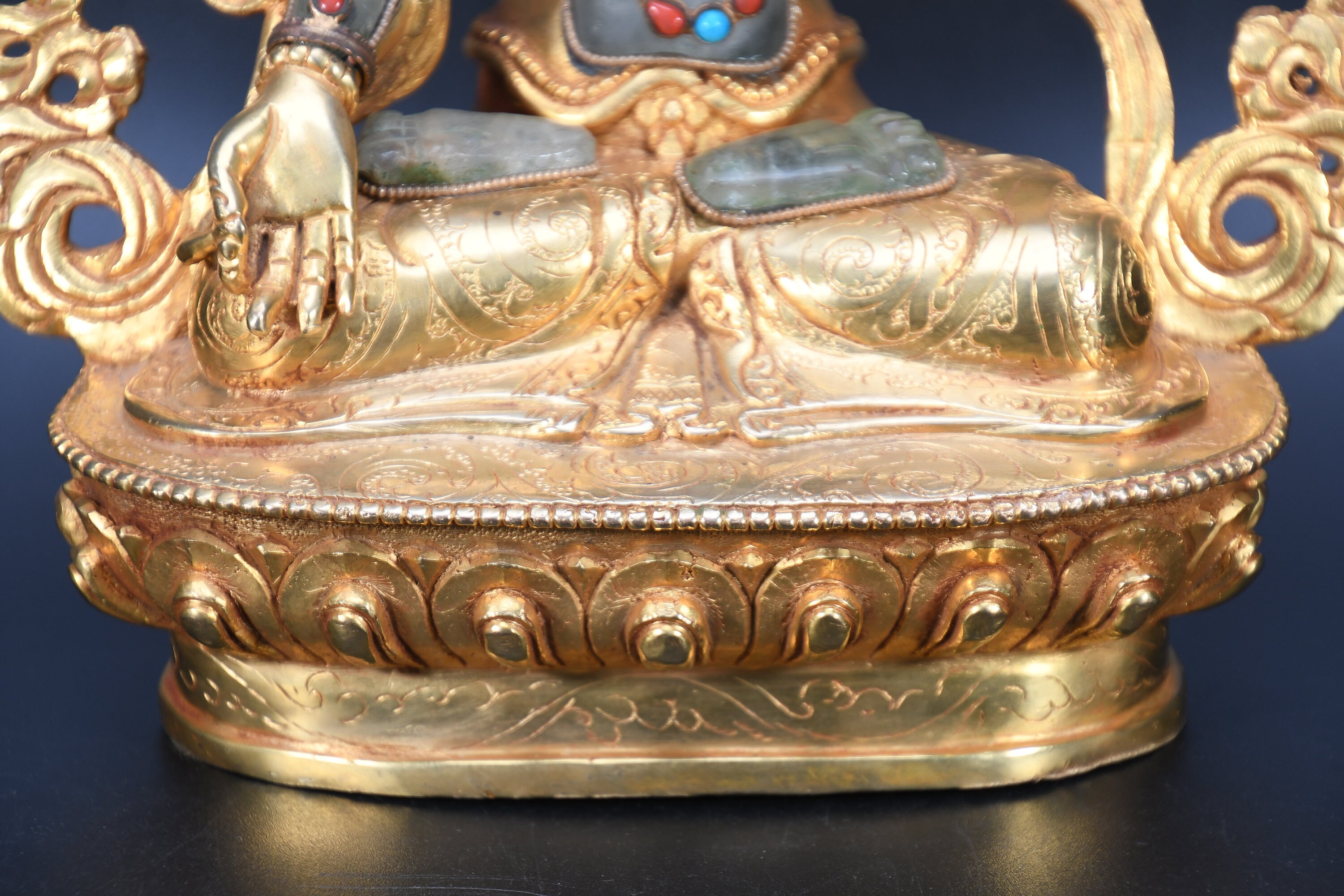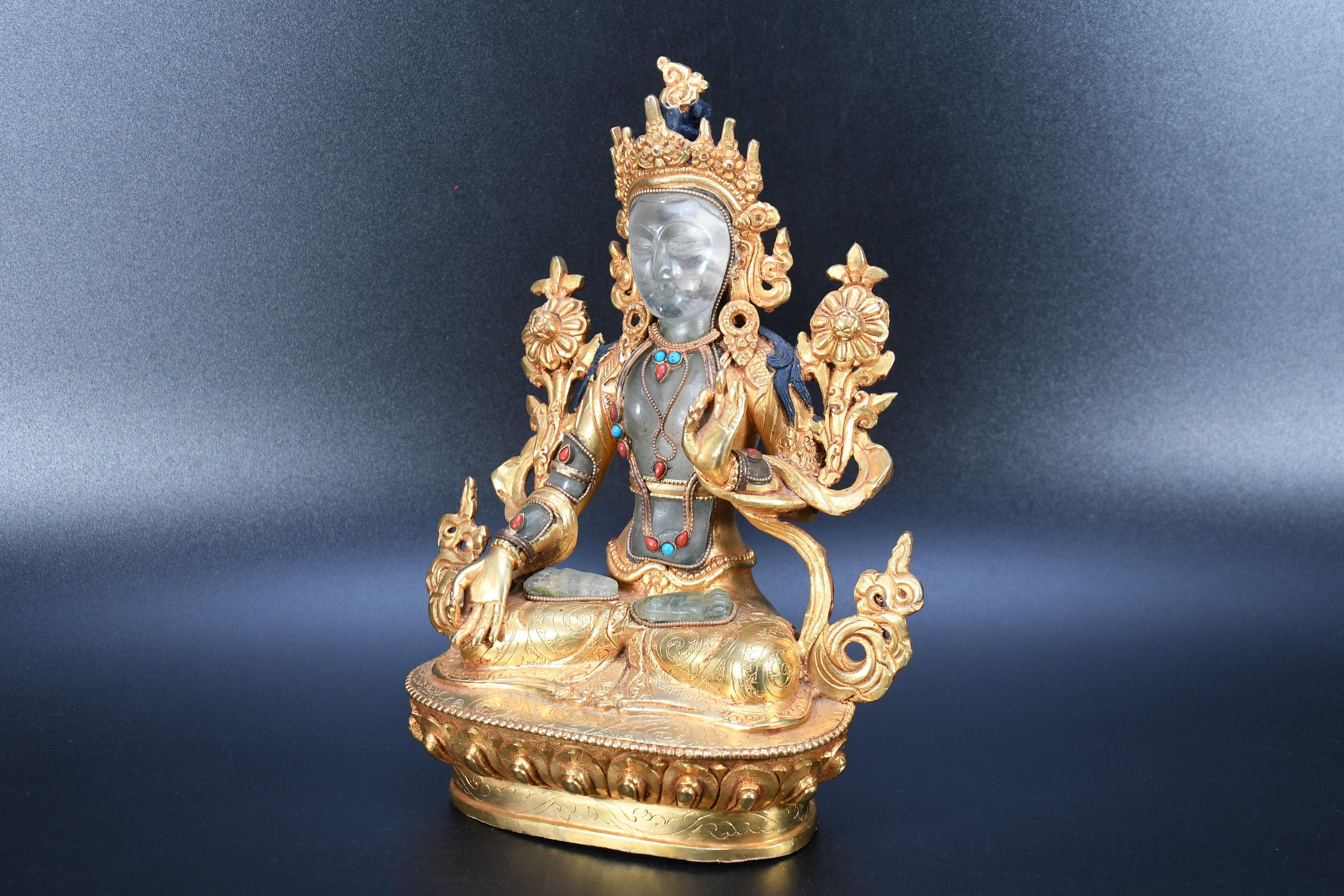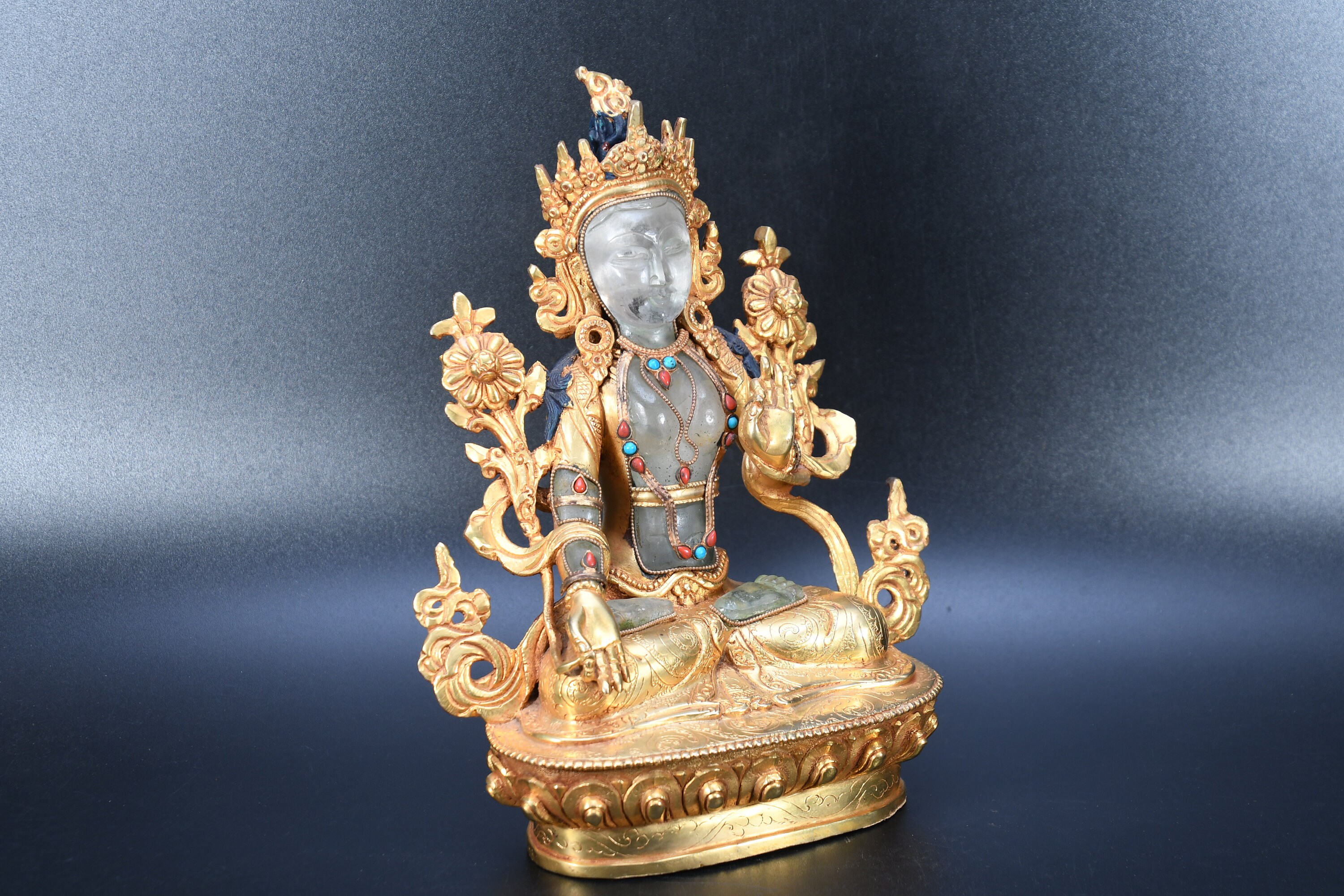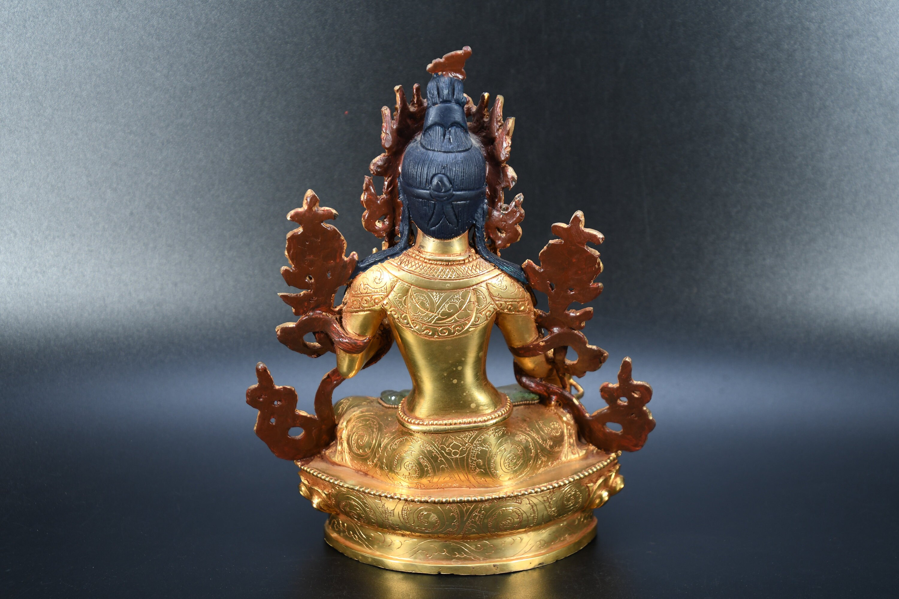 The Green Tara (Sanskrit: Shyamatara; Tibetan: Sgrol-ljang) was believed to be incarnated as the Nepali princess. She is considered by some to be the original Tara and is the female consort of Amoghasiddhi (see Dhyani-Buddha), one of the “self-born” buddhas. She is generally shown seated on a lotus throne with right leg hanging down, wearing the ornaments of a bodhisattva and holding the closed blue lotus (utpala).
