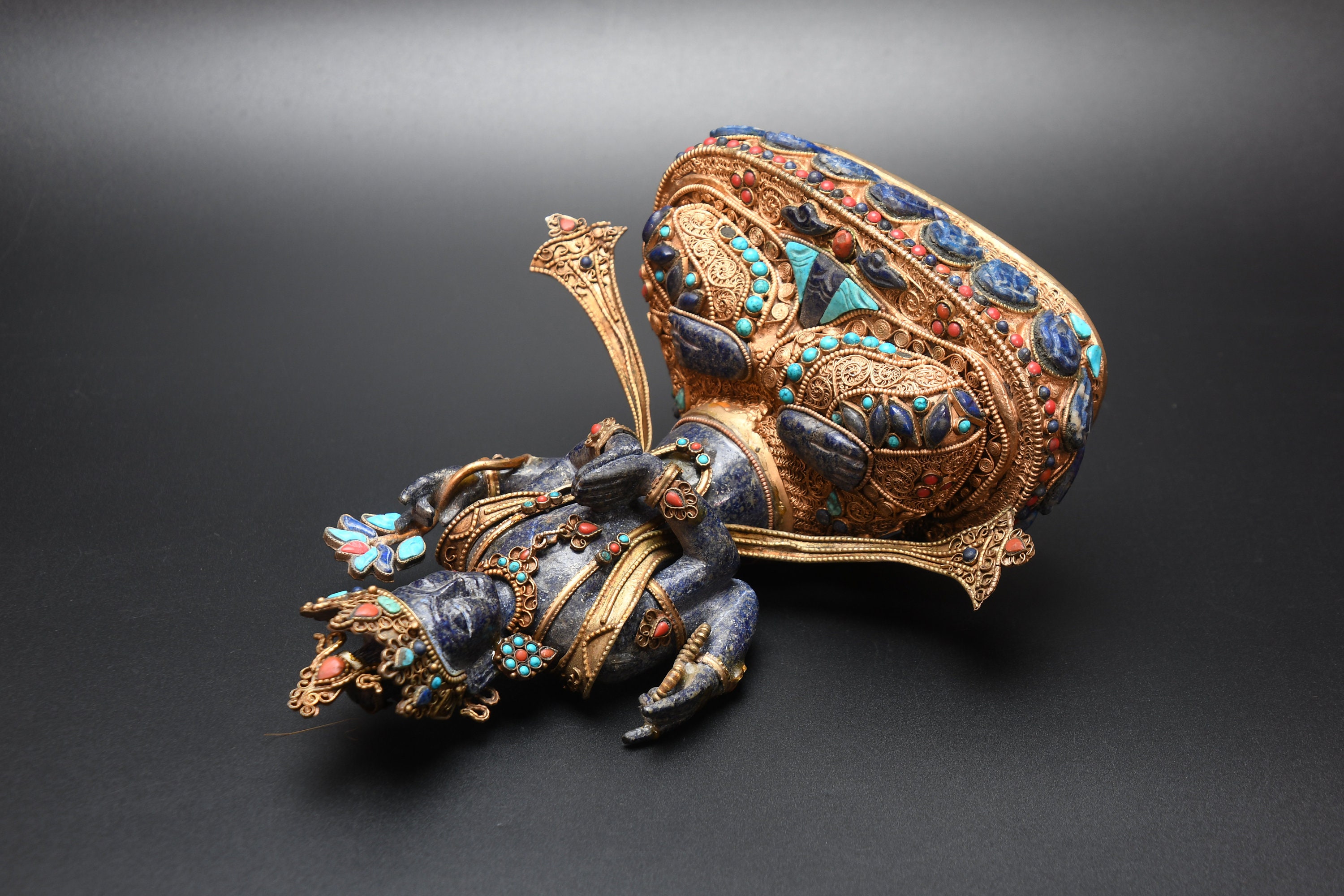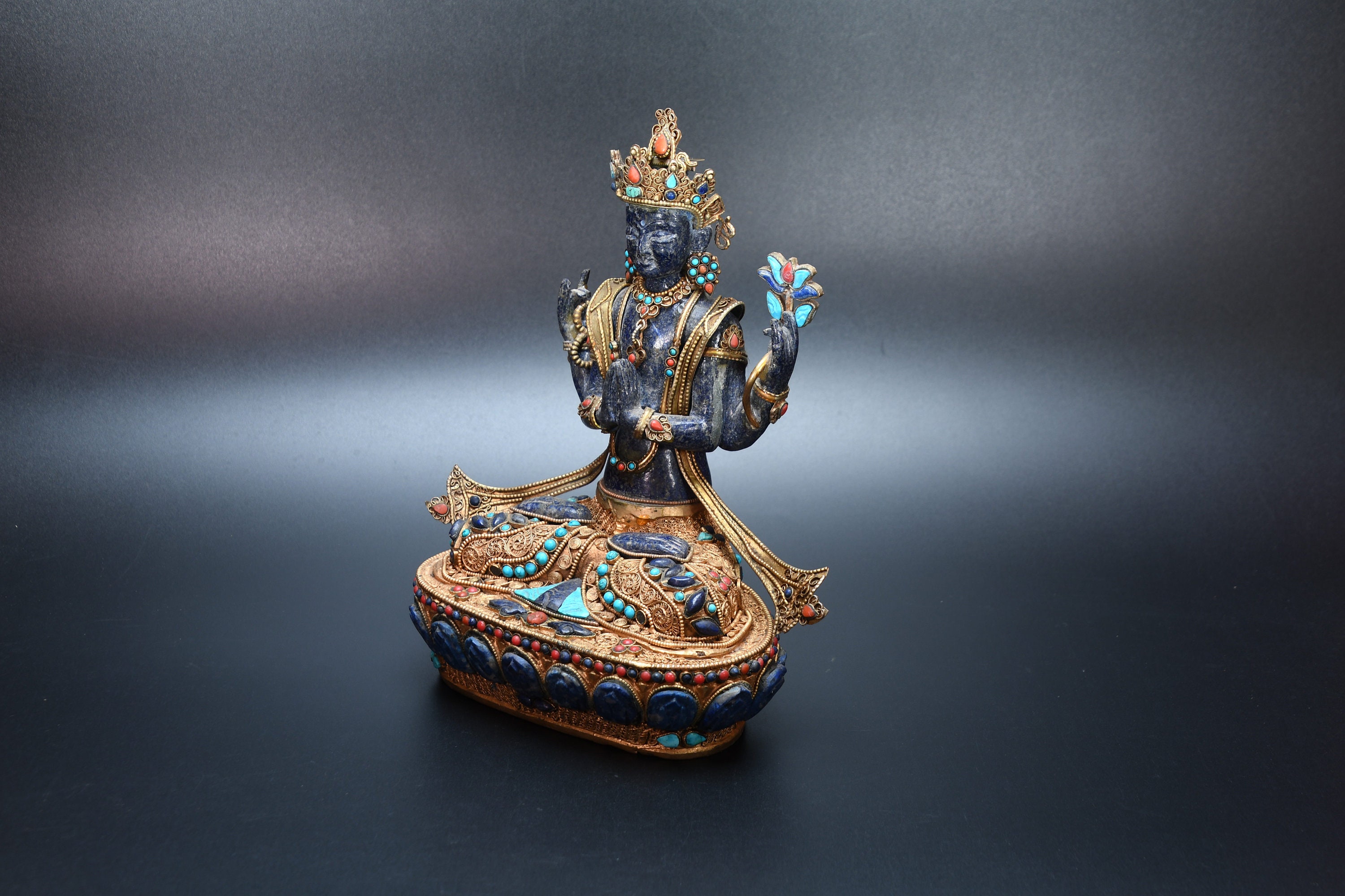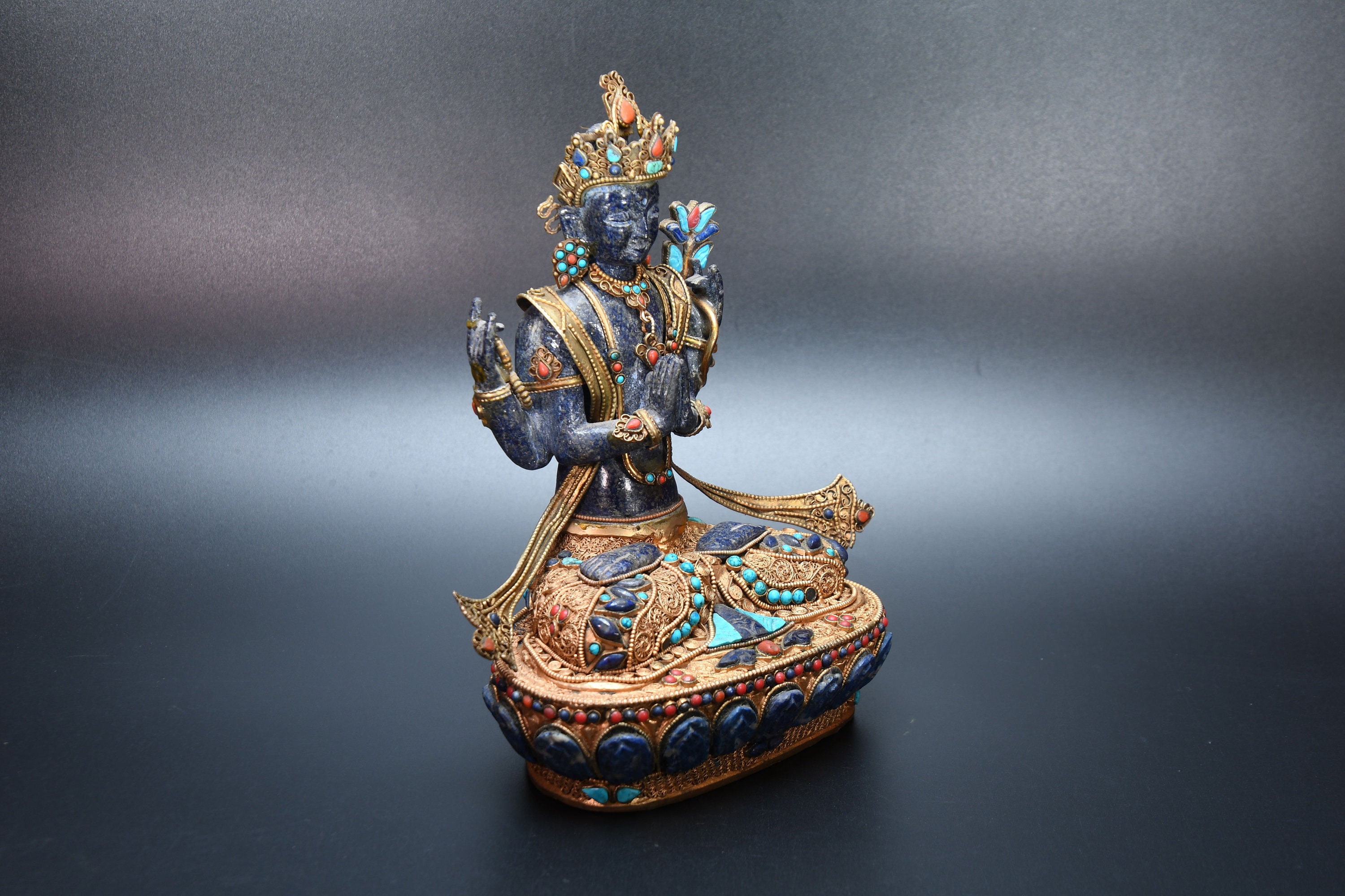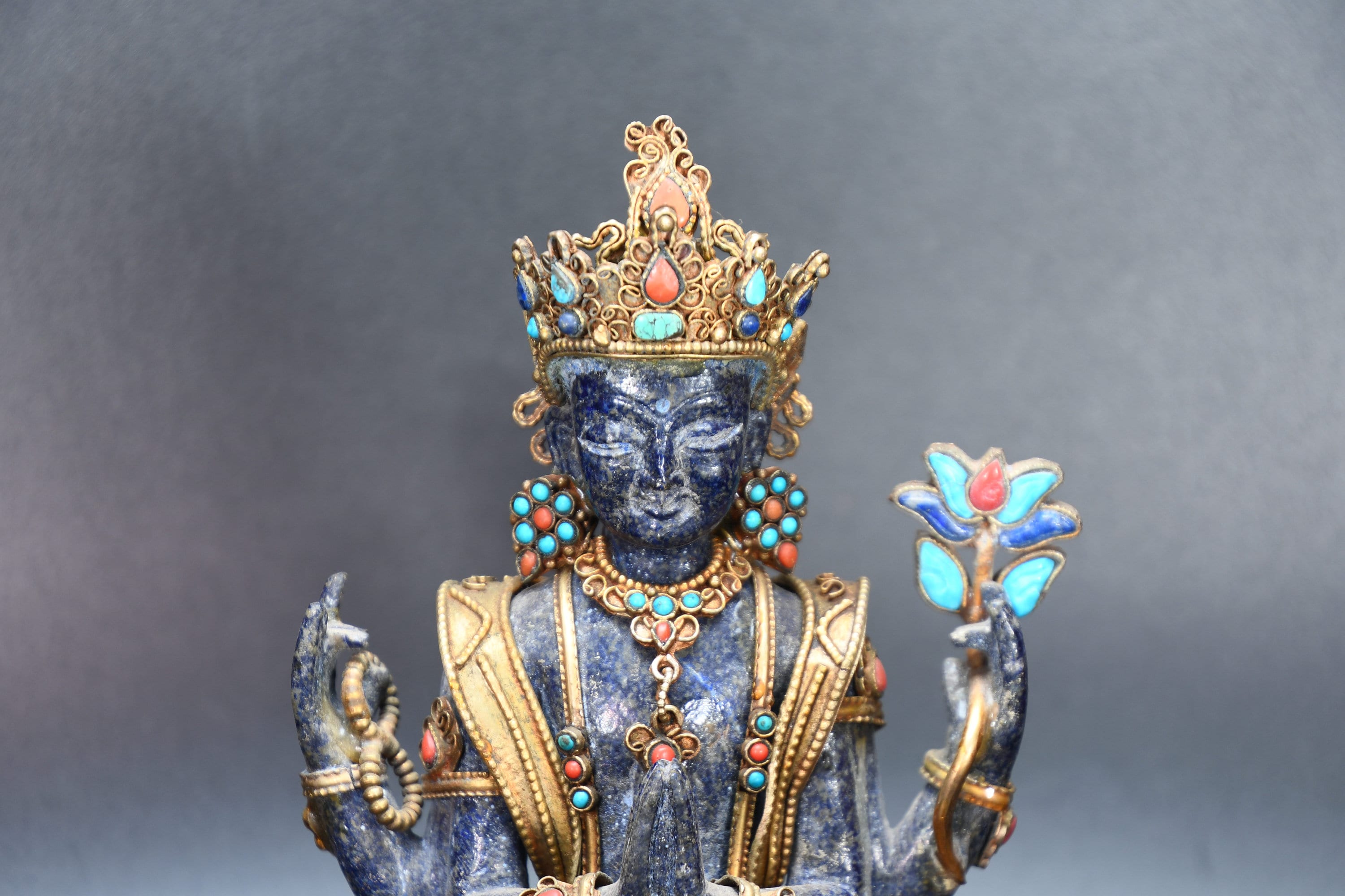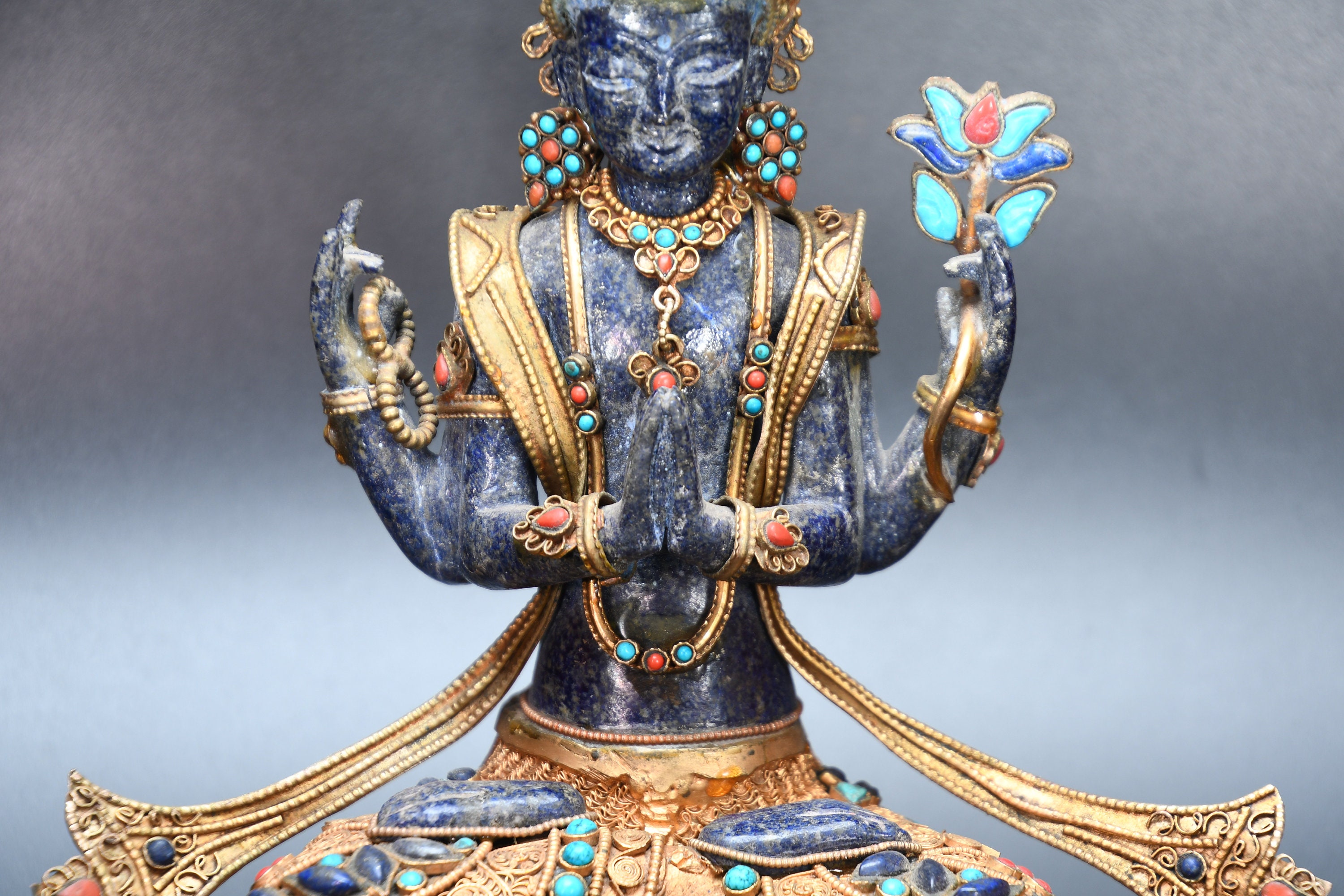 An absolutely astonishing one-of-a-kind Shakyamuni Buddha statue! We've never seen anything quite like it. Handmade in Nepal by a 4th and 5th generation crafting family, the statue is made of hand carved quartz crystal that is wrapped in bronze and then gold-plated. It is hand detailed and expertly carved by master craftsmen. This process takes considerable time and skill. The details are truly incredible, including pieces of hand inlaid antique coral and intricately etched designs.