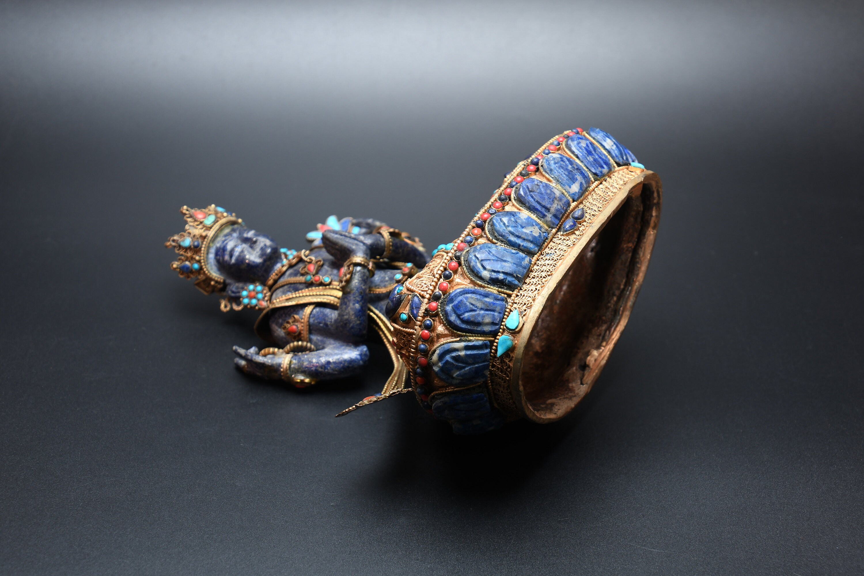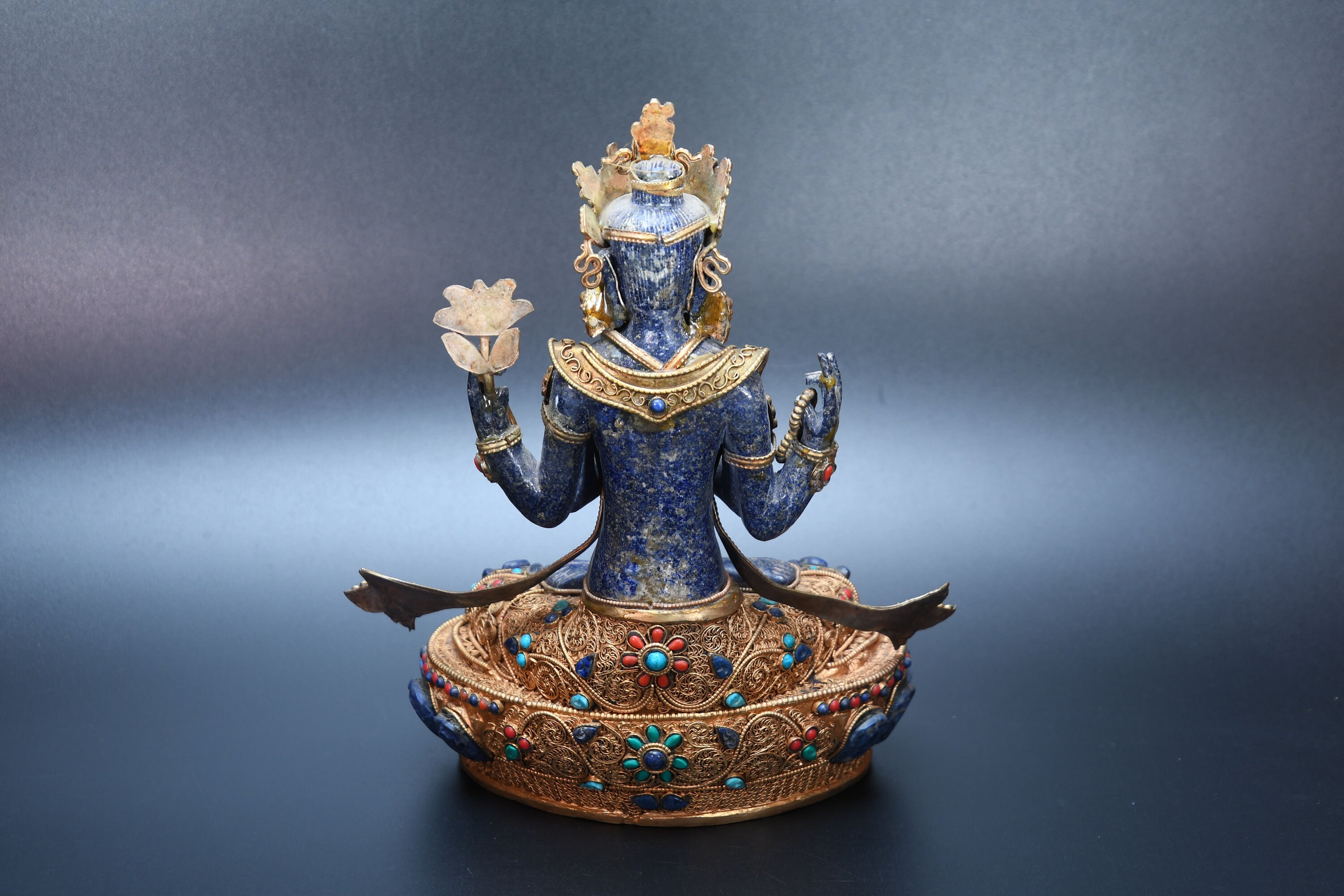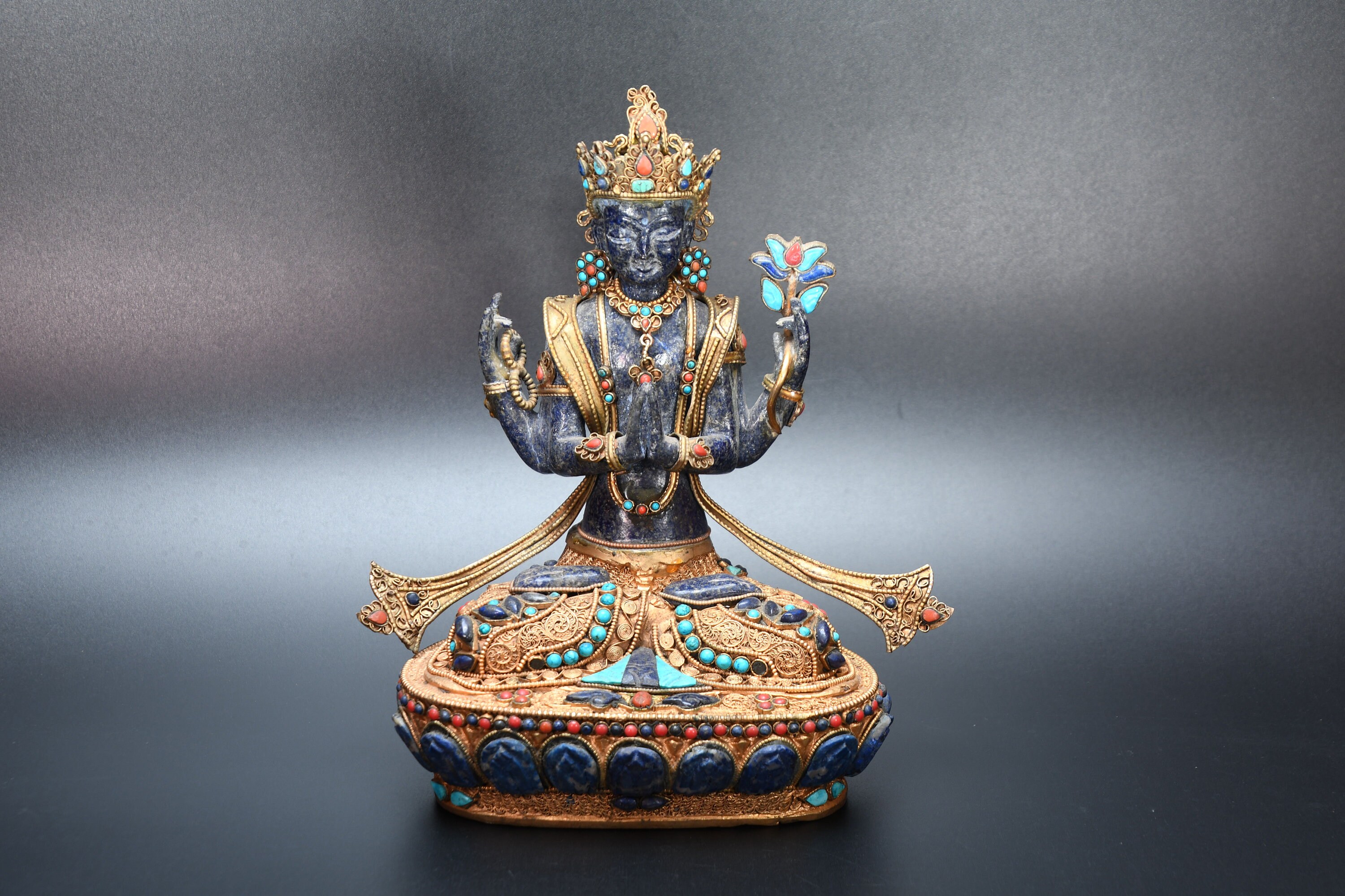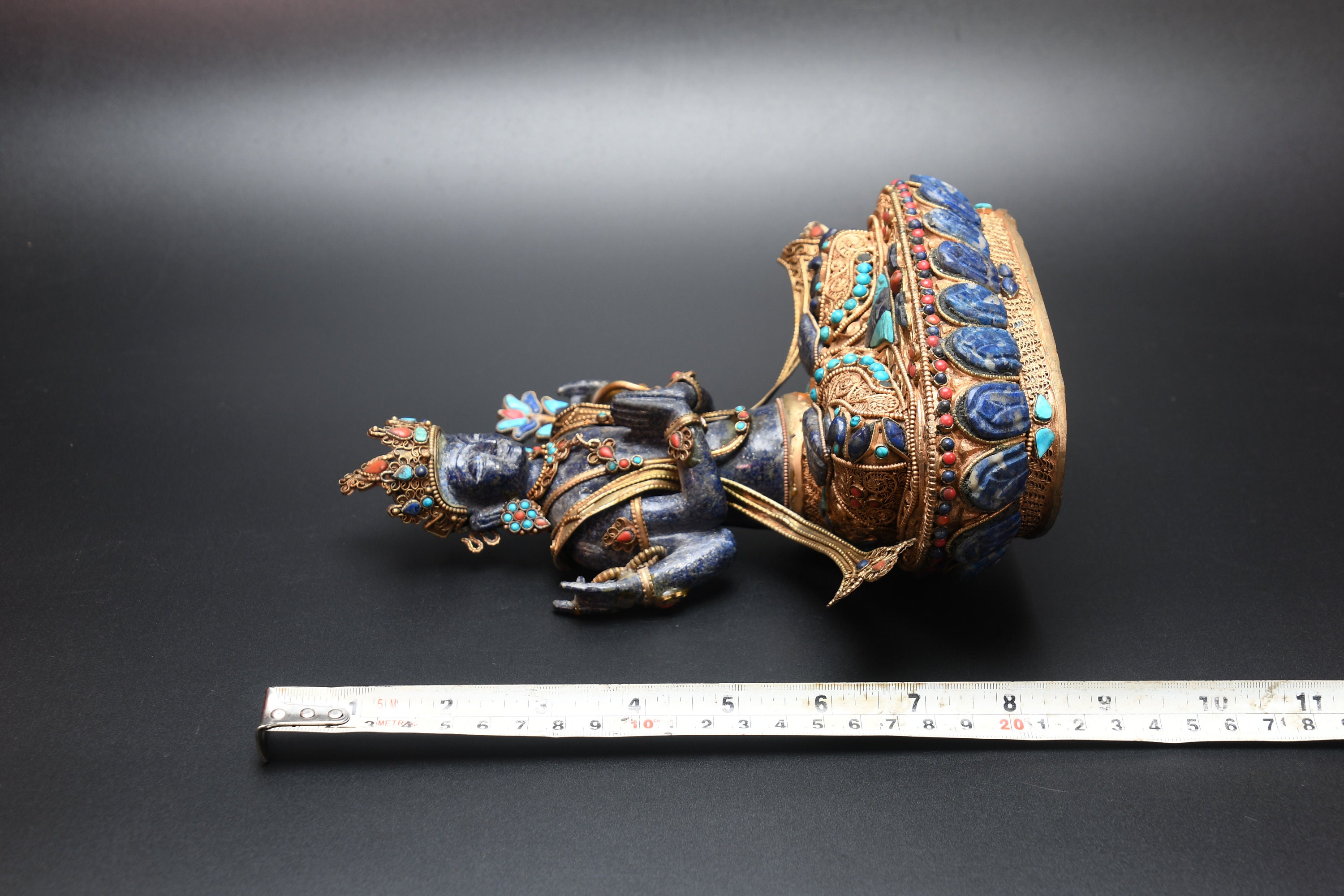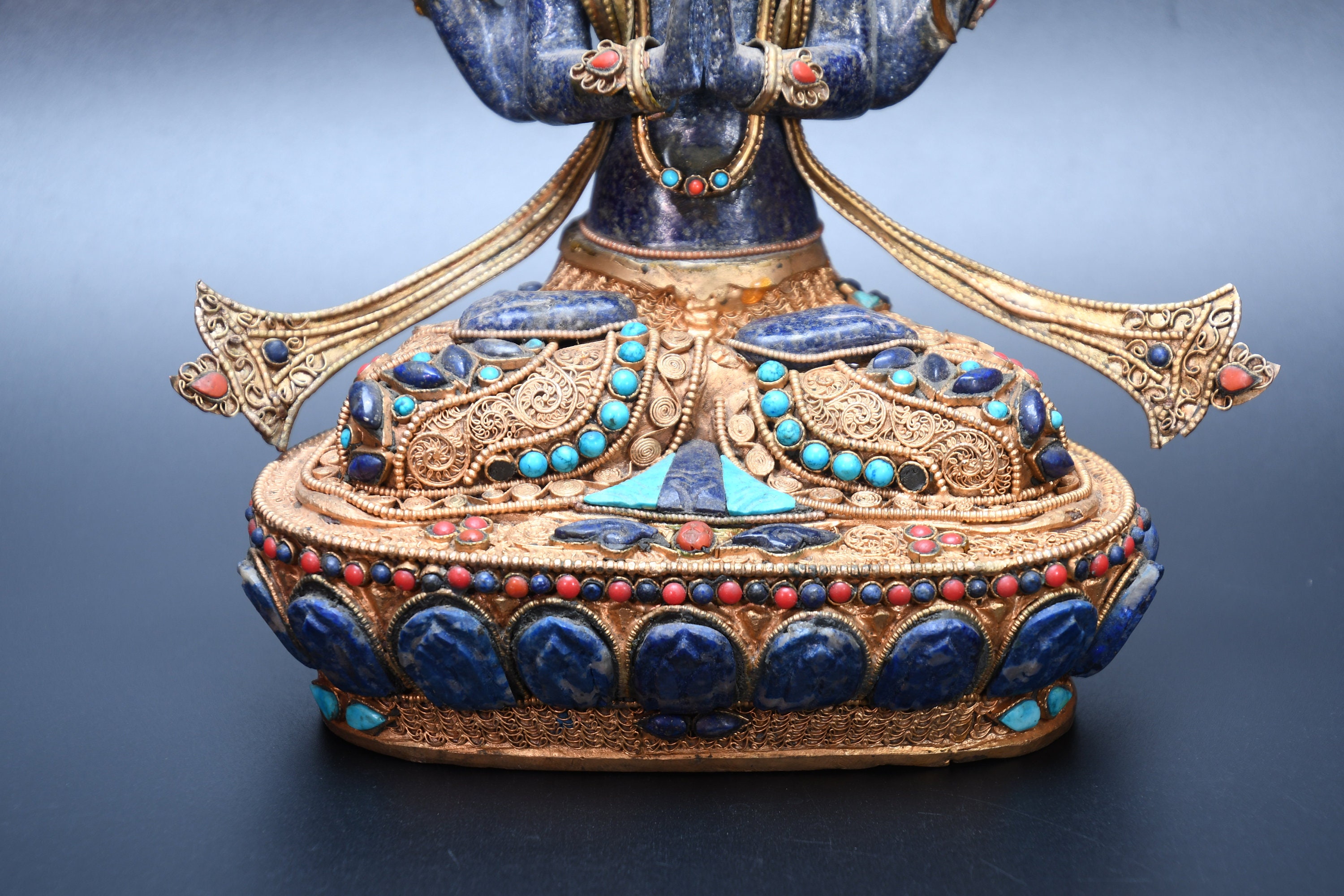 An absolutely astonishing one-of-a-kind Shakyamuni Buddha statue! We've never seen anything quite like it. Handmade in Nepal by a 4th and 5th generation crafting family, the statue is made of hand carved quartz crystal that is wrapped in bronze and then gold-plated. It is hand detailed and expertly carved by master craftsmen. This process takes considerable time and skill. The details are truly incredible, including pieces of hand inlaid antique coral and intricately etched designs.