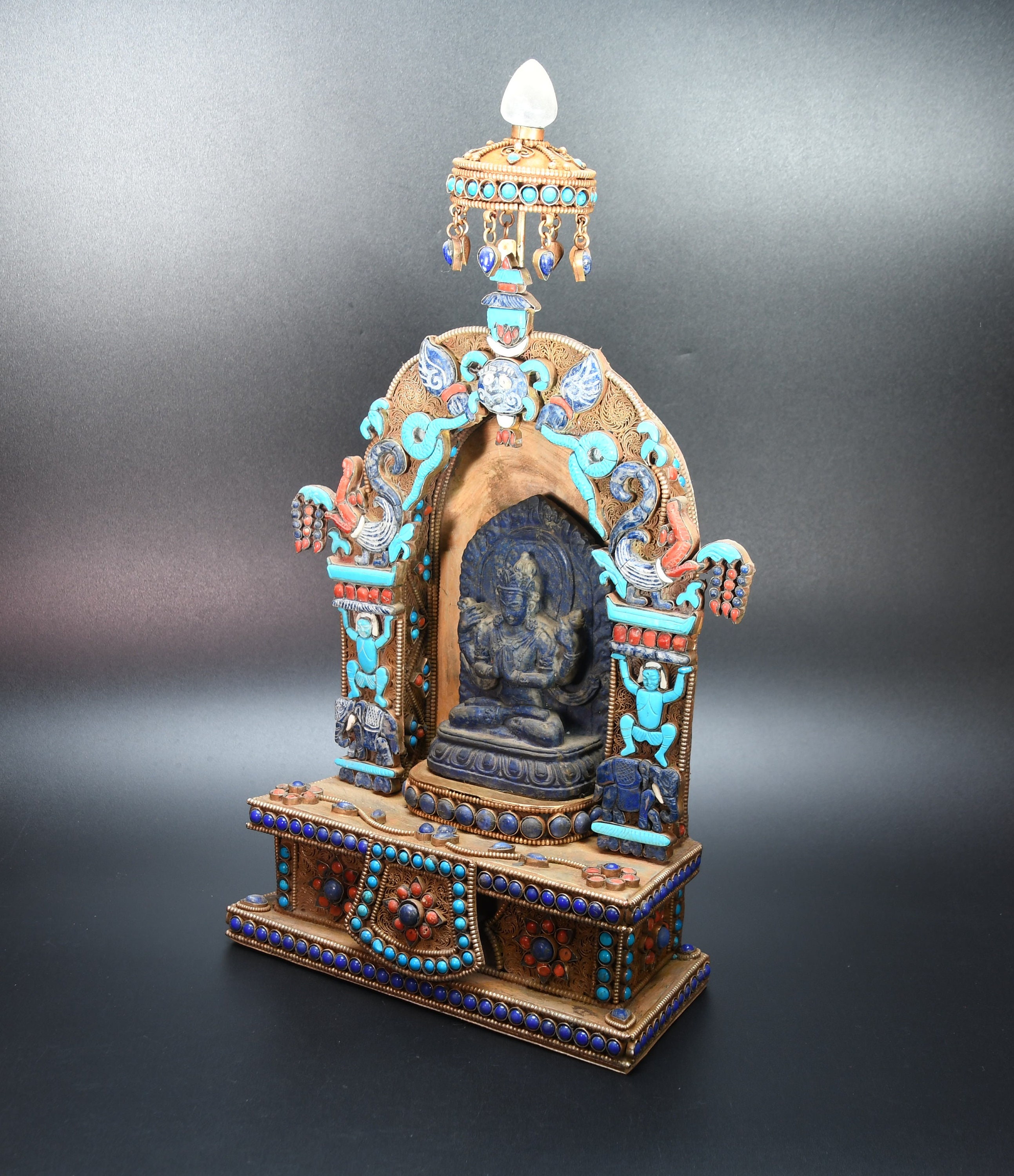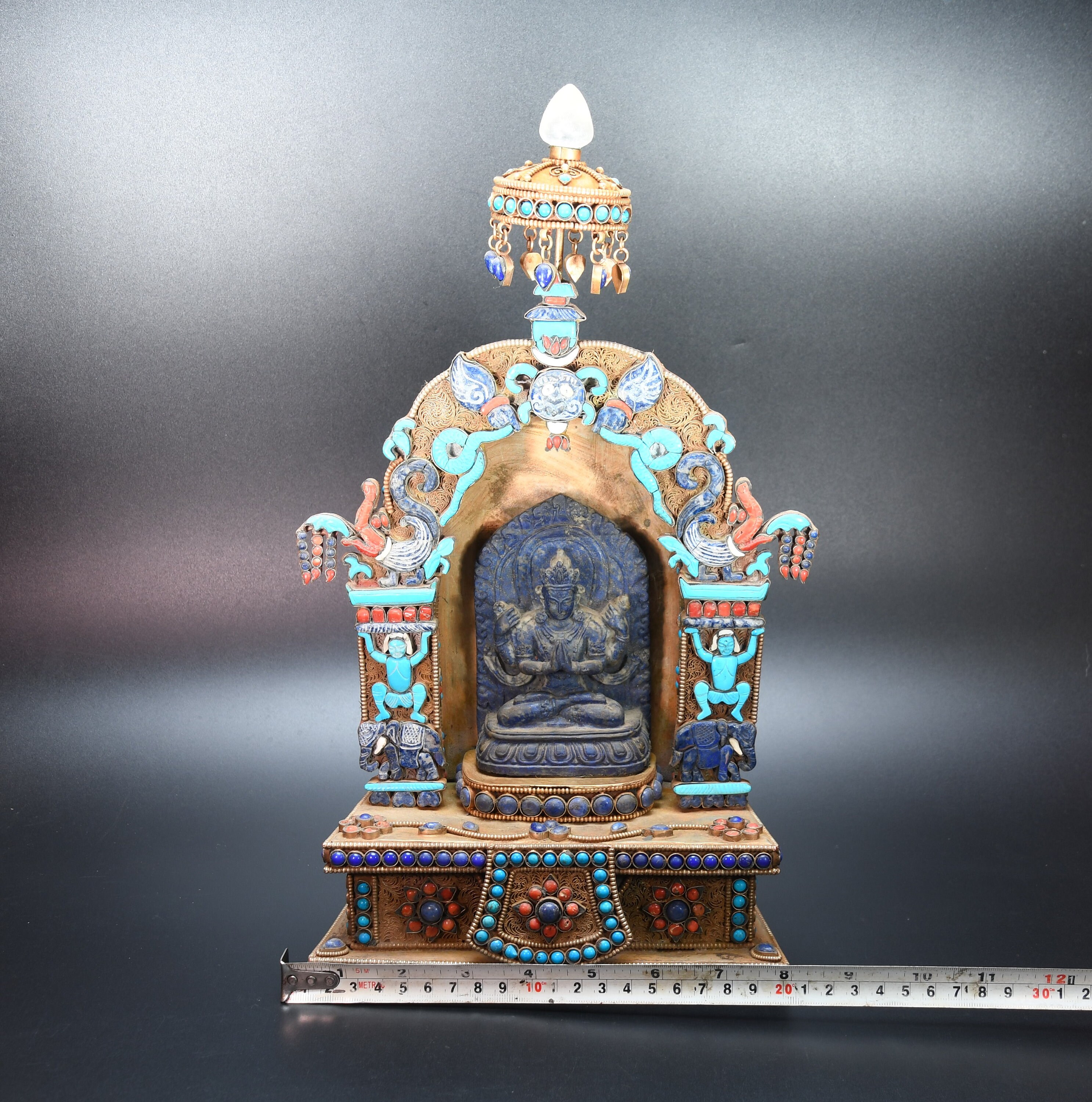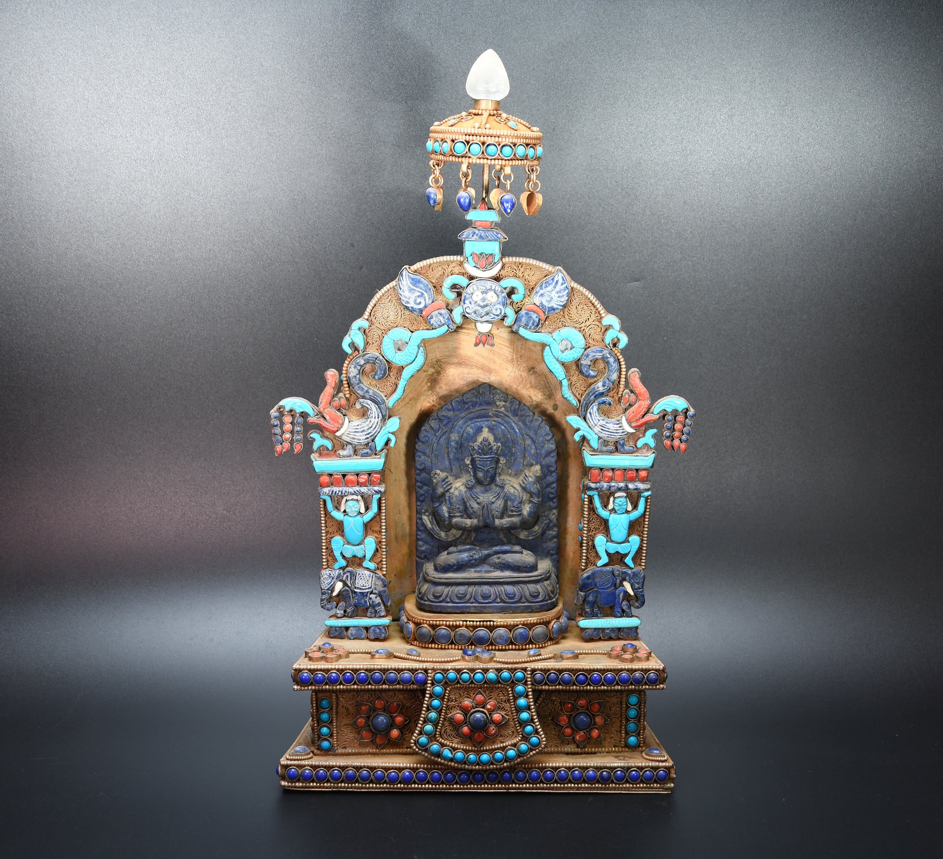 An absolutely astonishing one-of-a-kind Shakyamuni Buddha statue! We've never seen anything quite like it. Handmade in Nepal by a 4th and 5th generation crafting family, the statue is made of hand carved quartz crystal that is wrapped in bronze and then gold-plated. It is hand detailed and expertly carved by master craftsmen. This process takes considerable time and skill. The details are truly incredible, including pieces of hand inlaid antique coral and intricately etched designs.
