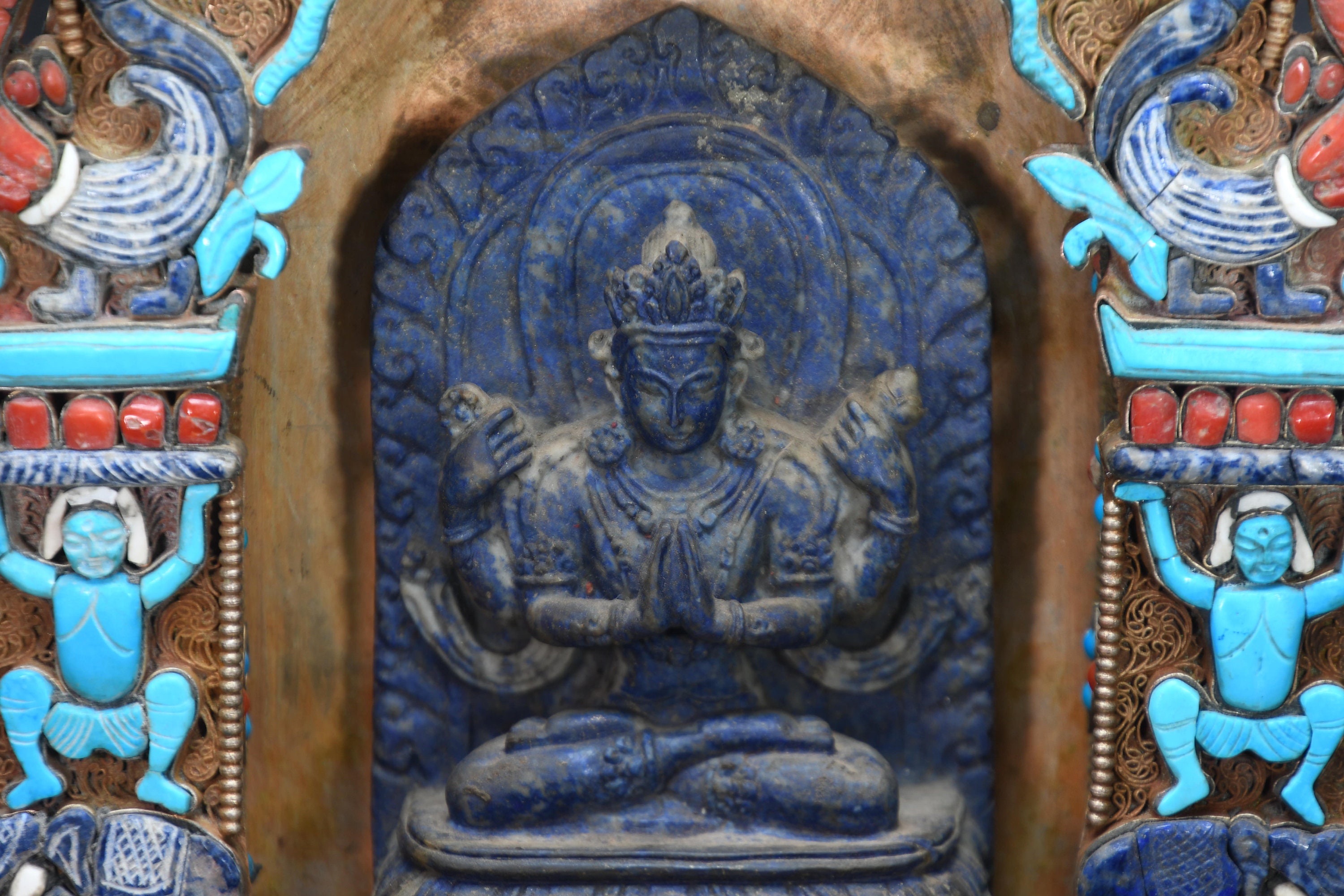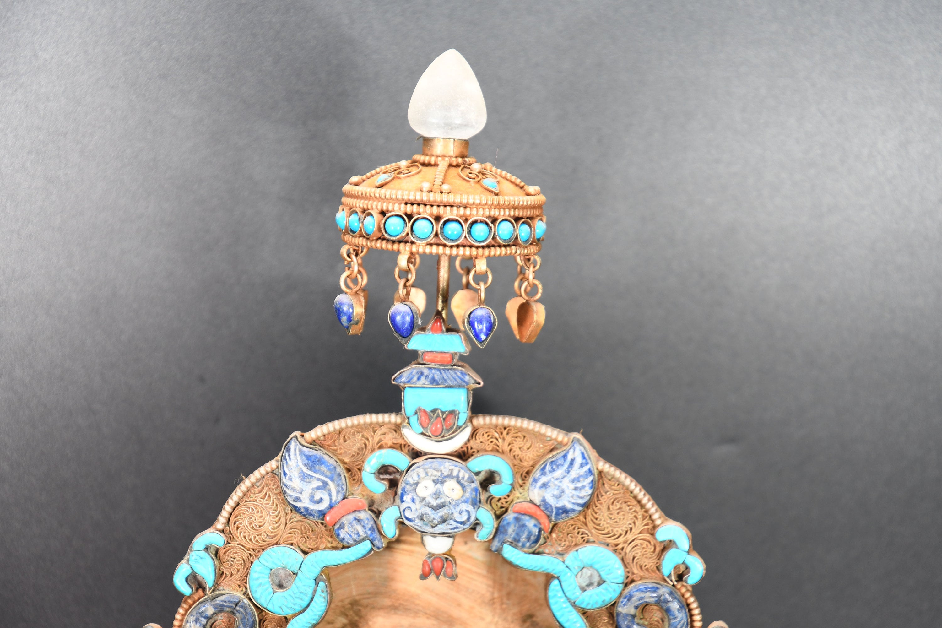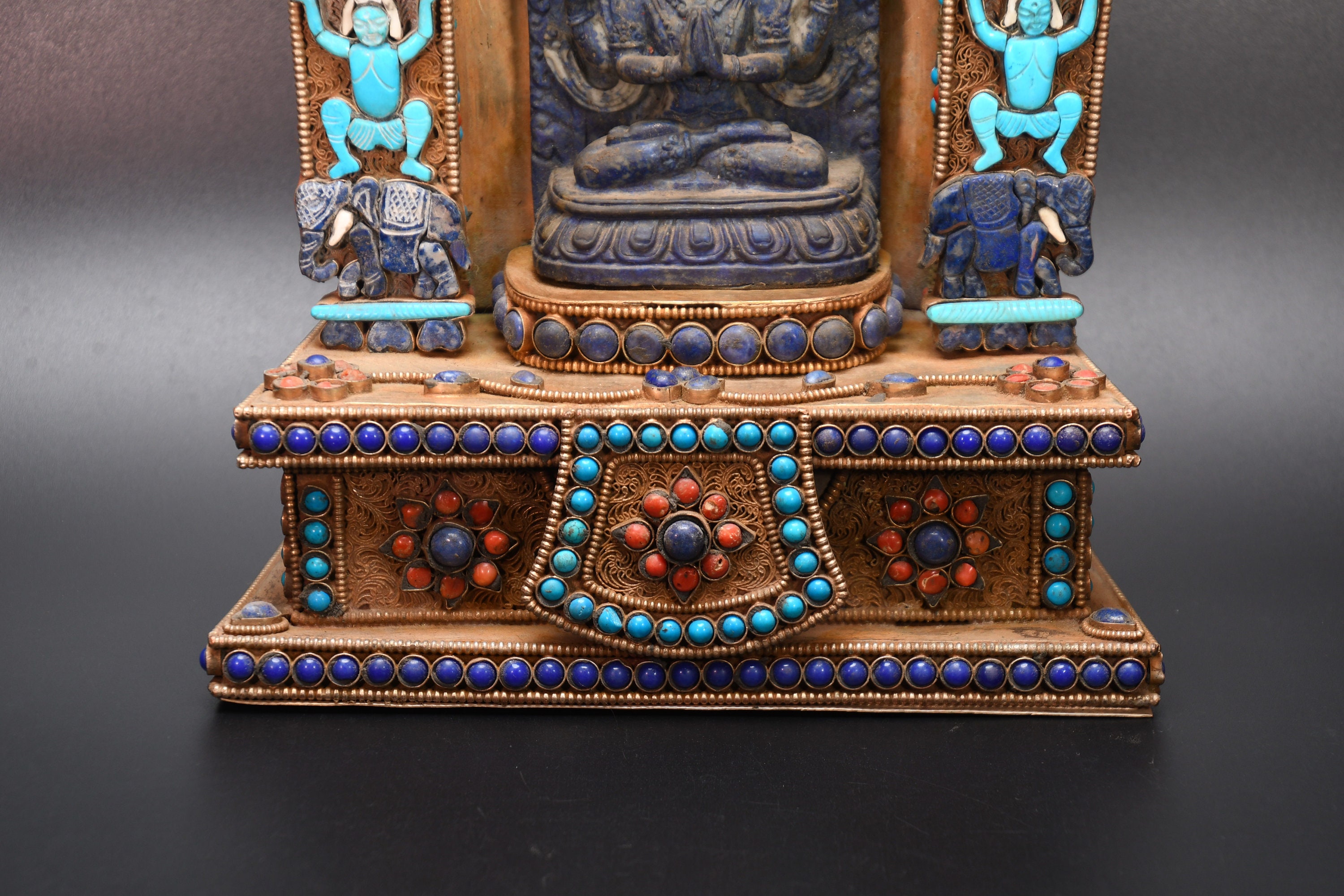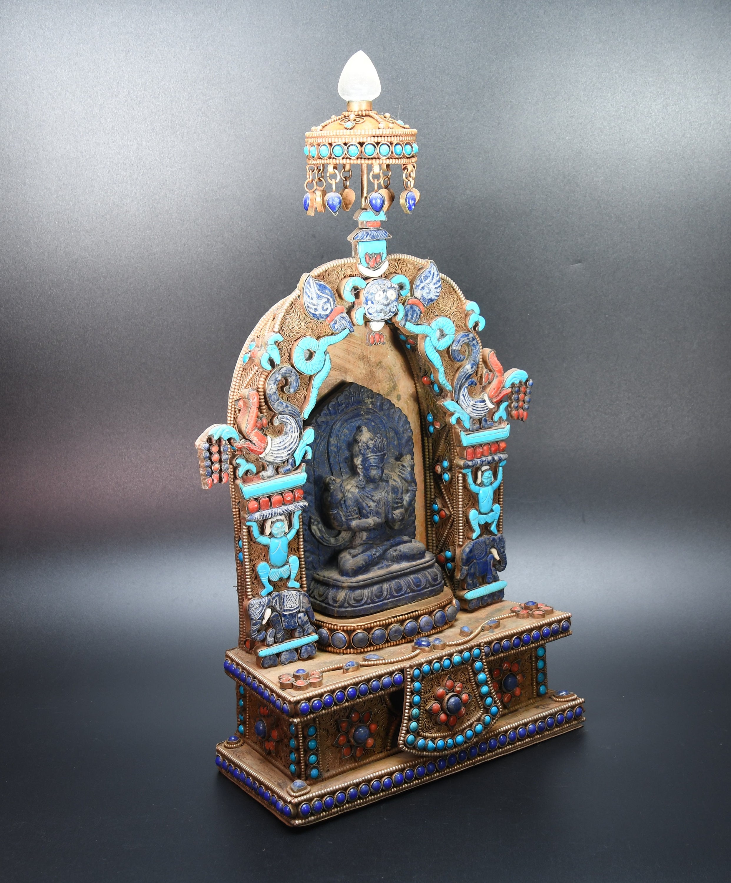 An absolutely astonishing one-of-a-kind Shakyamuni Buddha statue! We've never seen anything quite like it. Handmade in Nepal by a 4th and 5th generation crafting family, the statue is made of hand carved quartz crystal that is wrapped in bronze and then gold-plated. It is hand detailed and expertly carved by master craftsmen. This process takes considerable time and skill. The details are truly incredible, including pieces of hand inlaid antique coral and intricately etched designs.