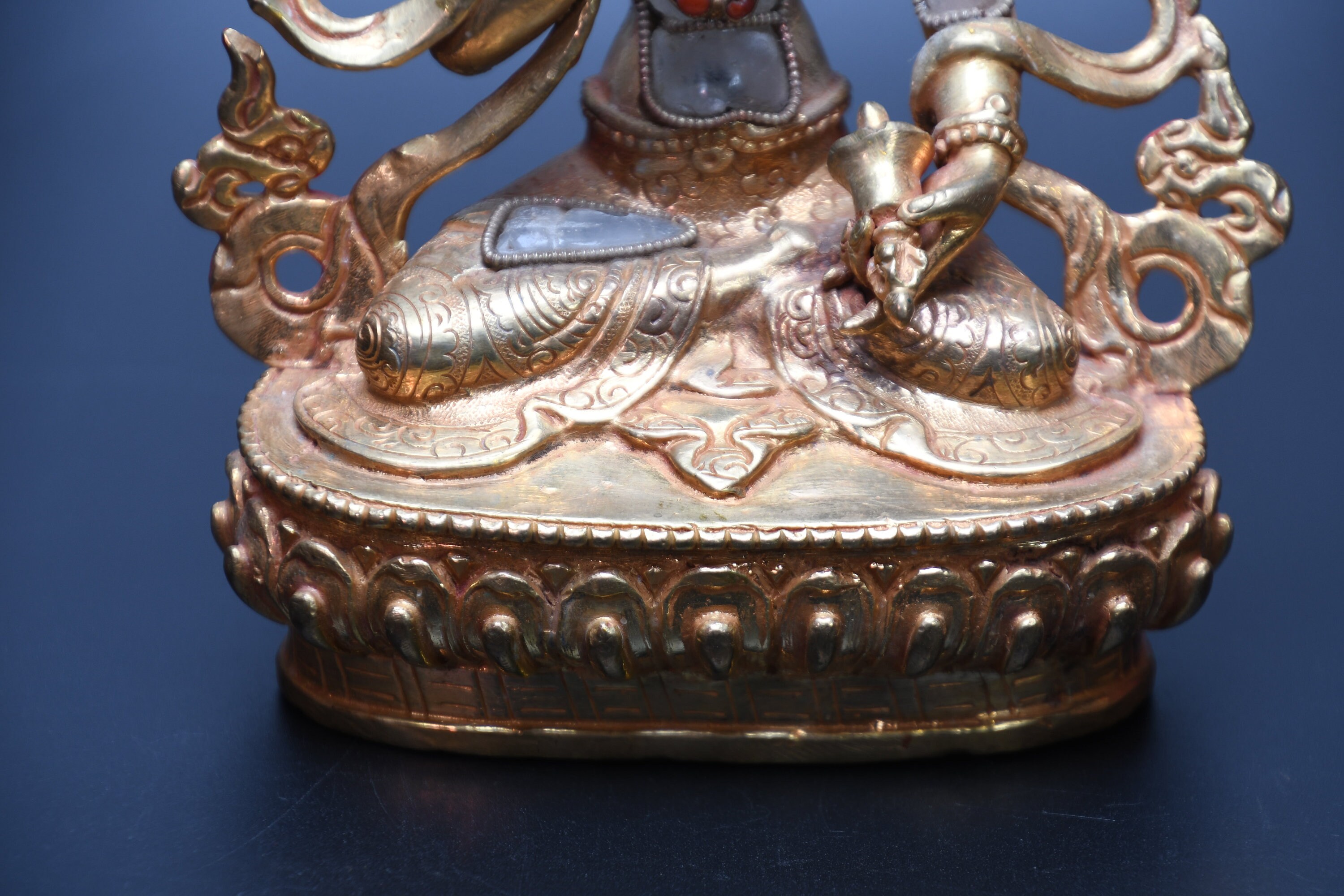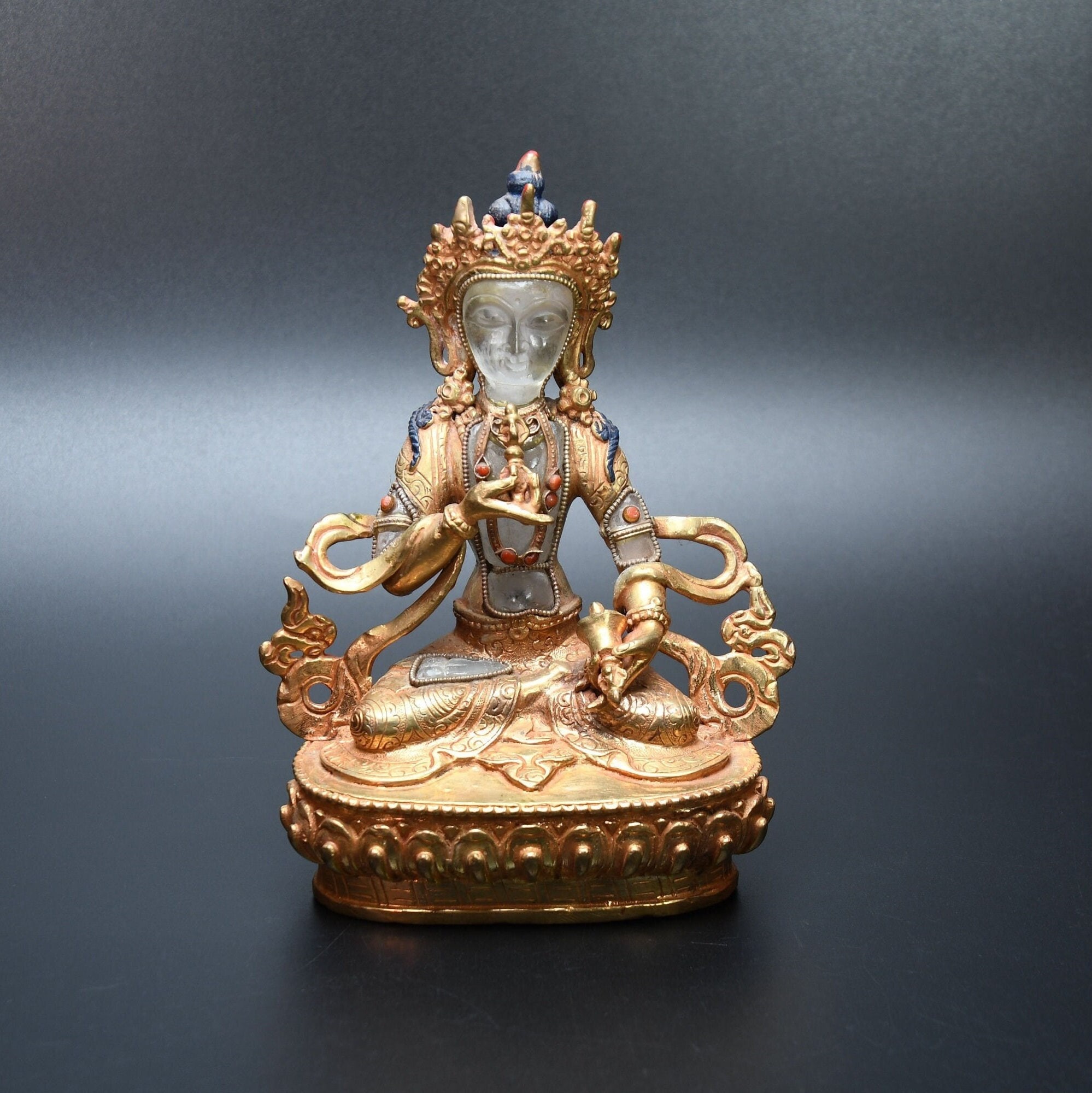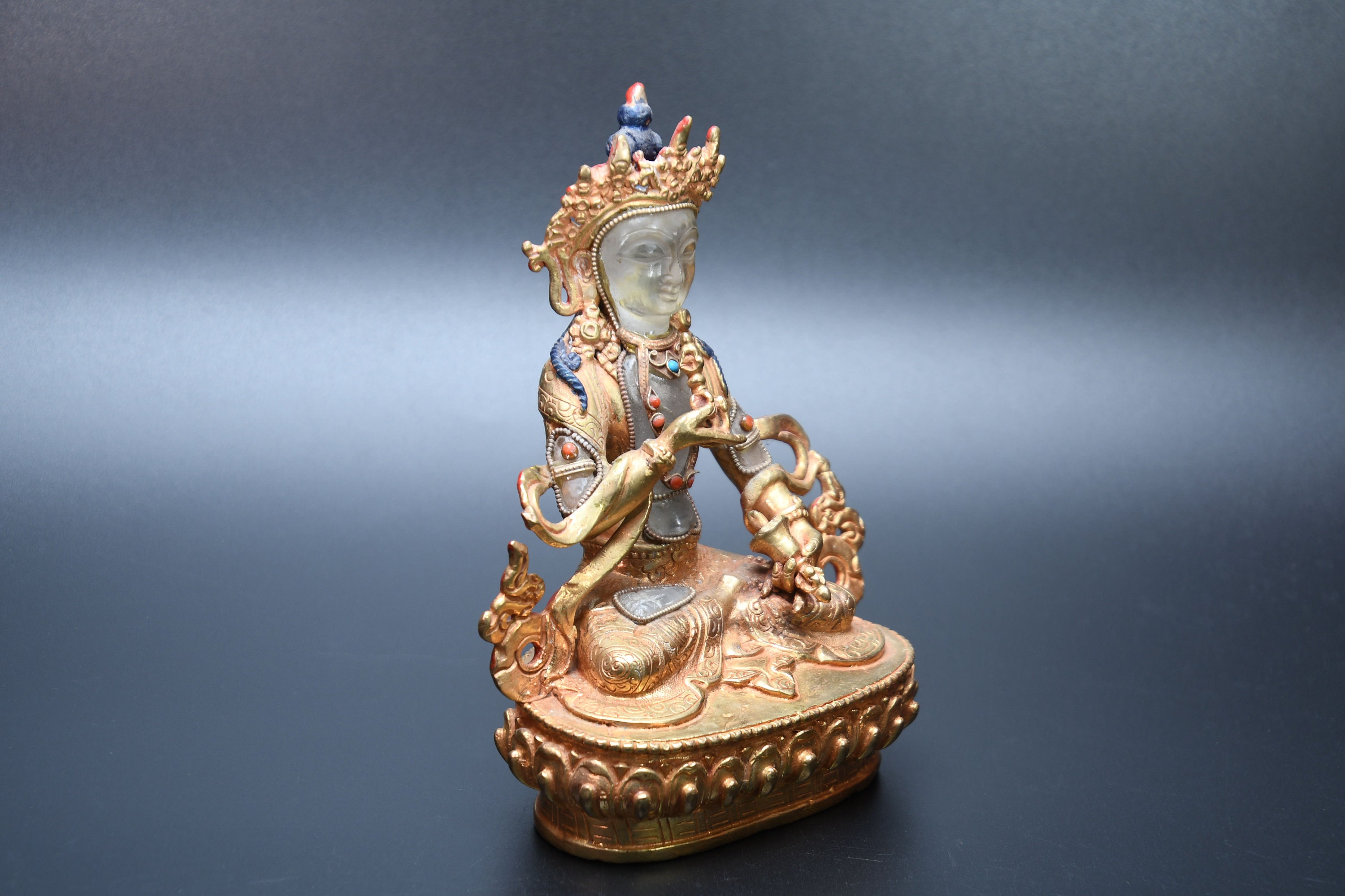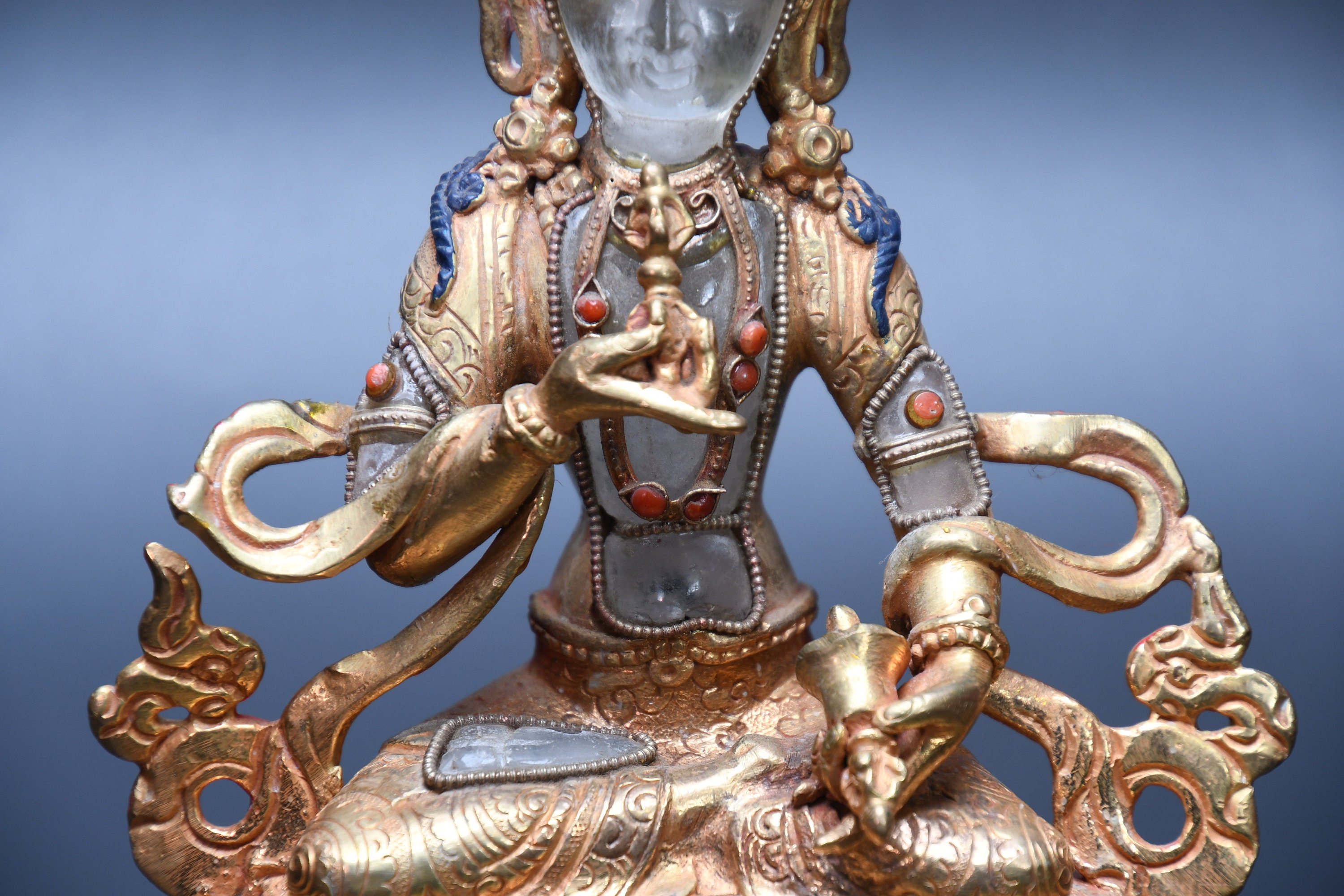We've never seen anything quite like it. Handmade in Nepal by a 4th and 5th generation crafting family, the statue is made of hand carved quartz crystal that is wrapped in bronze and then gold-plated. It is hand detailed and expertly carved by master craftsmen. This process takes considerable time and skill. The details are truly incredible, including pieces of hand inlaid antique coral and intricately etched designs.