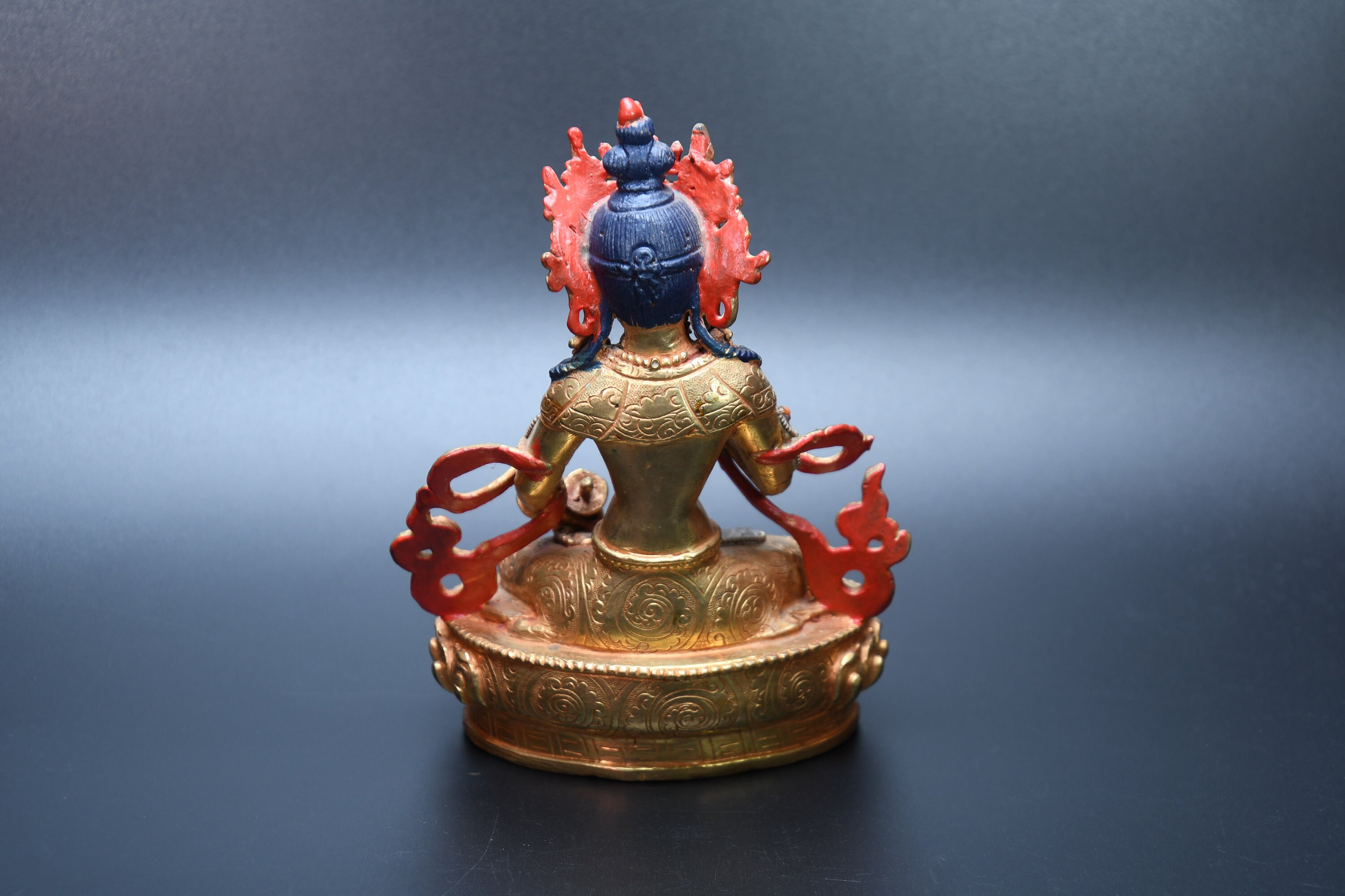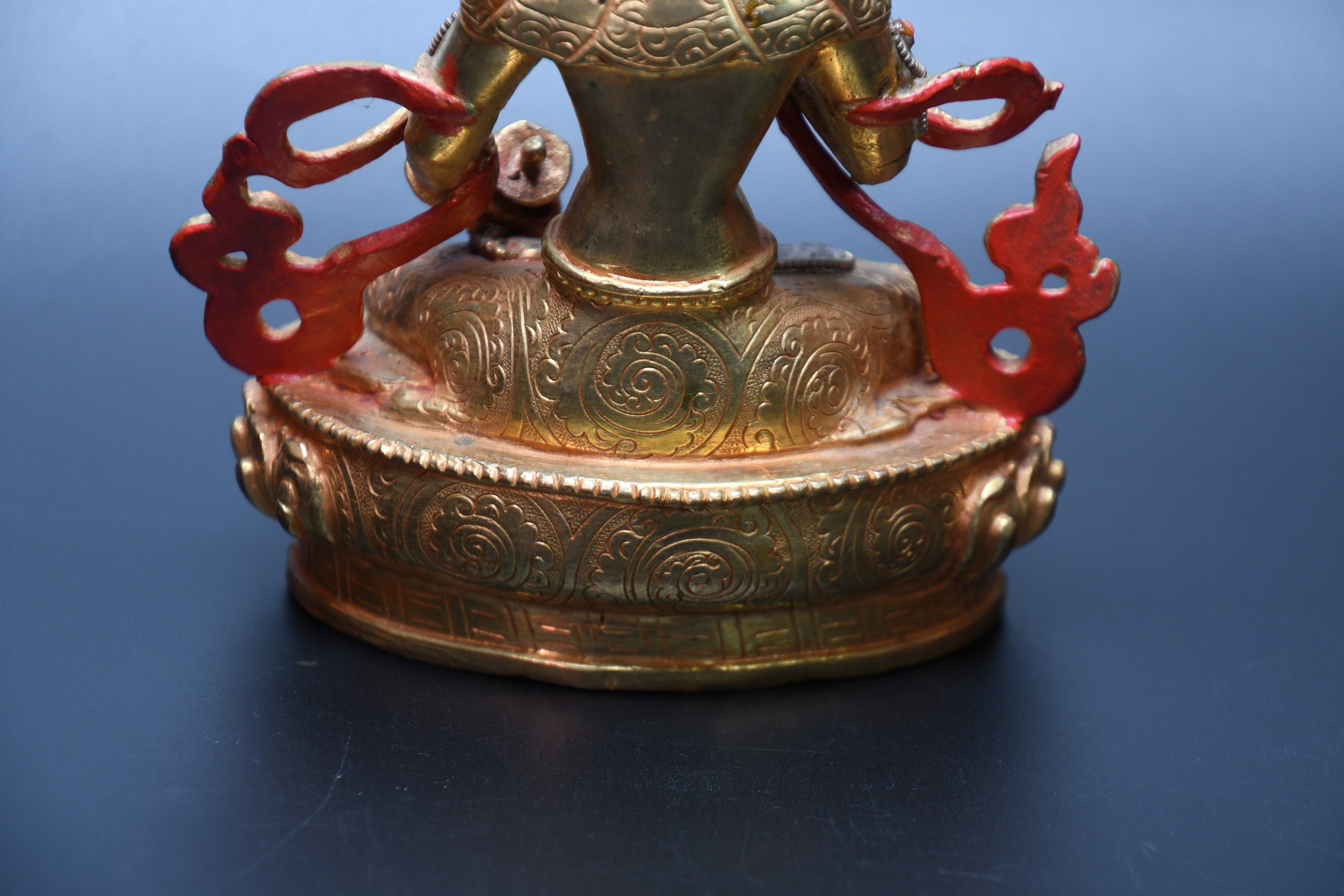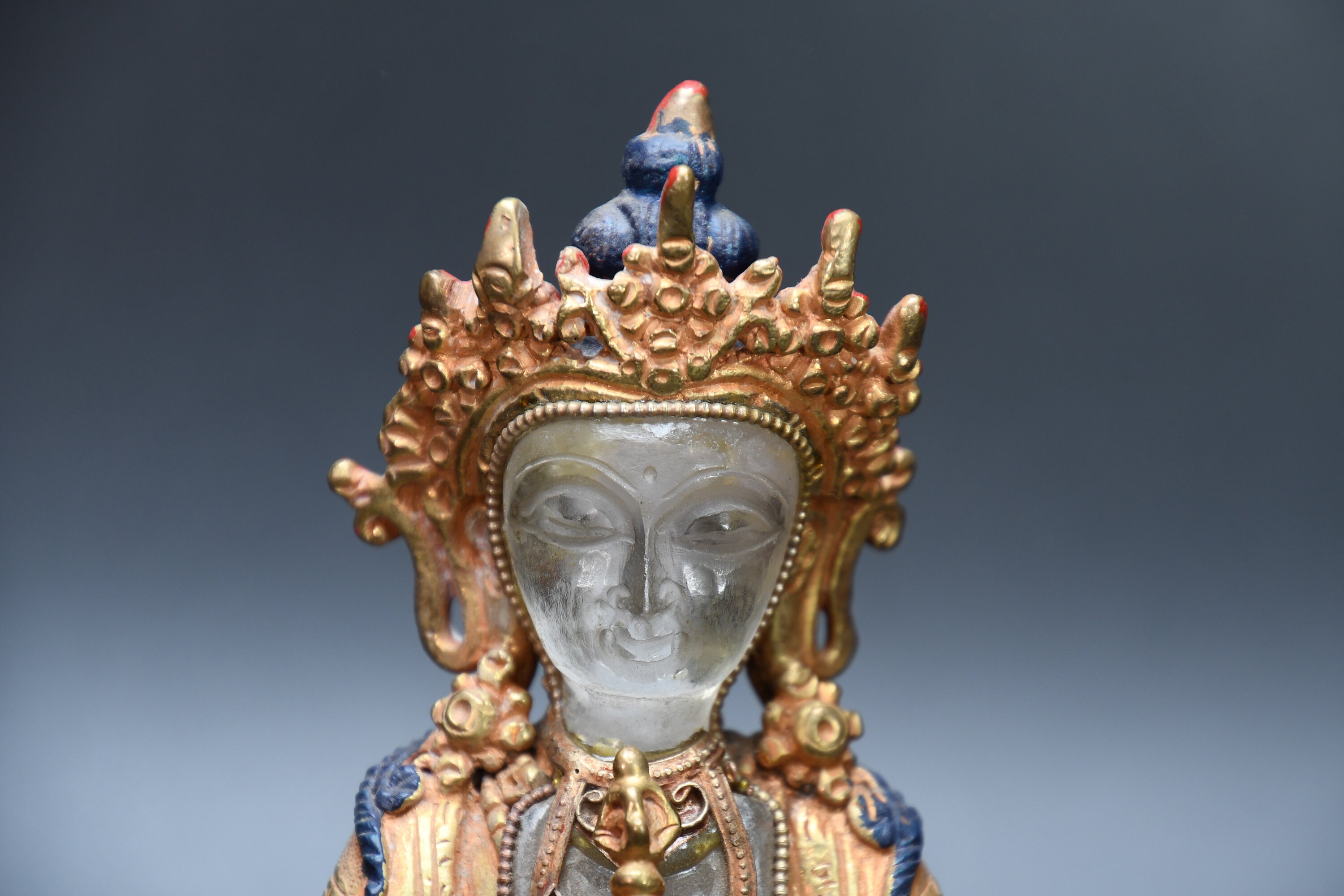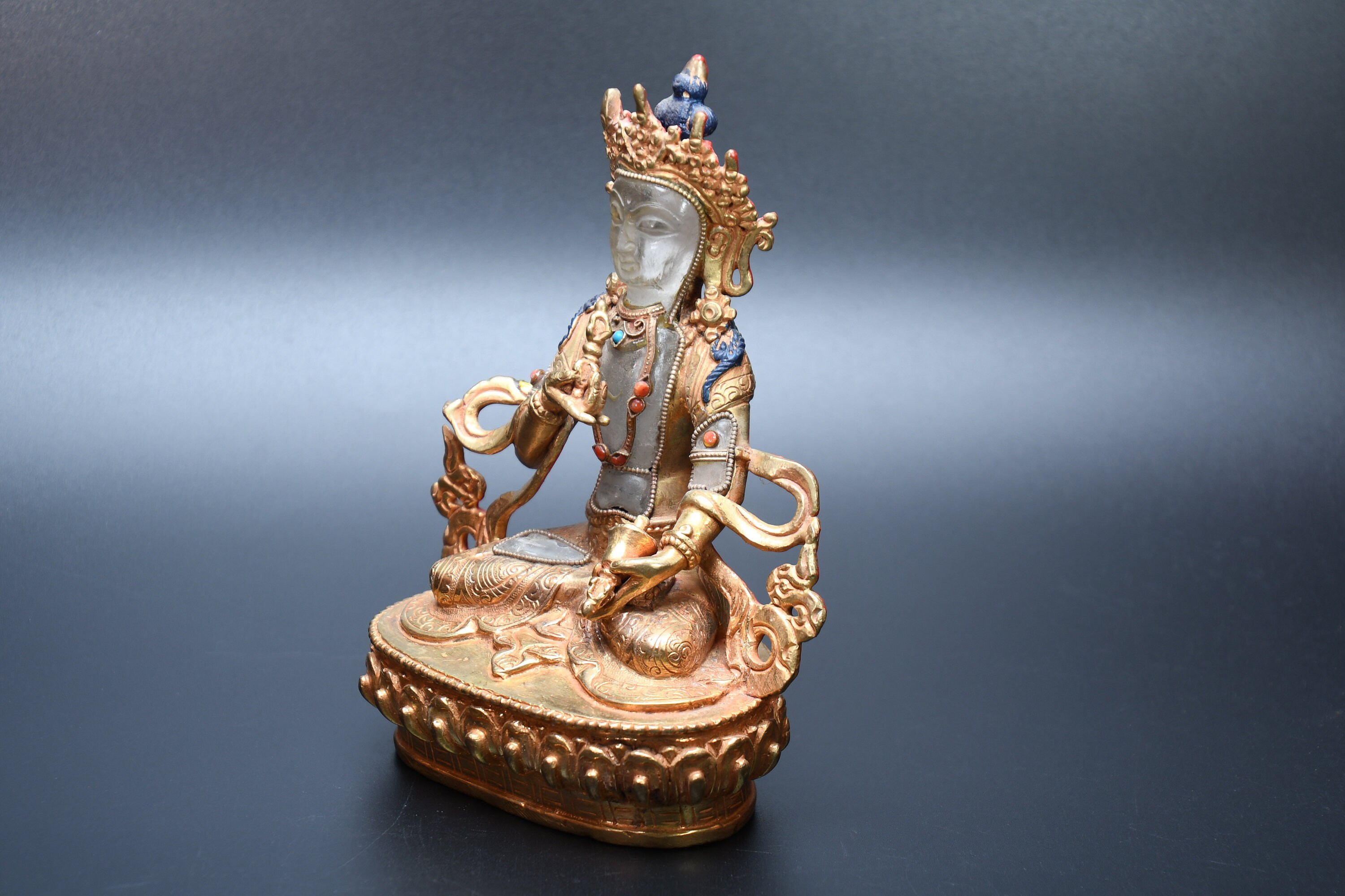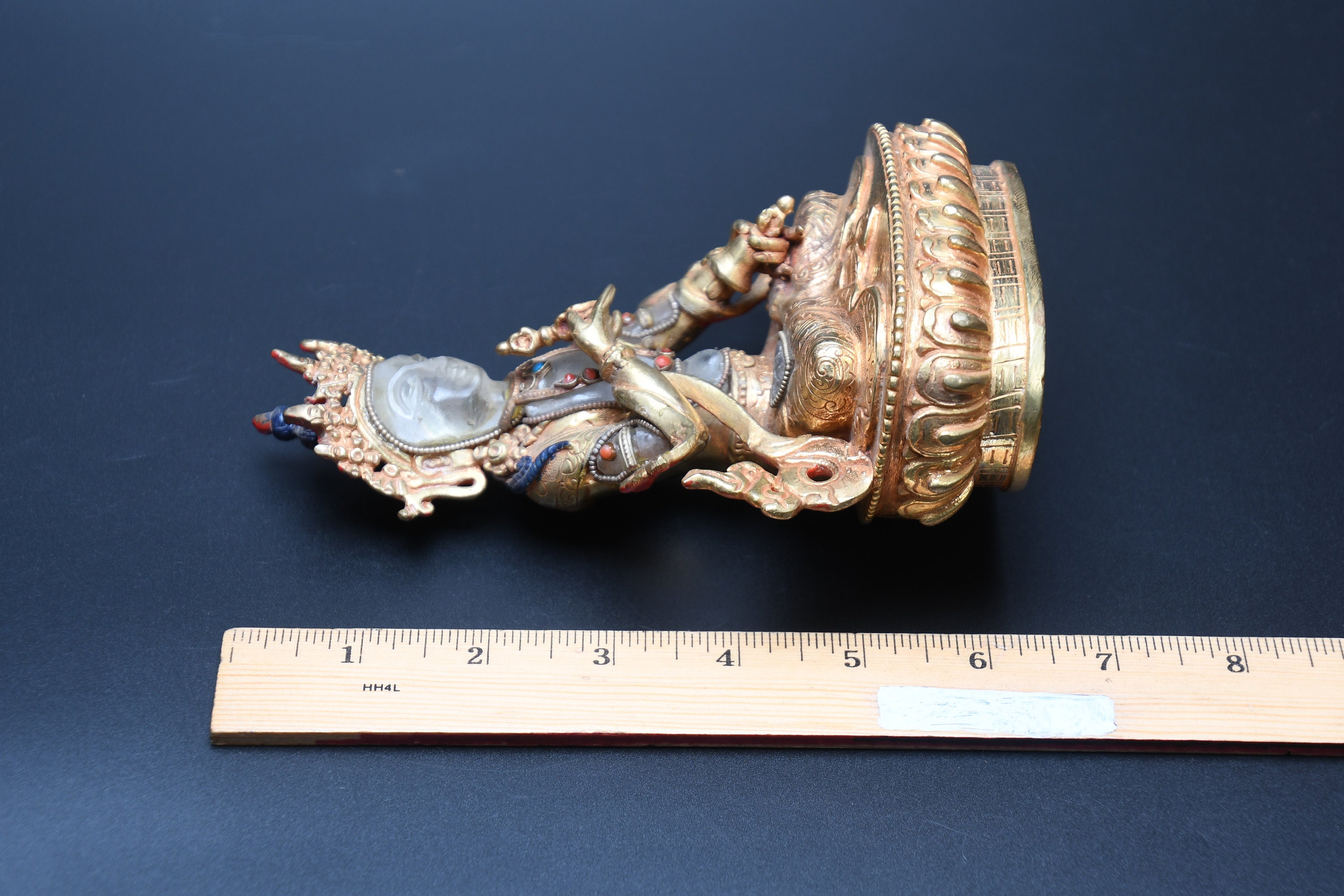 We've never seen anything quite like it. Handmade in Nepal by a 4th and 5th generation crafting family, the statue is made of hand carved quartz crystal that is wrapped in bronze and then gold-plated. It is hand detailed and expertly carved by master craftsmen. This process takes considerable time and skill. The details are truly incredible, including pieces of hand inlaid antique coral and intricately etched designs.
